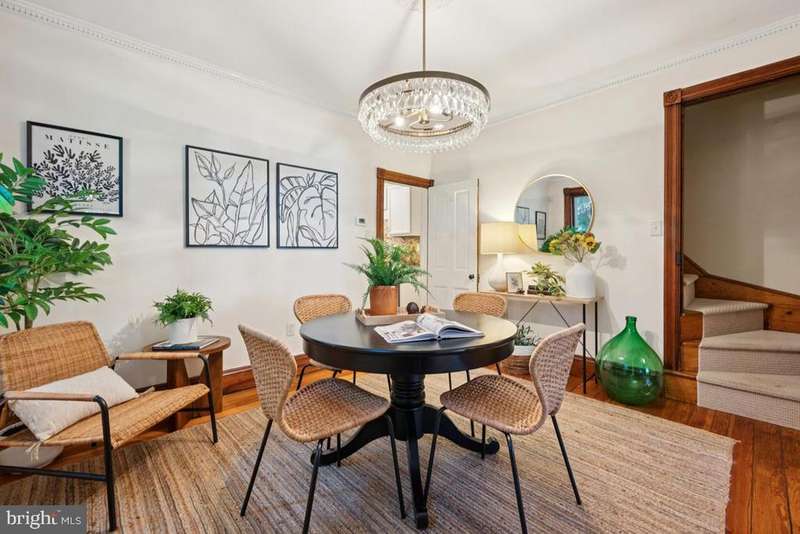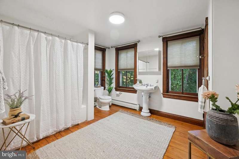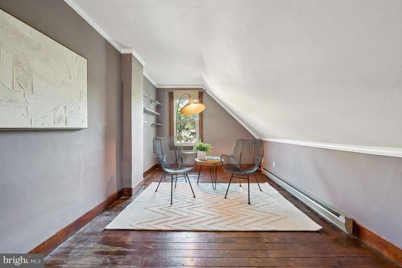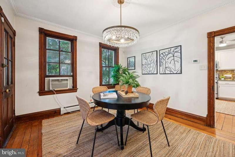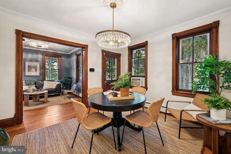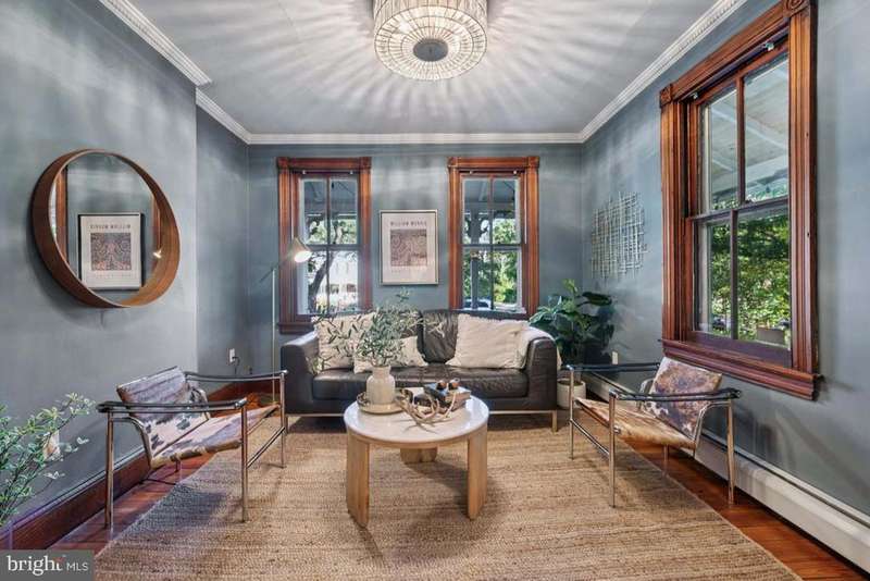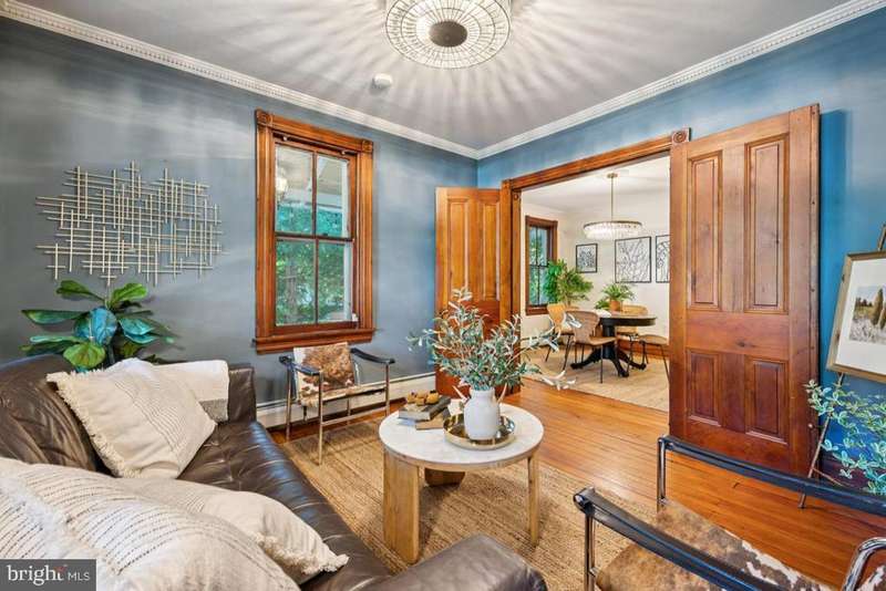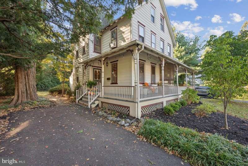 Experience the best of in-town living with this charming twin home offering the perfect blend of historic character and modern convenience. This enchanting property is nestled on a beloved tree lined street, up the block from beloved Zelley Park and a short walk to the library, REC center and shops on Main Street. The wrap around covered front porch is a welcoming and versatile extension of the home. Inside you will be pleased to find everything is move-in condition. The first floor offers a cozy living room and ample dining room each with simple yet elegant new light fixtures. A cheerful, updated kitchen with modern comforts and new LED recessed lighting is adjacent to the back entry with mudroom, two closets and powder room all freshly painted. Period details including exposed brick and intricate moldings blend seamlessly with the updated aesthetic in this home. The second floor offers two bedrooms and an expanded full bathroom, freshly painted with closet, dressing space and new LED light fixture. The third floor hosts a wealth of space to suit a variety of needs, bedroom with modern built-in closet nook, sitting room, work space, exercise room or all of the above! The full basement with laundry is very comfortable and can be used for storage, workshop or play area. The gracious back yard will display an array of colors throughout the year thanks to mature trees and flowering shrubs. A newer shed with covered lounge area in the far corner of the yard offers more storage too...a serene retreat! Additional highlights include gas heat, rich hardwoord floors and updated electric. This 3 bedroom, 1.5 bathroom home is more than move-in friendly it is move-in and feel great in a fantastic location just a short walk to town, parks and Moorestown's fine schools.