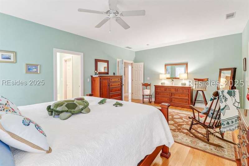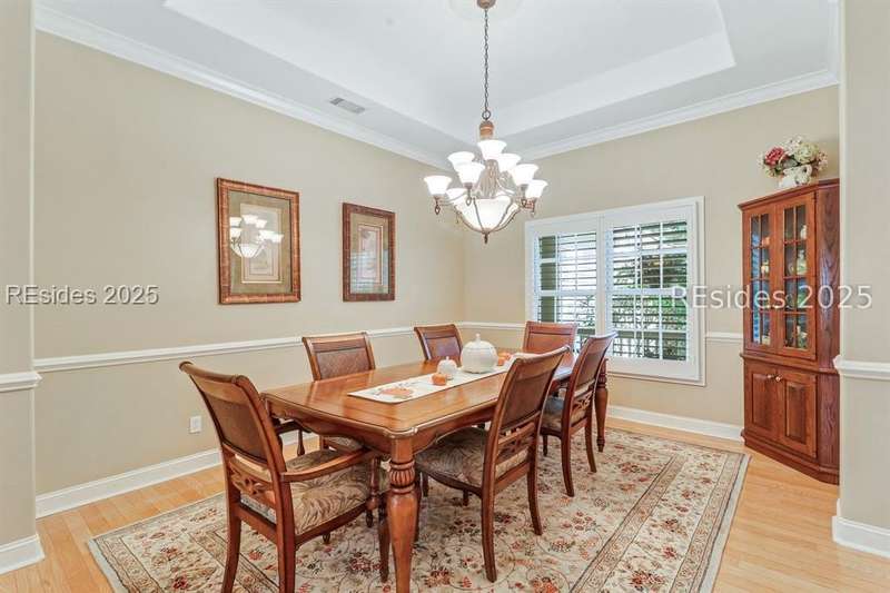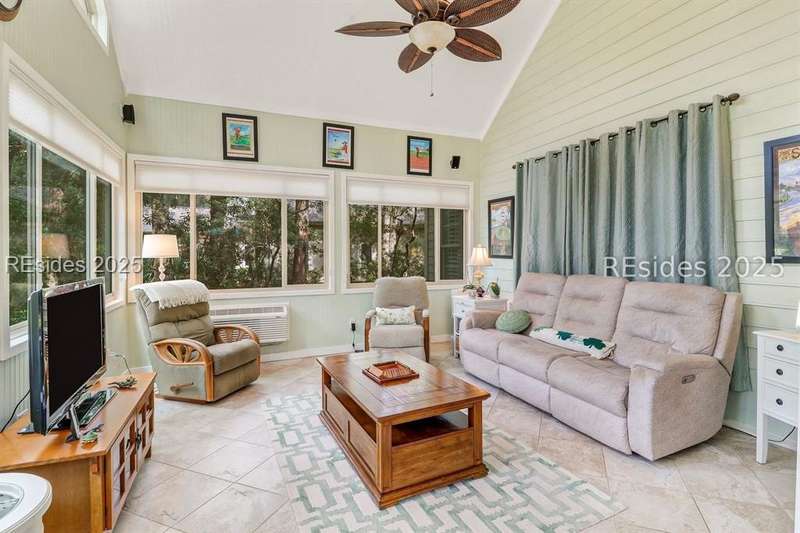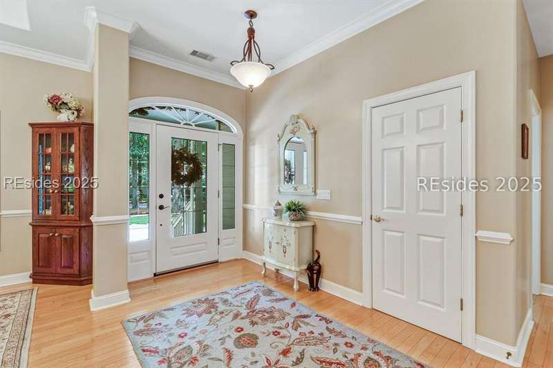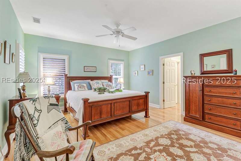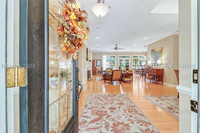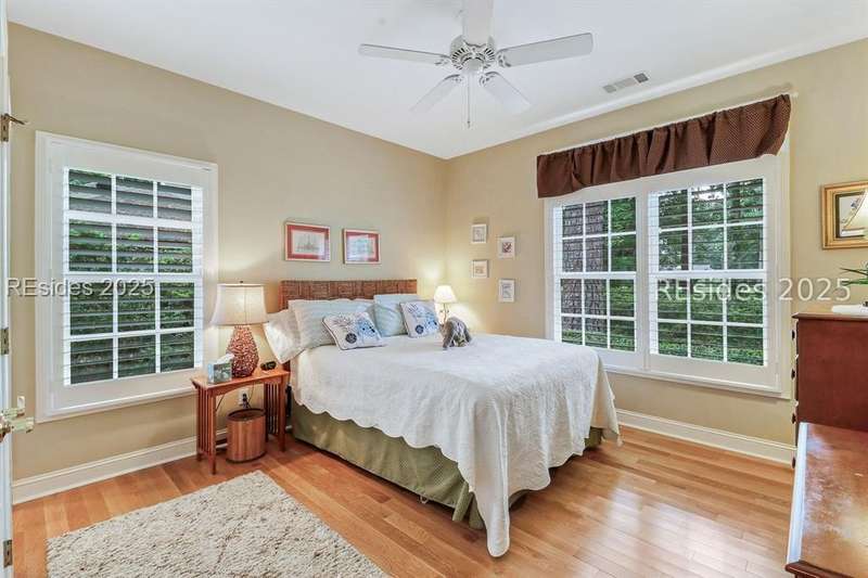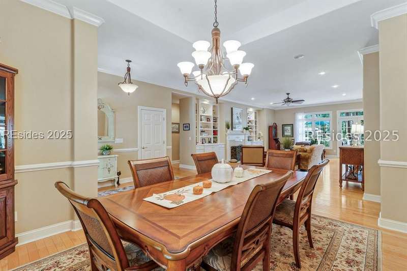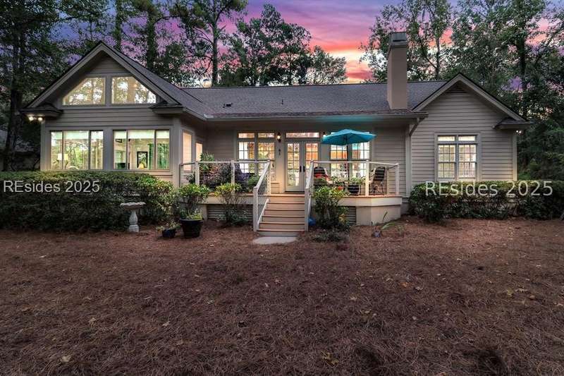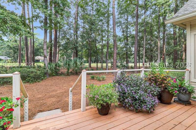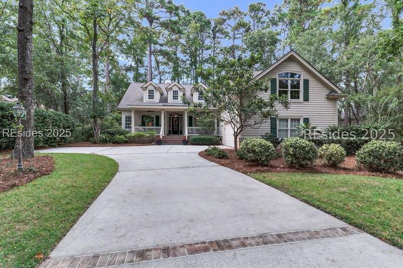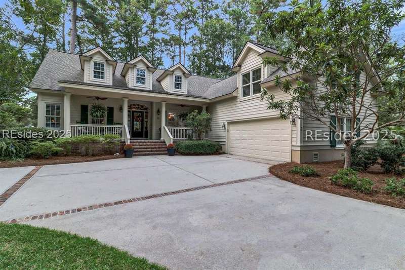 Charming, spacious, superbly maintained/updated, custom built residence with sweeping golf views (#3 South Course) on quiet cul de sac street in private, amenity rich Moss Creek. Interior features include volume/vaulted/tray, smooth ceilings, wood flooring, built-ins/millwork/cabinetry by master craftsmen, bullnose corners, walls of windows (including transom windows) to view, quartz counters, high-end stainless-steel appliances, max cabinet/counter space, plantation shutters, marble hearth/surround gas fireplace, recessed/pendant/under cabinet lighting, raised vanities, etc. Very livable floor plan offers Kitchen (w/4 seat breakfast bar & built-in work station) open to Great room, large Carolina room, formal/casual Dining, oversize Bonus Room, Powder room, ample Laundry room, walk-in Pantry, excellent BR separation including well-appointed primary suite (dual walk-in closets), 2 guest BRs and Bath + must have 2.5+ car garage with workshop & storage areas. Exterior features include attractive/durable Hardie board siding, brick steps to covered front porch, dormer windows, expansive rear Trex deck with cabled railings, carriage lighting, energy savings spray foam insulation under 1st floor, specimen trees, mature plantings/lawn & irrigation system, etc. All with excellent curb appeal & preferred, central locale offering easy access to gated entry and all community amenities.
