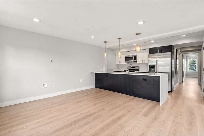 Rare opportunity in the Jeffries Point neighborhood of East Boston with skyline views of the city! This spacious 1,090 sq ft, 2 bed, 2 bath penthouse condo has an existing private balcony and exclusive rights to construct a private roof deck. The south-facing living room and kitchen receive lots of morning and afternoon sun from the large windows and skylight and has an open concept layout that is great for lounging and entertaining guests. Kitchen includes pendant lighting, gas cooking, additional stainless steel appliances and plentiful quartz counter space. Large walk-in closet in primary bedroom and ample storage. Central heat, A/C, in-unit washer and dryer. Unit also includes large private storage area in the basement. The building is well located: a 5 minute walk to Maverick Square and the Blue Line, with the airport, highway access, shops, parks, restaurants close by.
