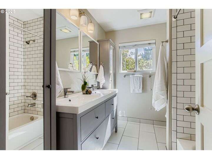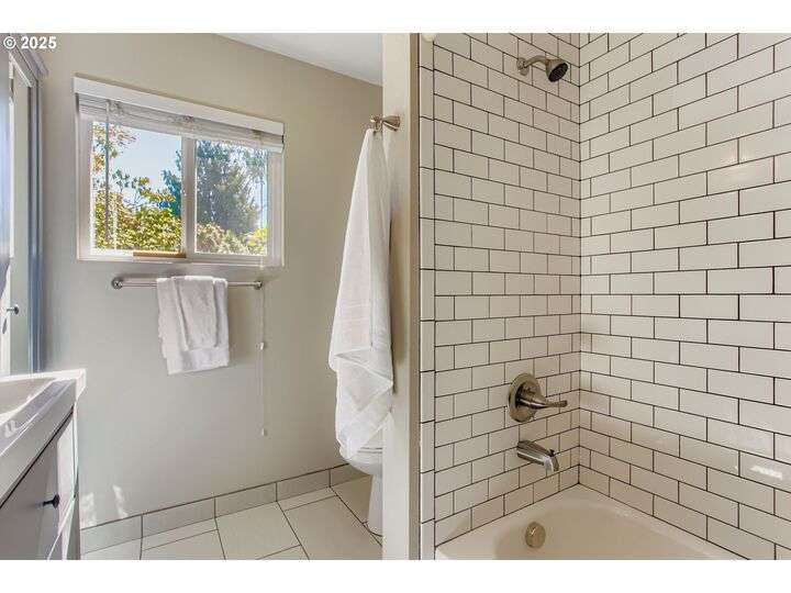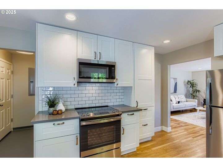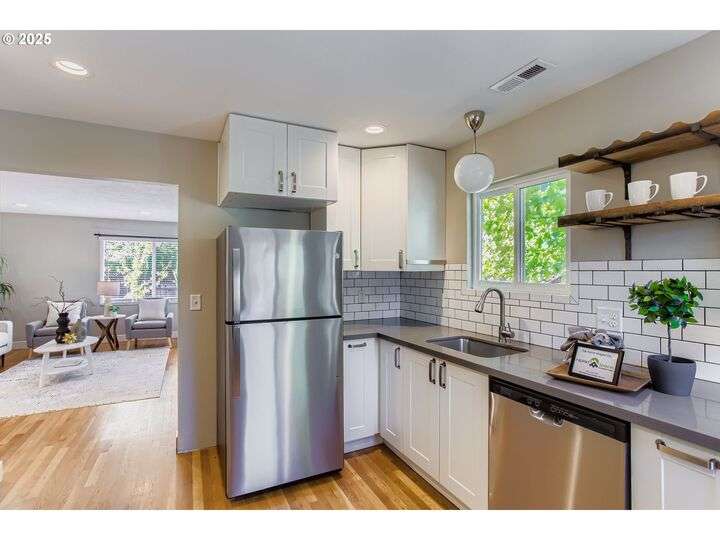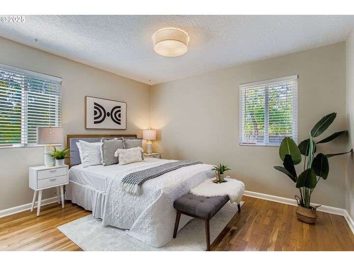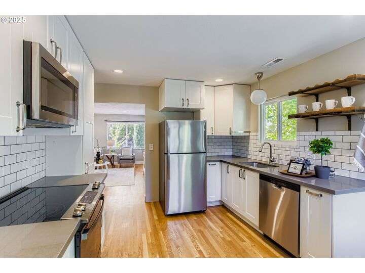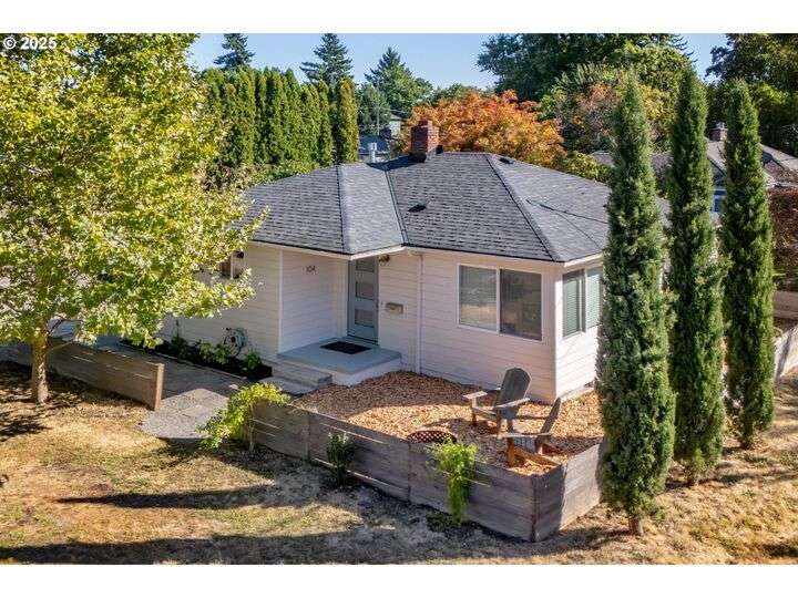 Fabulous Montavilla ranch-bungalow is totally move-in ready and full of high-quality finishes. Situated on a corner lot, it has a large fenced yard and an ultra-convenient attached garage. Instantly inviting, with fresh exterior paint and a welcoming front porch. Extremely livable spaces. Gleaming oak hardwood floors throughout. The sunny living room is spacious and can accommodate practically any furniture arrangement. Cooks will love the cheerful kitchen with quartz counters and newer cabinets. It also has a new range, subway tile, and custom open shelving. Here, the perfectly sized breakfast nook easily seats 4 or more and encourages guests to gather, and is an ideal spot for morning coffee/tea. Easy one-level living with two large bedrooms, each with hardwood floors and double closets. Fabulous bathroom with upgraded finishes, including subway tile shower surround, Excellent high-quality and very functional vanity and matching storage cabinets. Excellent layout with a separate utility room and mudroom right off the attached garage. This incredibly versatile space offers many options, studio, an ther finsihed room, or more. Imagine the possibilities here. Recent improvements shine with brand-new exterior paint plus all major systems and updates done within the last 9 years, including roof. Dream backyard, private and fully fenced, has southern exposure and is ready to grow just about everything. Raised bed offers an established spot for growing your herbs and vegetables. It's an oasis with mature rose bushes and delicious raspberries still producing! Capitalize on additional planting areas along the side yard and front as well as a dedicated off-street parking on the driveway. Easy access to freeways and Mt Tabor Park. Situated in Montavilla, the location is ideal- Just a 10-12 minute walk to enjoying restaurants, specialty grocery, the farmers' market, coffee, theater, and much more. [Home Energy Score = 5. HES Report at https://rpt.greenbuildingregistry.com/hes/OR10241368]