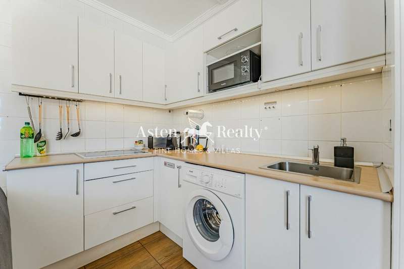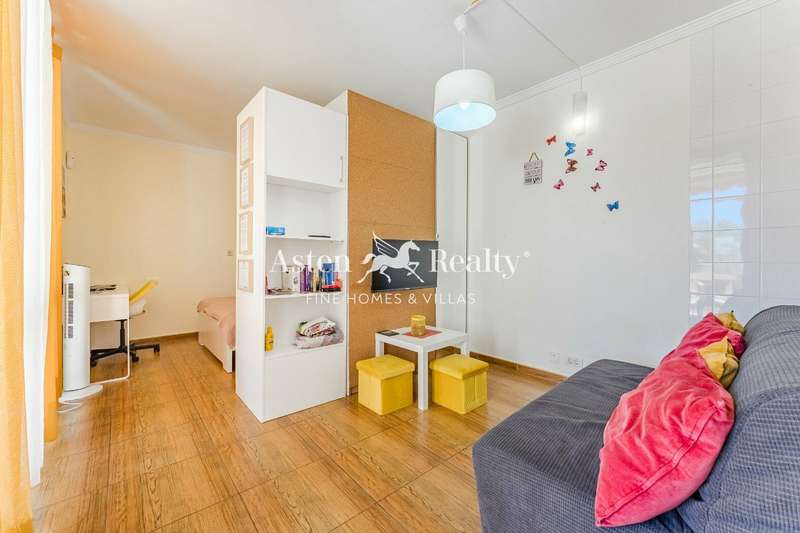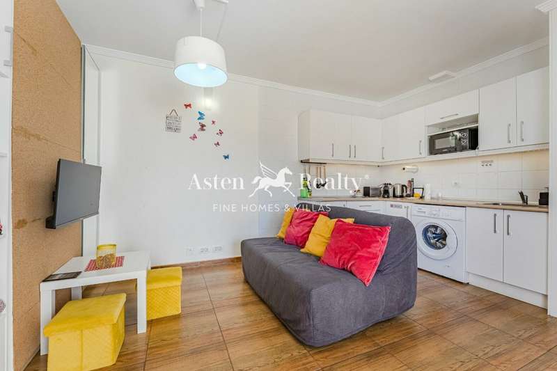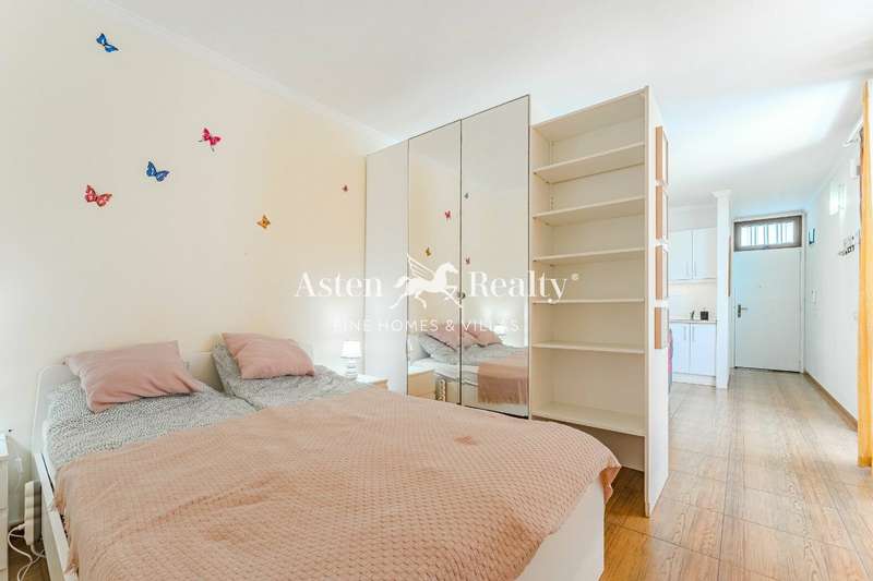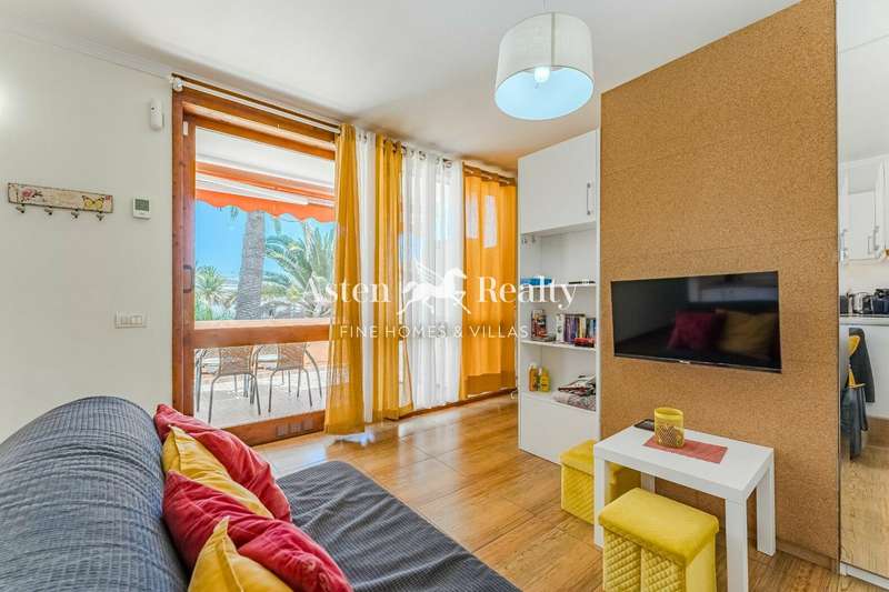 The property features a studio-style layout: living room with integrated sleeping area separated by a wardrobe, equipped kitchen, and bathroom with shower. Thanks to its orientation and high-quality construction, air conditioning is not required, significantly reducing maintenance costs.