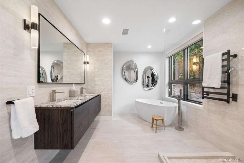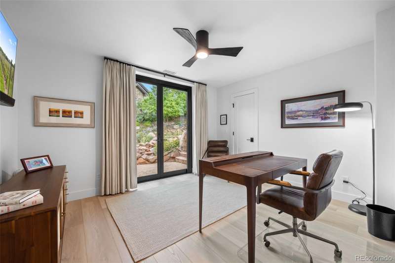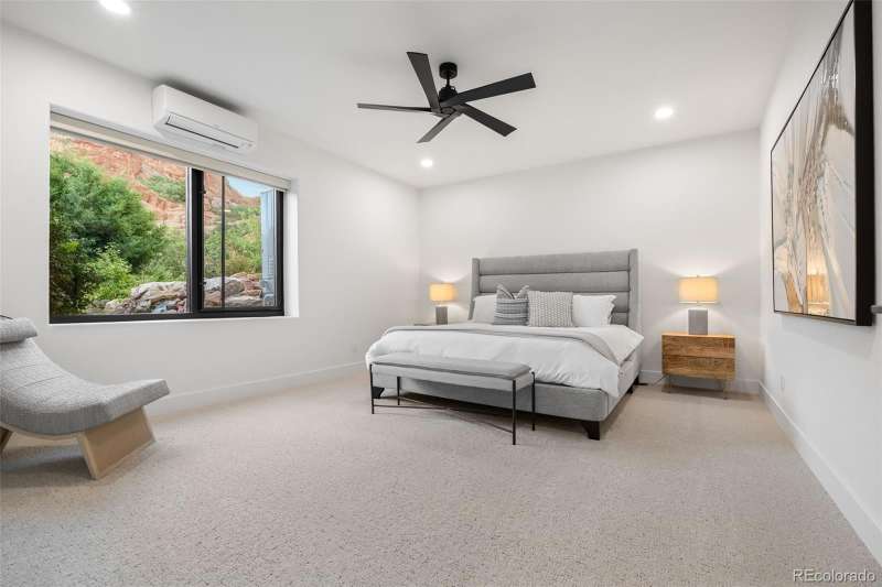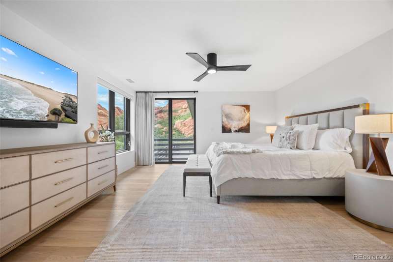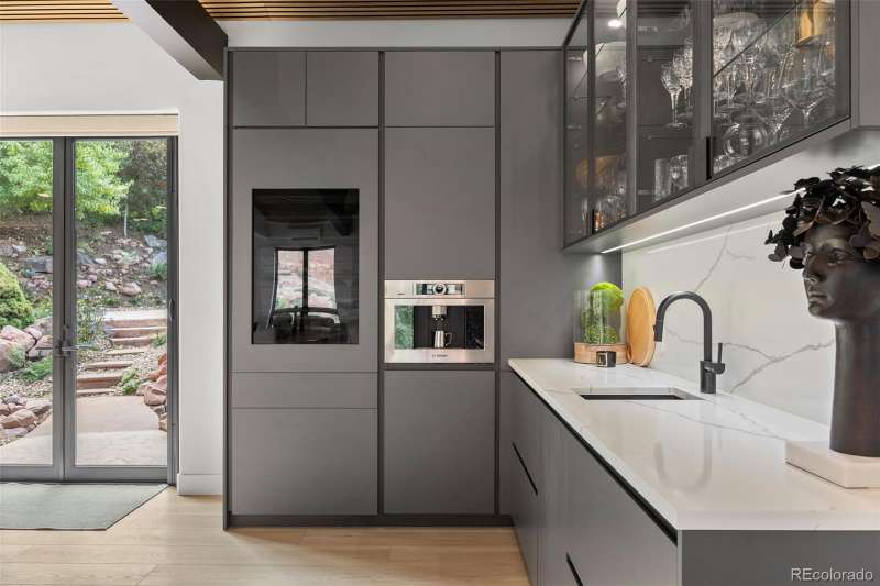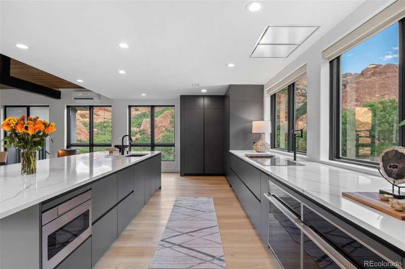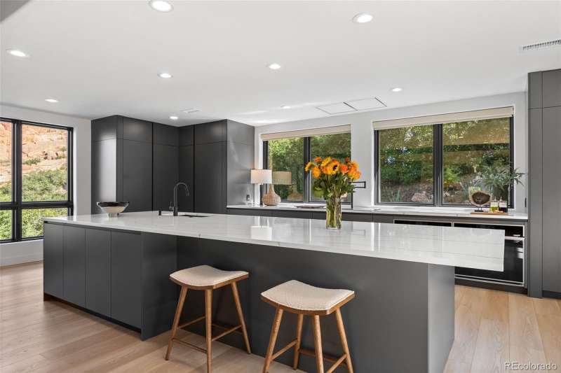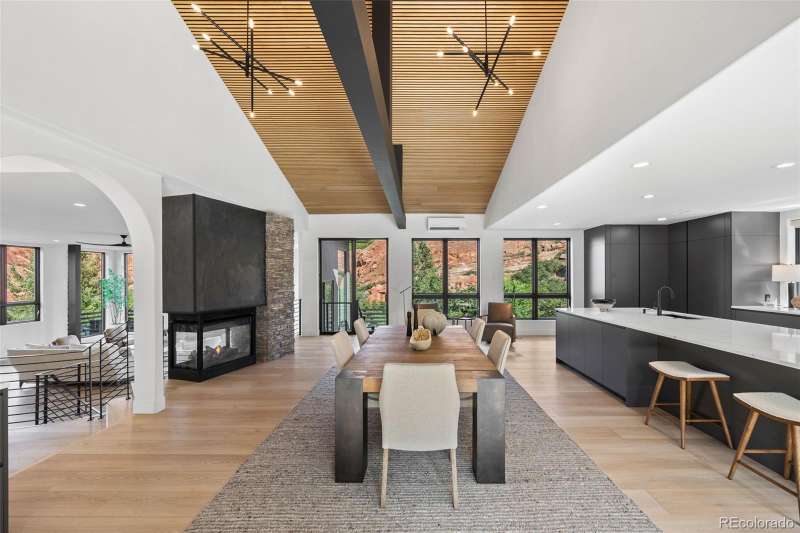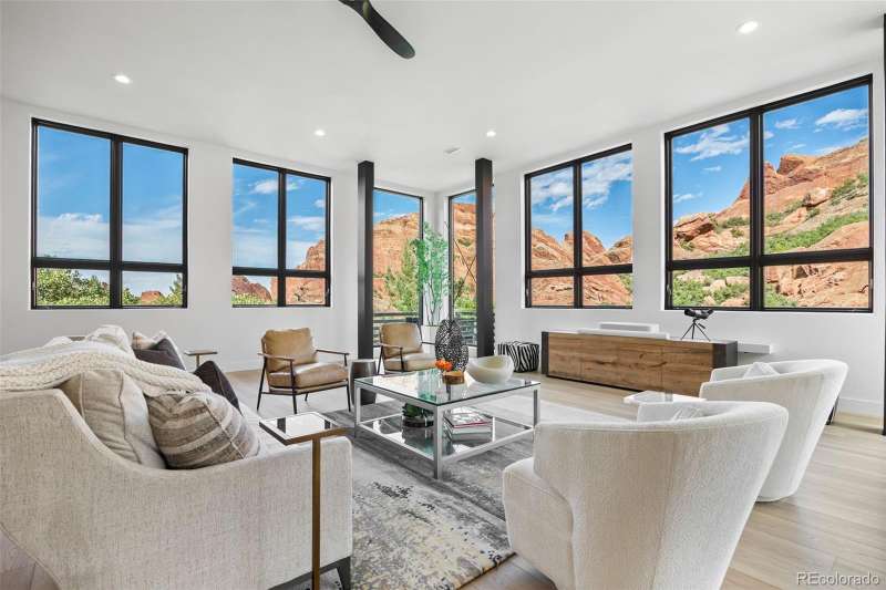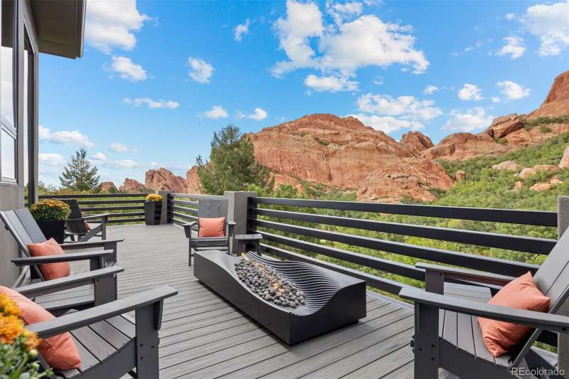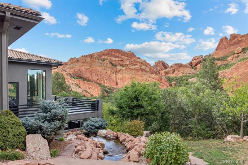 Behind the gates of Roxborough Park, this architecturally reimagined mountain modern retreat is every bit as striking as the red rock formations that surround it. Rebuilt with uncompromising craftsmanship and high-end finishes, the home flows seamlessly into its dramatic natural setting-floor-to-ceiling windows and expansive decks bring Pike National Forest and Roxborough State Park right to your doorstep. Every detail is custom, every space designed with intention. The gourmet kitchen showcases a 14-foot island, induction cooking with hidden ceiling vent, integrated appliances, pot filler, full-height pantry walls with pull-outs, and a beverage center with wine storage and built-in espresso. Vaulted ceilings and a dramatic four-sided fireplace define the dining and great room, creating a showstopping centerpiece for everyday living and unforgettable entertaining. The walkout lower level adds its own level of sophistication with a temperature-controlled wine cellar, coffered ceilings, and a designer wet bar with suspended glass shelving. Spa-inspired baths, radiant in-floor heating (including in the oversized garage with EV charging), thermal-break windows and doors, central vac, cascading water feature, resort-style fire pit, heated driveway, and dedicated hot tub and grill lines are just a few of the thoughtful touches. Comparable in design and refinement to the estates of Ravenna, yet offered at a more approachable price, this home delivers a lifestyle unique to Roxborough-luxury living paired with direct access to miles of trails and awe-inspiring views from every angle.