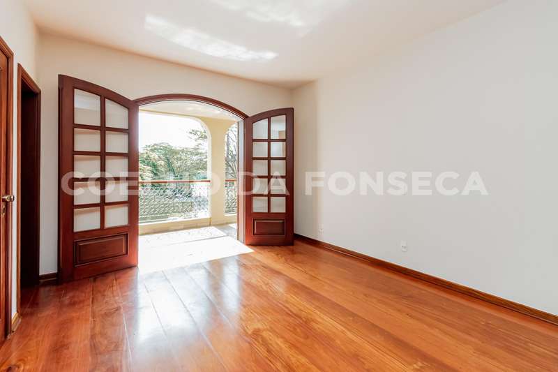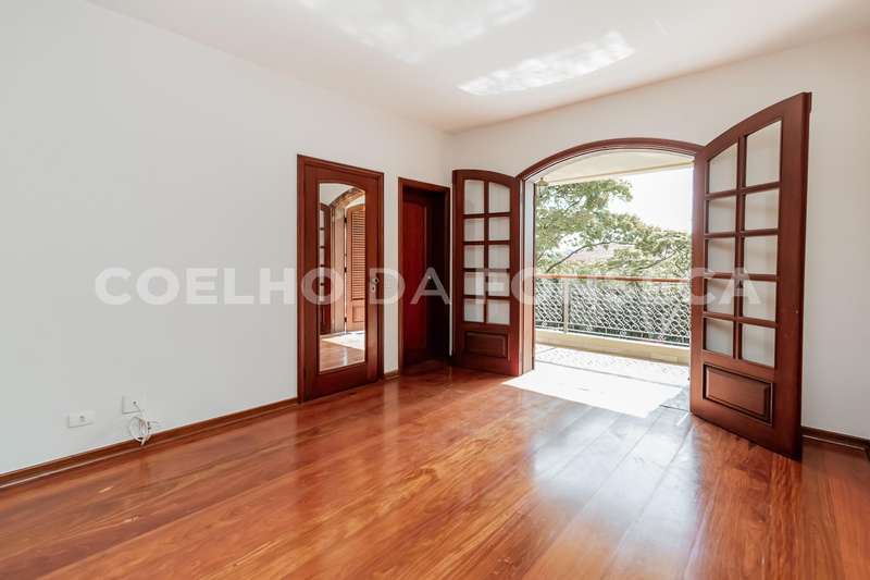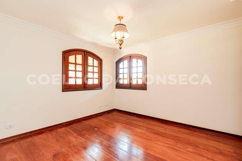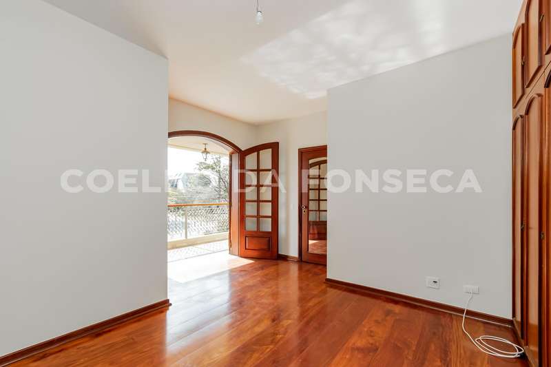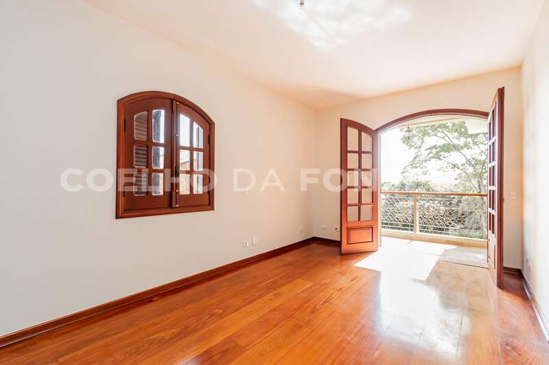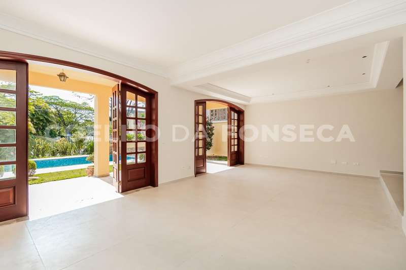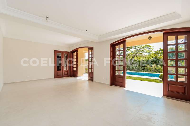 Casa com 04 suítes à venda no Residencial 06, em Alphaville. A casa possui quartos amplos, piso de madeira nobre nos quartos e salas. As salas são integradas com a área de lazer e com o paisagismo da casa.