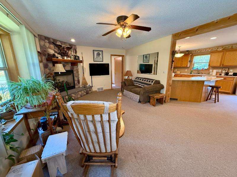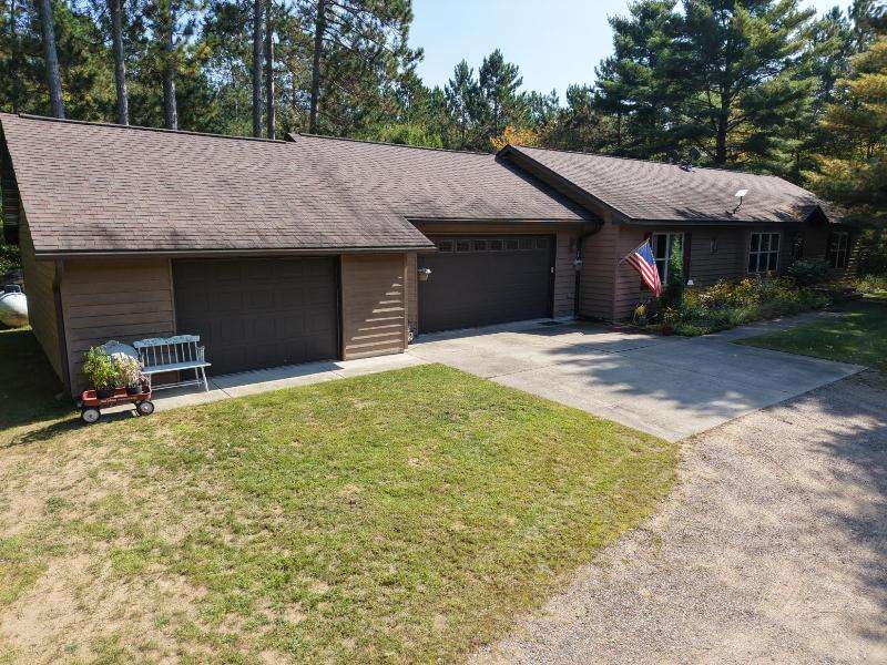 Year around home in a private setting. 3-bedroom, 2-bath with vaulted living room ceiling and gas fireplace. Three solar tube skylights bring natural light into darker areas. Attached 2-car garage with an additional garage/workspace. The unfinished basement had extra wall insulation and has a tall ceiling, giving it a spacious feel. The 5.4 acre lot is wooded with trails, and a fenced area for a garden or your furry friends. This great location has access to all the Northwoods lakes and recreation opportunities!