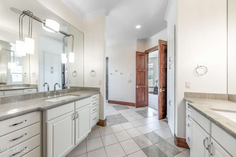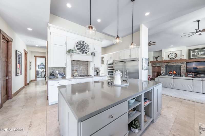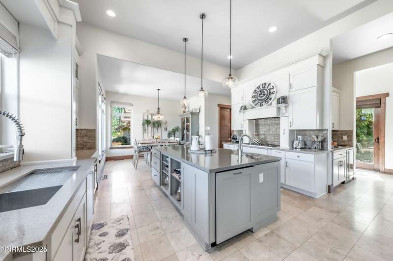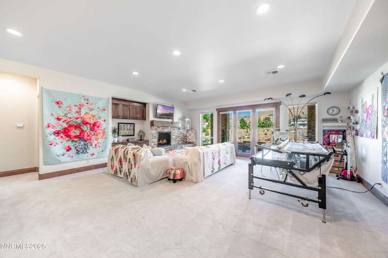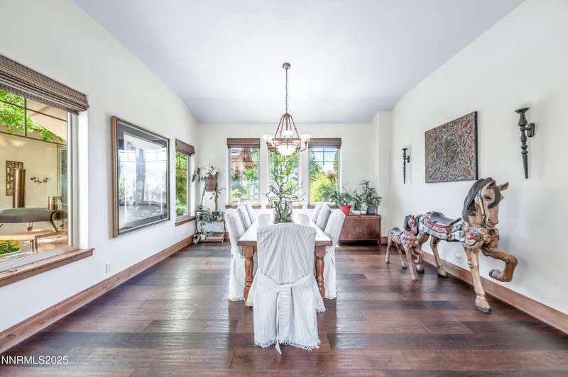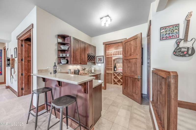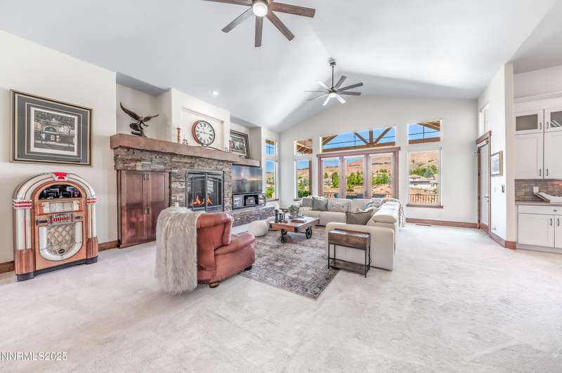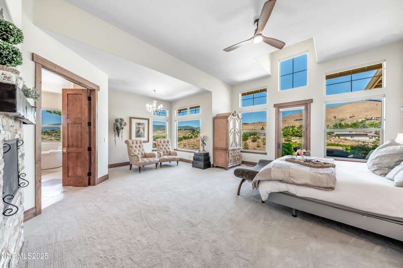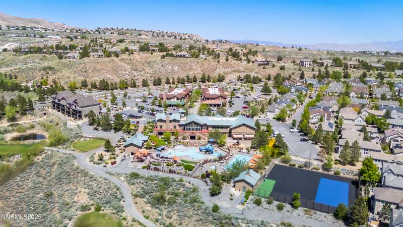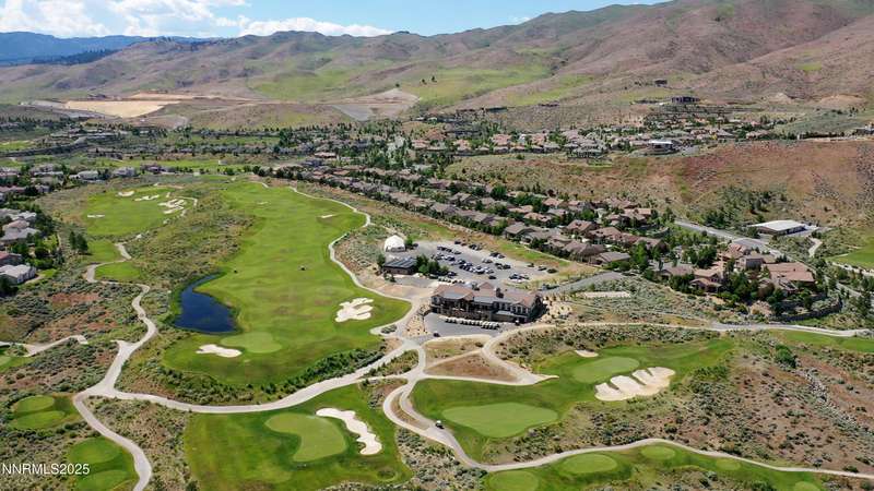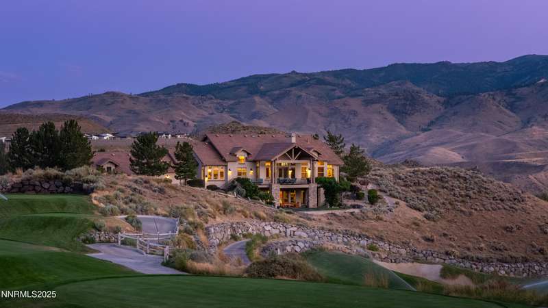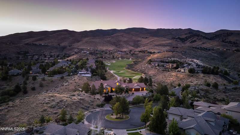 Welcome to luxury living in a small gated enclave within Reno's Somersett Community. Just off the 4th roundabout, this custom home overlooks the signature 3rd hole and 4th tee of the Tom Kite designed Somersett Golf course. Enjoy stunning sunsets from the wisteria-covered deck that spans the great room, kitchen, and primary suite. The spacious primary suite with panoramic mountain and golf course views is complete with reading nook, coffee bar, soaking tub with fireplace and a glamorously sized closet. The den and powder room are just off the foyer. A charming guest suite flows into the enclosed courtyard with a barbeque and seating area. Downstairs, discover two guest suites, a family room with wet bar and wine storage, and a six-seat movie theater. The .86-acre lot includes a 4-car, 1,400 sq. ft. garage with workspace and attic storage. Don't golf? Visit the town square for dining or wander to the HOA rec center with amenities including two pools, tennis & pickleball, a gym and Canyon Nine Golf Course. Trails and Parks are featured throughout the community. This is refined, relaxed living in one Reno's most desirable settings—where views, privacy, and comfort come together seamlessly.
