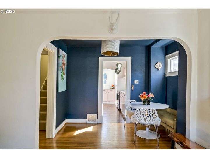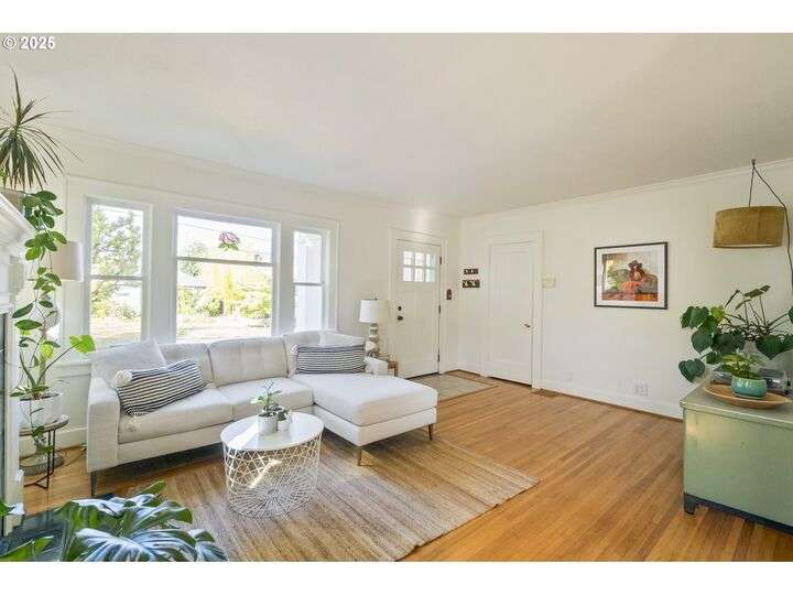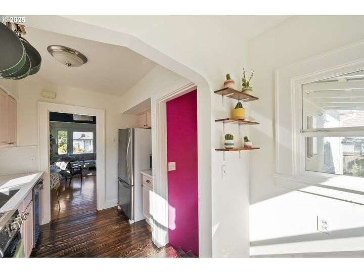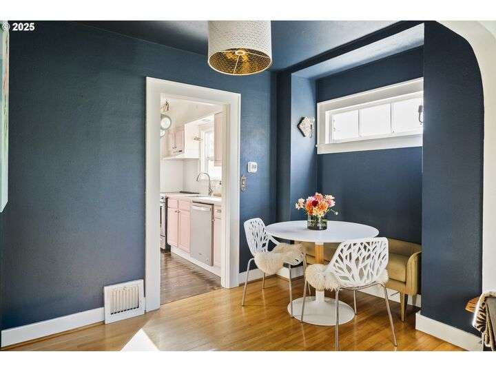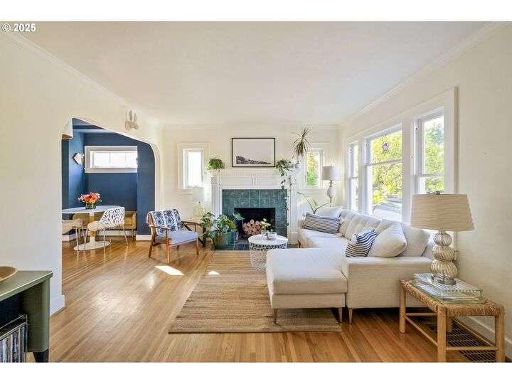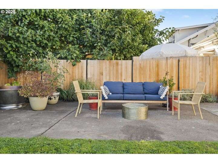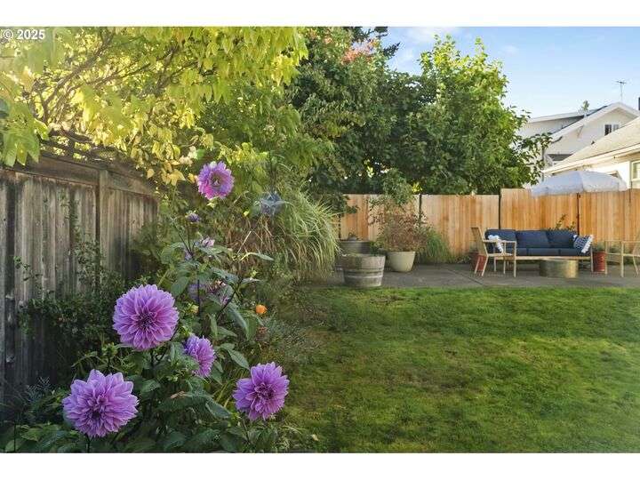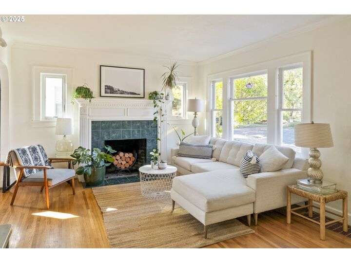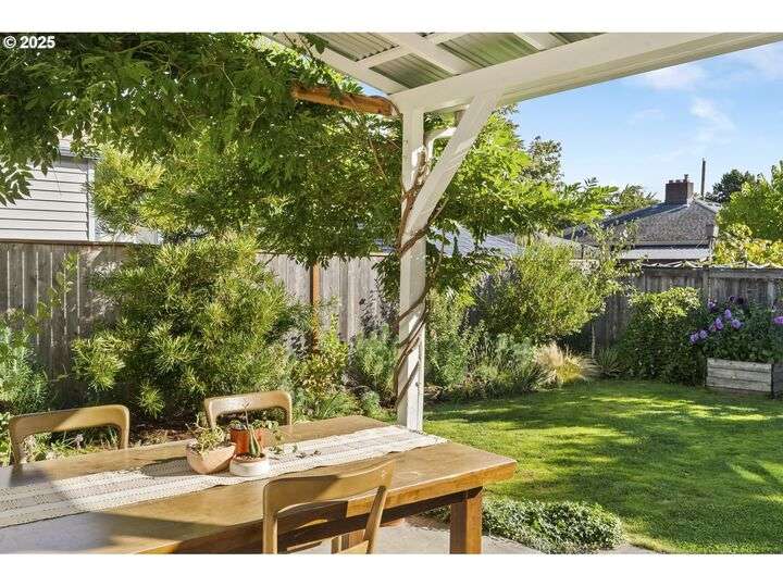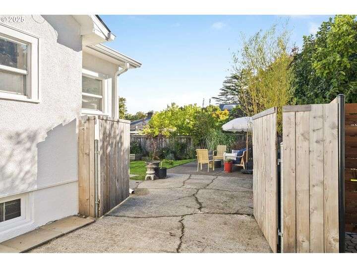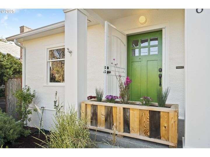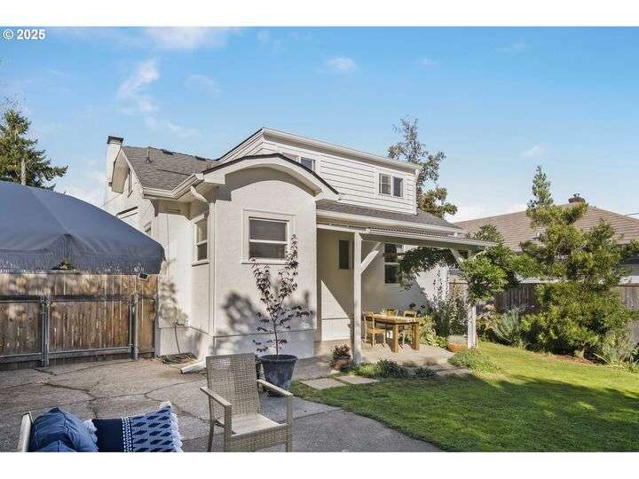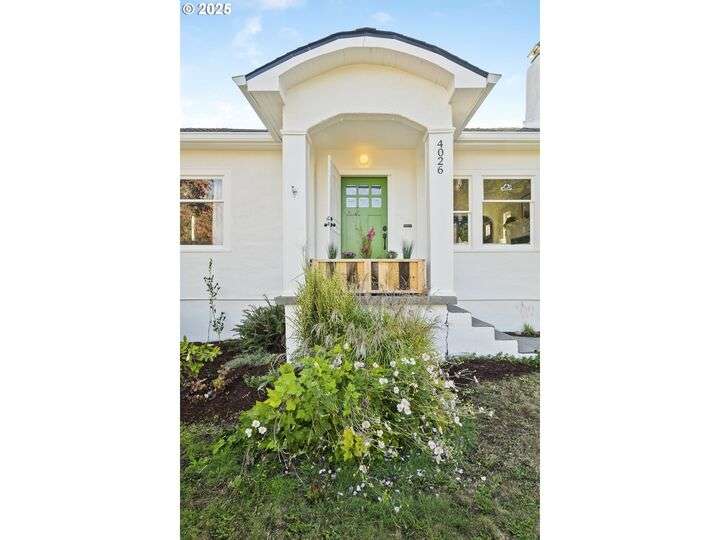 Discover this exceptional 1927 stucco home, exuding charm and elegance with its newly painted exterior in a timeless essential white, with just the right touch of creamy warmth. Upon the approach, prepare to be greeted by a landscaped front + the fenced backyard as a more private retreat. Embrace the essence of Portland living in this charming home, with beautiful oak hardwood floors that extend through the inviting living + dining room, complete with a cozy wood-burning fireplace. With coved details, quaint nooks, and a serene atmosphere, this home offers a unique sanctuary ready for its next fortunate owners. 2 bedrooms on the main and 2 on the upper level with an adjacent bonus space. Find a spot to tuck away and read, stretch + options for sleeping and a home office. On the main floor, in the private hall there is a large bathroom with double sink, expansive counter, plenty of storage and a shower/ tub combo. Find the joy of outdoor living in the fenced backyard, offering plenty of room for gardening + enjoying the beauty of each season as it unfolds. A unique copper cold plunge will remain with the home, providing a refreshing way to stay energized year-round. For added convenience, a covered outdoor dining and lounge area is situated near the back door, seamlessly connecting to the kitchen for entertaining.