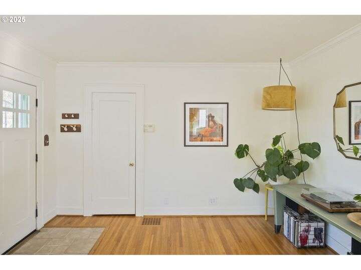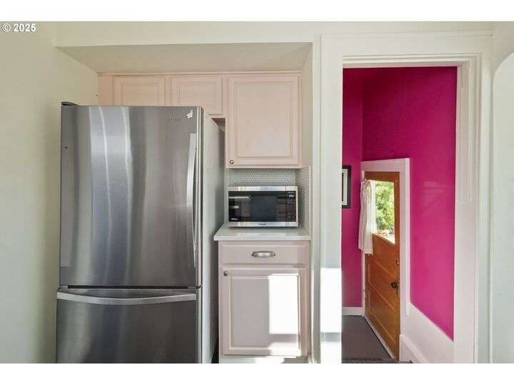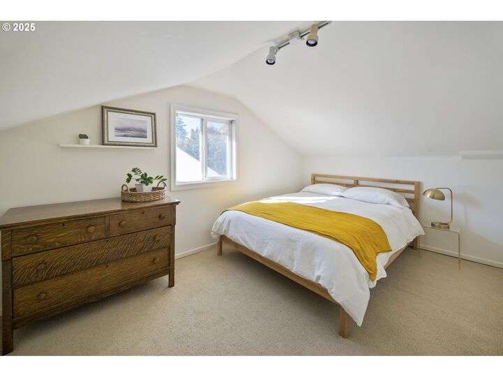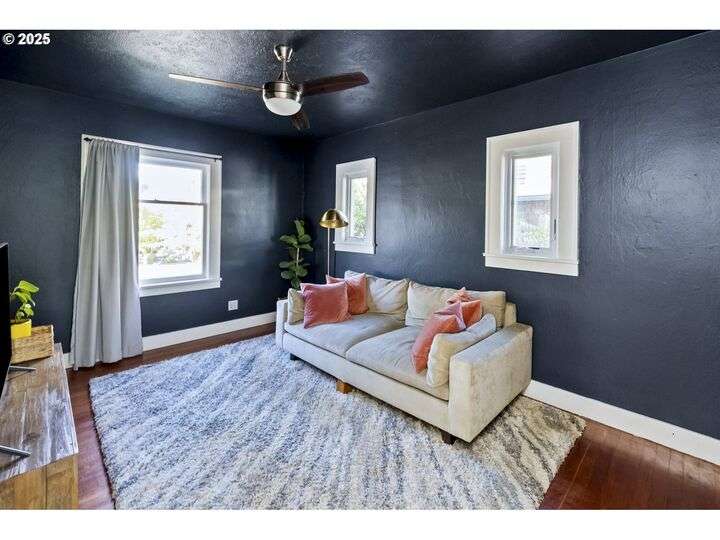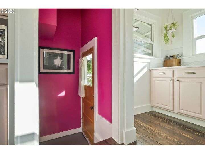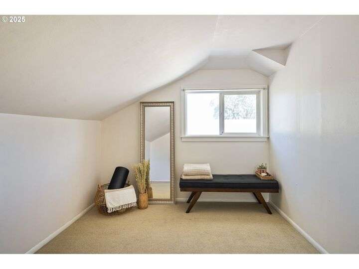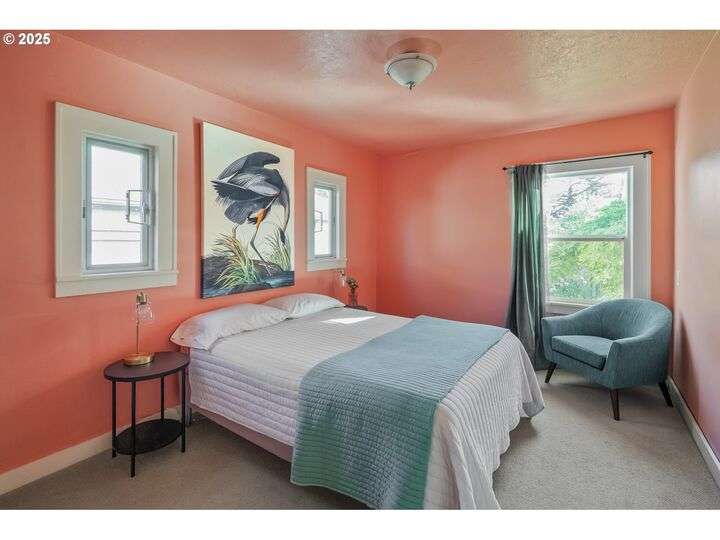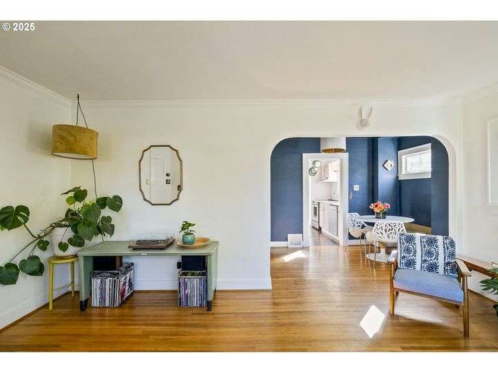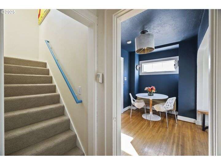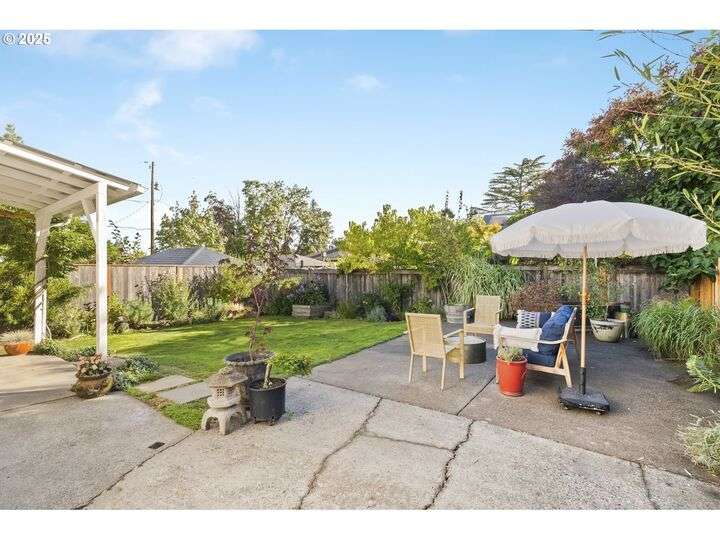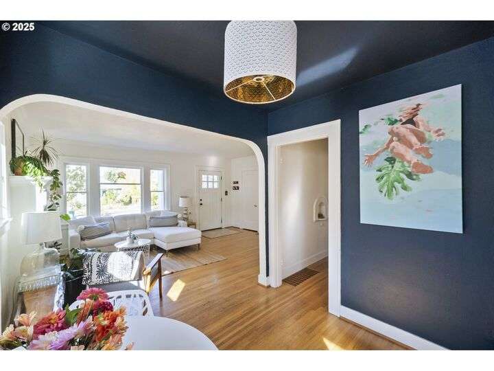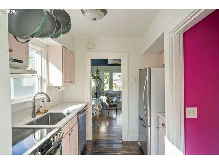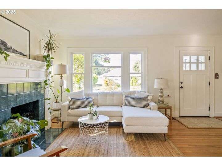 Discover this exceptional 1927 stucco home, exuding charm and elegance with its newly painted exterior in a timeless essential white, with just the right touch of creamy warmth. Upon the approach, prepare to be greeted by a landscaped front + the fenced backyard as a more private retreat. Embrace the essence of Portland living in this charming home, with beautiful oak hardwood floors that extend through the inviting living + dining room, complete with a cozy wood-burning fireplace. With coved details, quaint nooks, and a serene atmosphere, this home offers a unique sanctuary ready for its next fortunate owners. 2 bedrooms on the main and 2 on the upper level with an adjacent bonus space. Find a spot to tuck away and read, stretch + options for sleeping and a home office. On the main floor, in the private hall there is a large bathroom with double sink, expansive counter, plenty of storage and a shower/ tub combo. Find the joy of outdoor living in the fenced backyard, offering plenty of room for gardening + enjoying the beauty of each season as it unfolds. A unique copper cold plunge will remain with the home, providing a refreshing way to stay energized year-round. For added convenience, a covered outdoor dining and lounge area is situated near the back door, seamlessly connecting to the kitchen for entertaining.