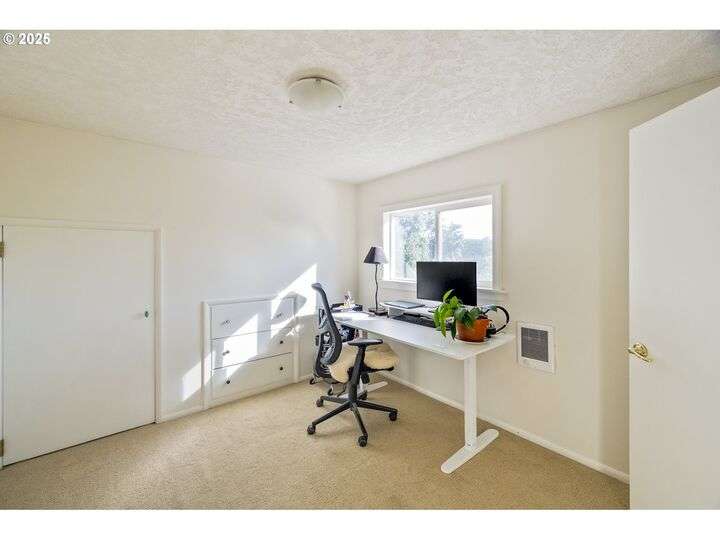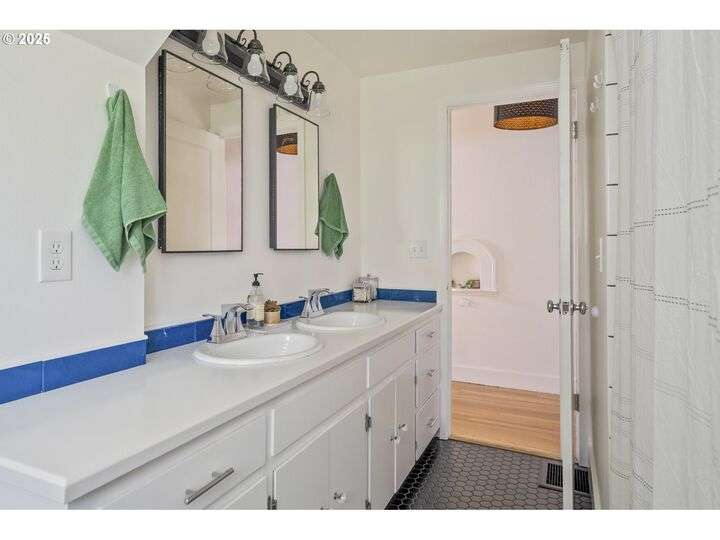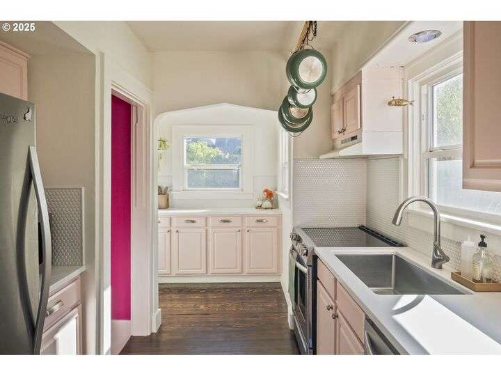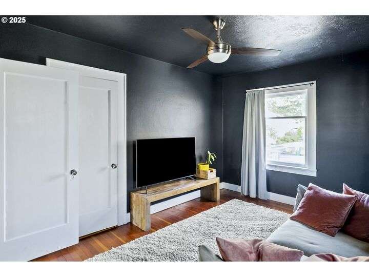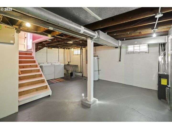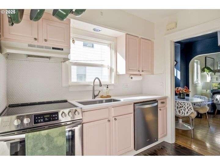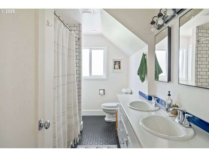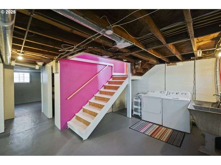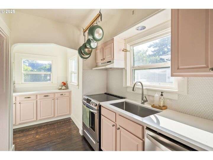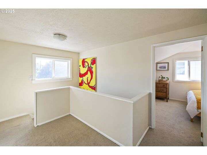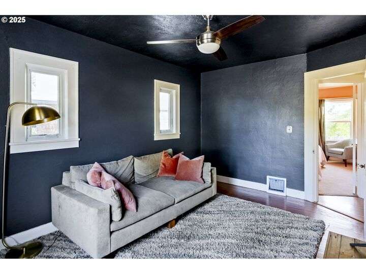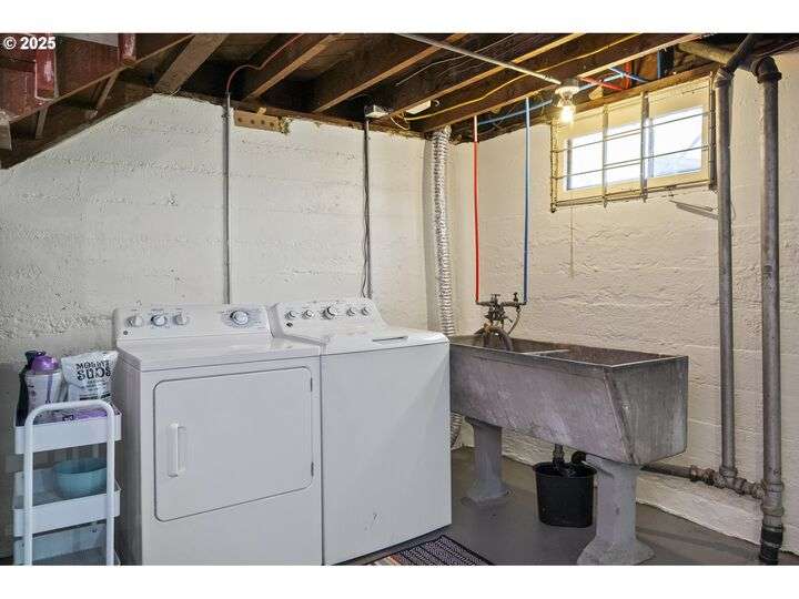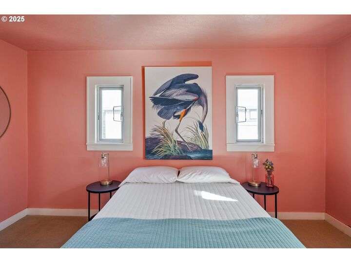 Discover this exceptional 1927 stucco home, exuding charm and elegance with its newly painted exterior in a timeless essential white, with just the right touch of creamy warmth. Upon the approach, prepare to be greeted by a landscaped front + the fenced backyard as a more private retreat. Embrace the essence of Portland living in this charming home, with beautiful oak hardwood floors that extend through the inviting living + dining room, complete with a cozy wood-burning fireplace. With coved details, quaint nooks, and a serene atmosphere, this home offers a unique sanctuary ready for its next fortunate owners. 2 bedrooms on the main and 2 on the upper level with an adjacent bonus space. Find a spot to tuck away and read, stretch + options for sleeping and a home office. On the main floor, in the private hall there is a large bathroom with double sink, expansive counter, plenty of storage and a shower/ tub combo. Find the joy of outdoor living in the fenced backyard, offering plenty of room for gardening + enjoying the beauty of each season as it unfolds. A unique copper cold plunge will remain with the home, providing a refreshing way to stay energized year-round. For added convenience, a covered outdoor dining and lounge area is situated near the back door, seamlessly connecting to the kitchen for entertaining.
