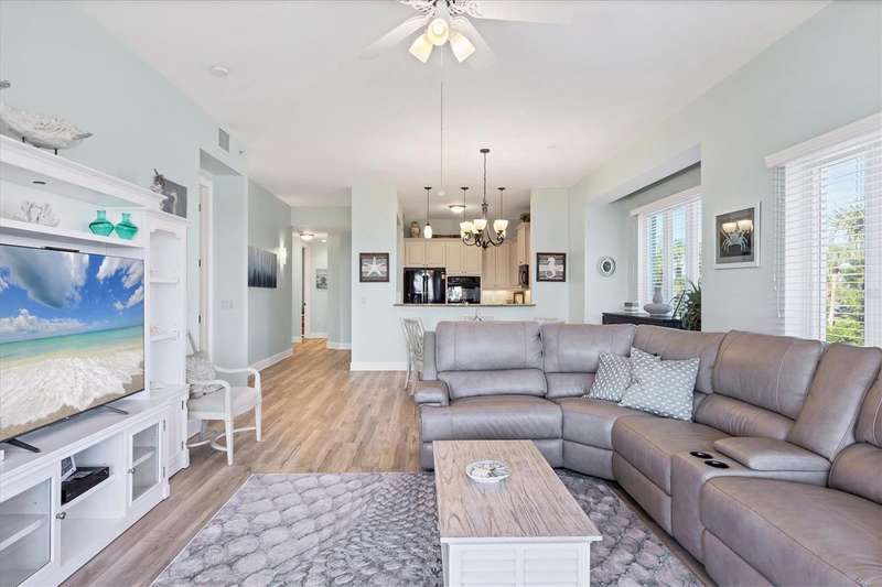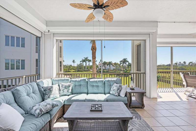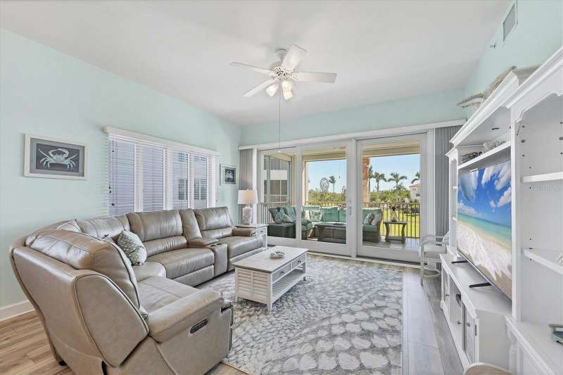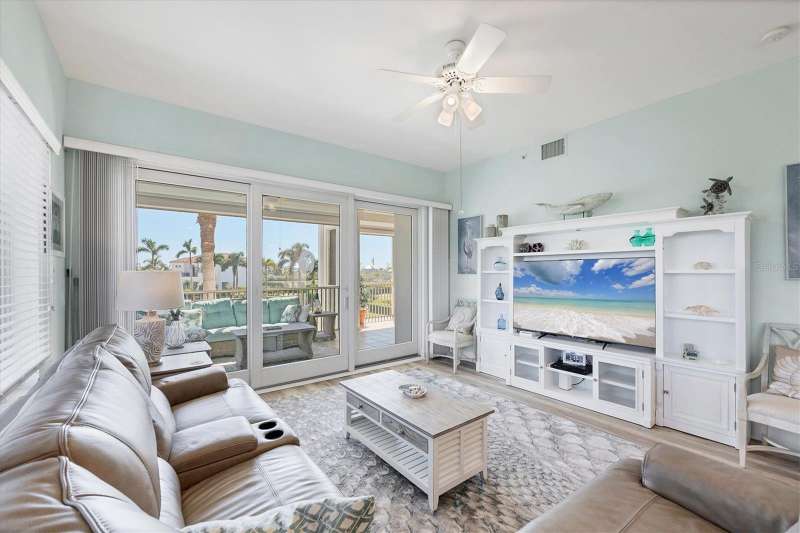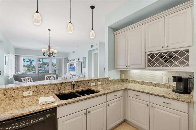 Experience refined coastal living in this beautifully remodeled 3-bedroom, 2.5-bath corner unit in the coveted southern-facing Building "C" of Hacienda Del Mar. Bathed in natural light from numerous east-facing windows, this mint-condition property showcases a fresh coastal design with brand-new wide plank flooring throughout the living and bedroom areas, fresh interior paint, and tile backsplash. The open-concept floor plan seamlessly blends the expansive kitchen, dining, and living spaces, all anchored by elegant stone countertops, creating an inviting and impressive setting for everyday living and entertaining. Step outside to enjoy truly exceptional outdoor living. The immense screened lanai features a stunning built-in outdoor kitchen, while a private terrace off the guest bedrooms offers a peaceful retreat. Built to the highest standards, this residence boasts Andersen impact-resistant windows and sliders, storm shutters, a richly stained Thermatru front door, soaring 10-foot ceilings, and 8-foot solid core interior doors. Enjoy picturesque views of the Intracoastal Waterway and convenient access to two resort-style swimming pools, a luxurious waterfront clubhouse, spa, tennis and pickleball courts, day dockage, and Palm Harbour Marina. Ideally located near top-tier shopping, fine dining, public and private golf courses, world-class fishing and boating, and the charm of historic Boca Grande. Most of the nearly-new furnishings are negotiable, move in and start enjoying paradise today.