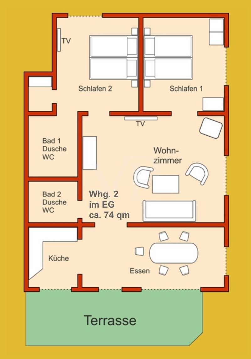 Apartment 2 ground floor Renovated in 2023, this comfortable apartment has a bedroom with double bed, another bedroom also with double bed, walk-in closet and adjoining bathroom with shower/WC, a second bathroom with shower/WC, a kitchen, a spacious living room, a veranda with dining table and a south-west facing terrace with a view of the well-tended flower garden. A plot of land of approx. 55 sqm, purchase price € 21,000.00 and a parking space, purchase price € 10,000.00 can be purchased additionally on request.
