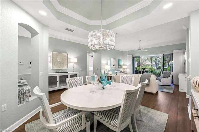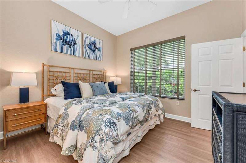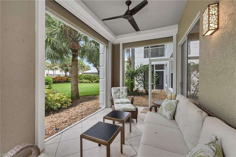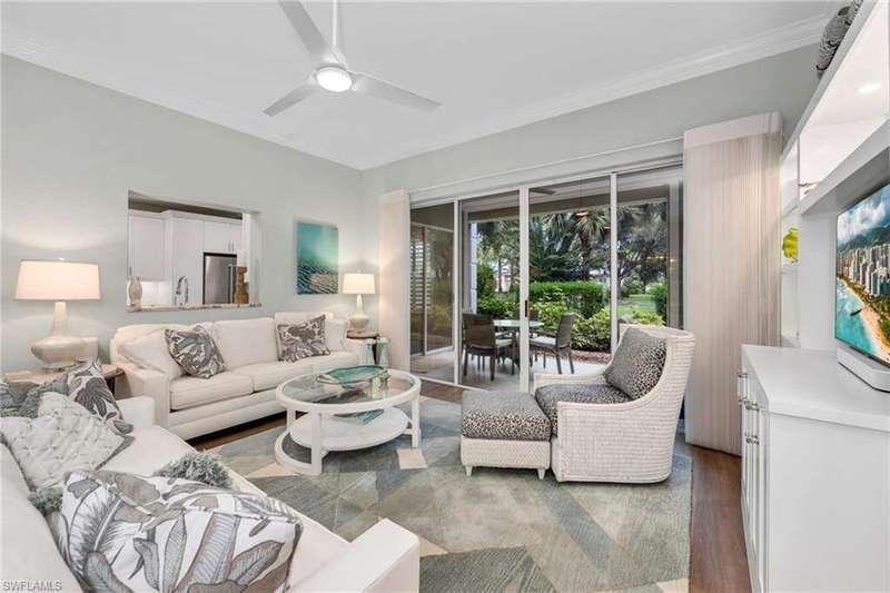 Completely updated, BEAUTIFUL, first floor coach home-no steps. 2BR plus a den (den with built-in desk, can converted back to a closet, for 3rd BR). 2 full and 1/2 bathrooms. Gorgeous LV flooring throughout. Upgraded cabinetry in kitchen/bathrooms and quartz countertops. Guest bath with newly completed shower. Hunter Douglas window treatments and updated light fixtures. Spacious Lanai/w 2 Remote controlled fans and hurricane screens ..there is screened door for easy access to grassy area, perfect for quick pet relief. NEW ROOF, newly painted exterior and updated lighting. The Pelican Marsh community has many amenities, including a restaurant, 6 very active pickleball courts, 8 tennis courts, bocce, attended fitness center with a variety of classes, and much more!!!! Make your activity or dining reservations on your app, once you are an owner, in this well located community in North Naples. Walk to the Farmers Market on most Saturday mornings. 3 Guard gated and 1 un-manned gate allows access. This is a property, not to be missed.