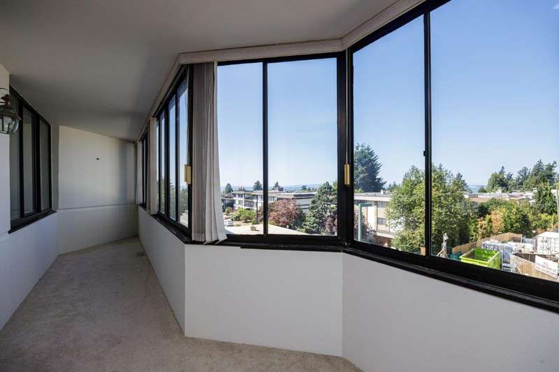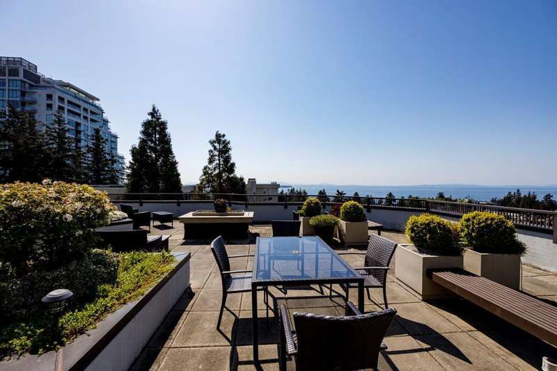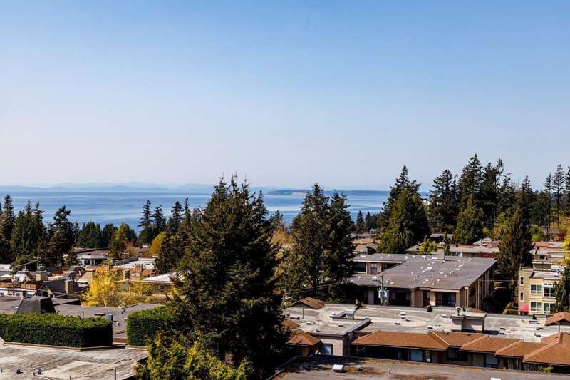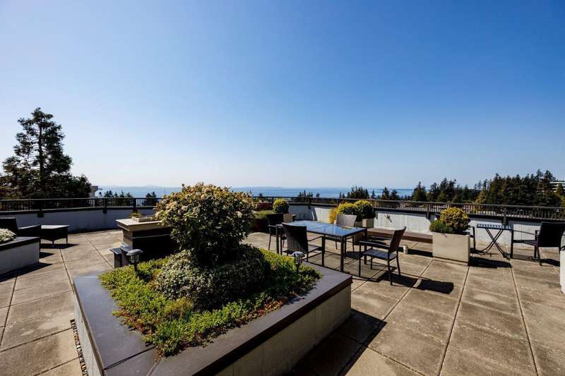 Large 1,054 sf 2 bedroom, 2 bathroom home with beautiful ocean views from the condo and the roof top common area that has a large terrace space, gardens, billiards room and sauna. White Rock Square I is a concrete building in Central White Rock with no age restrictions and includes heat and hot water. The enclosed balcony is additional space for year-round enjoyment. The condo has new paint throughout and professionally cleaned carpet. Walk to Peninsula mall, shopping, dining, transit and you'll love being so close to the beach! No pets allowed, rentals are allowed. (id:58403)