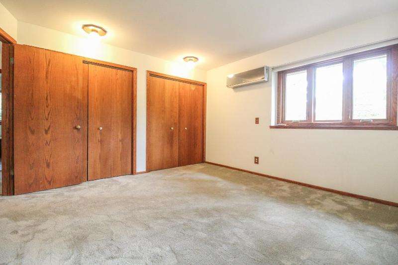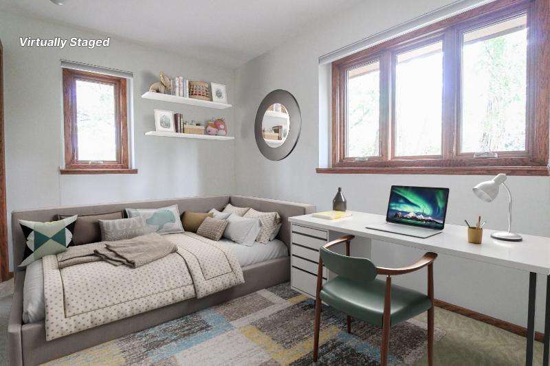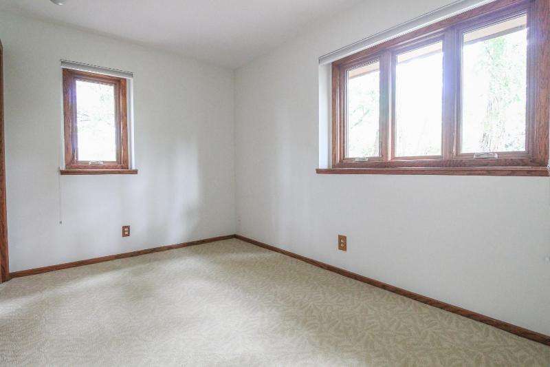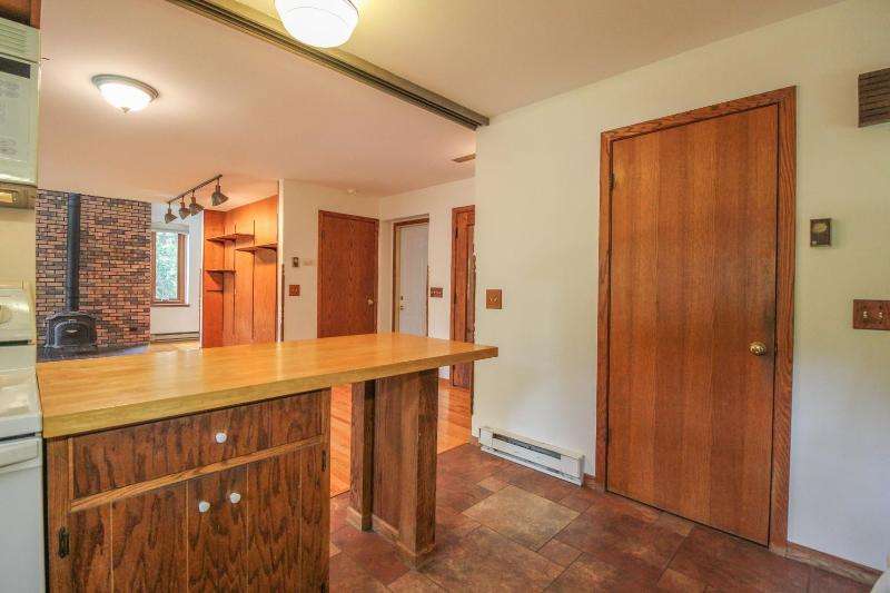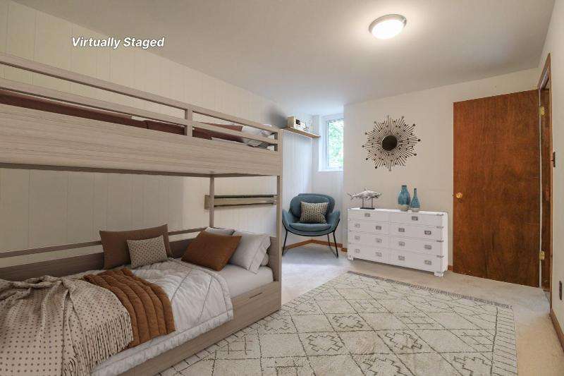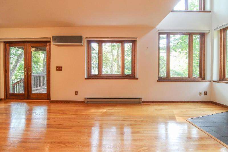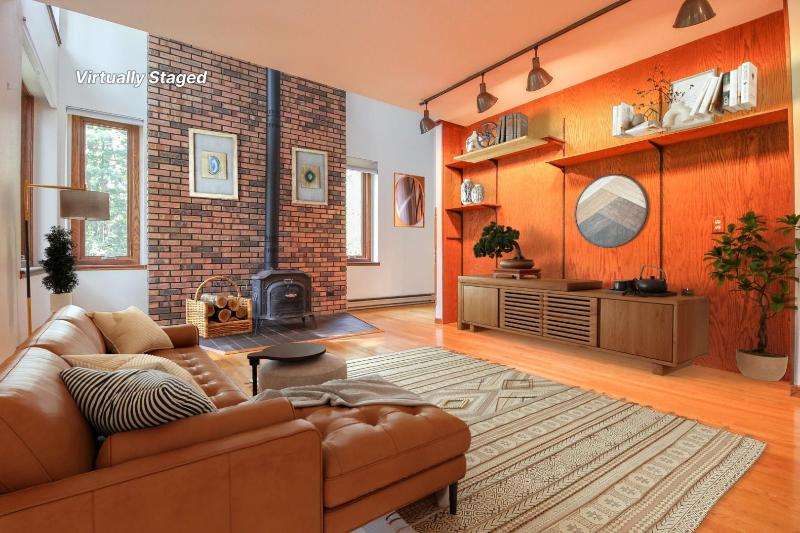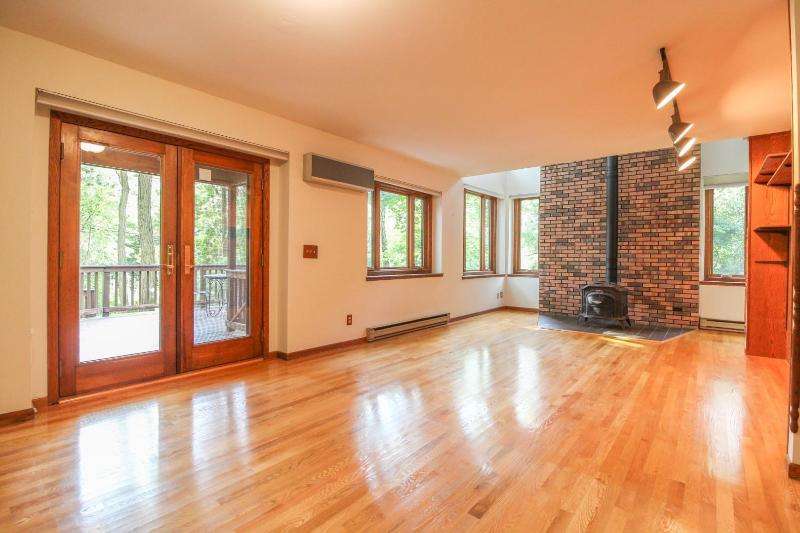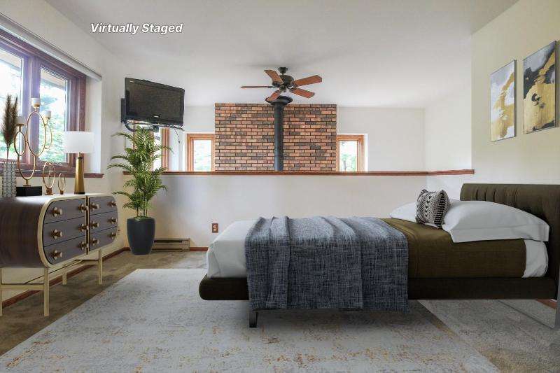 Modern style, 1-1/2 story, cuddled by Mother Nature offering lake views & lake access. One-owner home w/passive solar construction w/1' thick brick & mortar walls, electric heat & ductless mini split AC units. Note: 3rd BR is exposed, not considered legal egress. Enjoy the colors of the season & lake views from screen porch, deck or inside. Main floor includes floor-to-ceiling windows, brick wall with woodburning stove, wood floors, galley kitchen & 1/2 bath. Upstairs includes Primary loft bedroom open to LR, 2nd bedroom & full bath. Partially finished LL for optional 3rd BR or workout room. Newer siding, roof, windows, partially fenced yard, 1-1/2 car garage on private 1.3 acres, offering room to expand. Update to taste or embrace original 80's style retro decor. This home has great vibes!