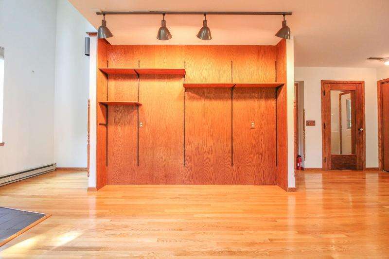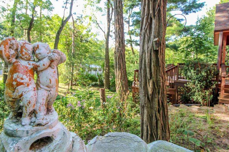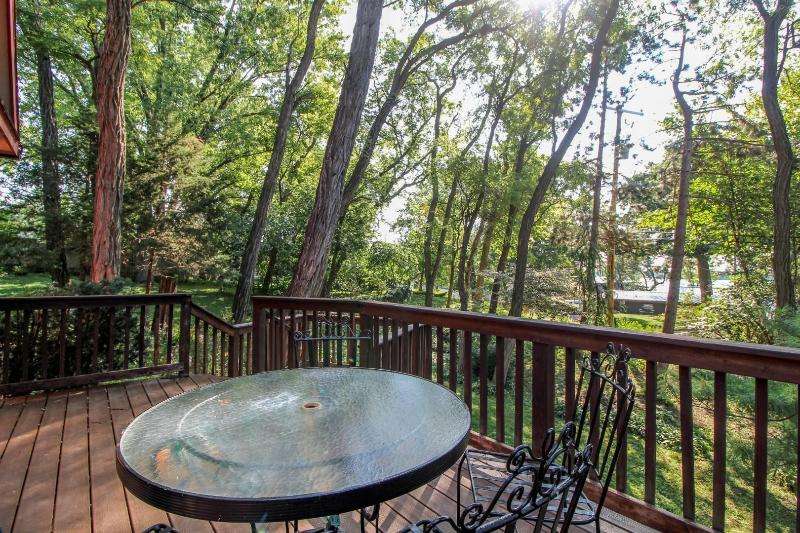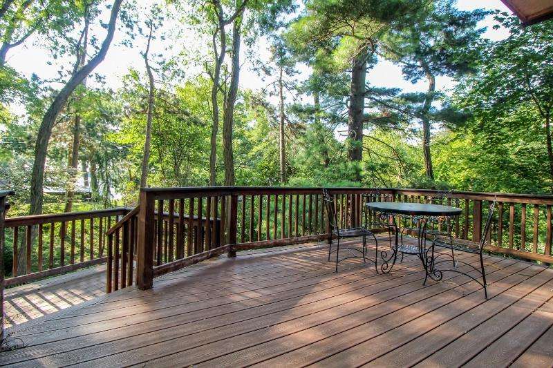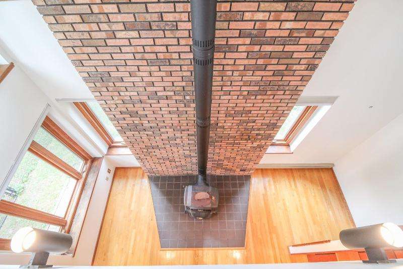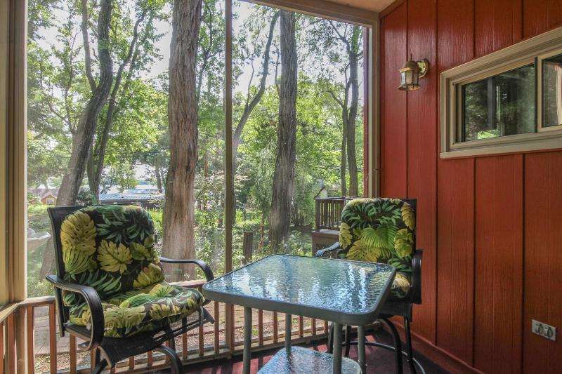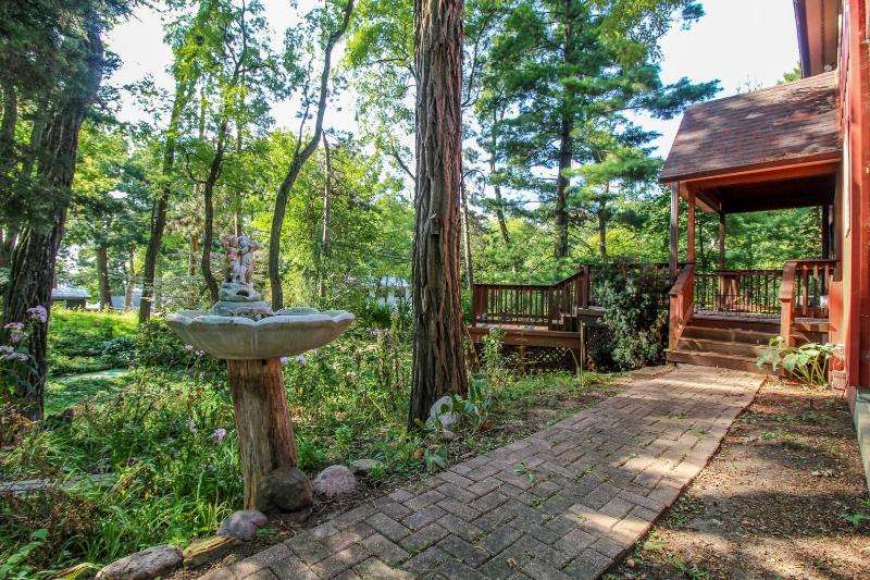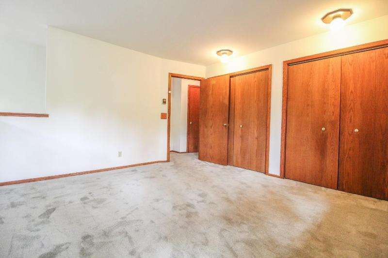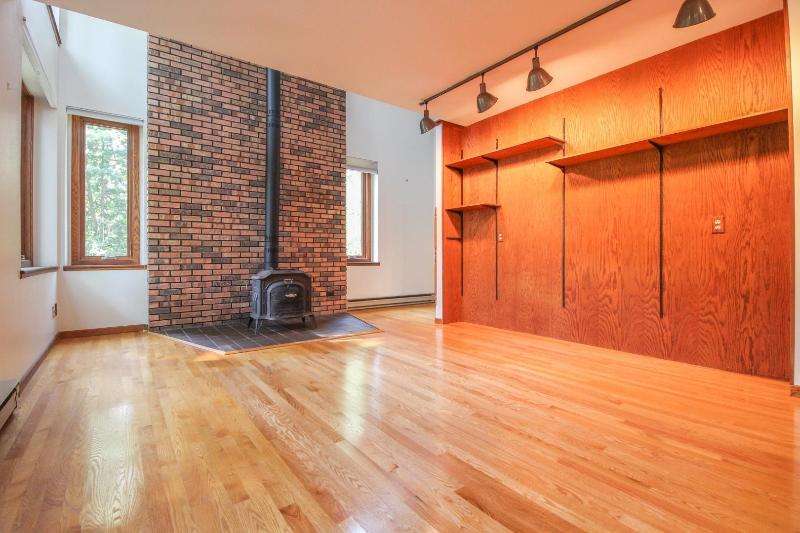 Modern style, 1-1/2 story, cuddled by Mother Nature offering lake views & lake access. One-owner home w/passive solar construction w/1' thick brick & mortar walls, electric heat & ductless mini split AC units. Note: 3rd BR is exposed, not considered legal egress. Enjoy the colors of the season & lake views from screen porch, deck or inside. Main floor includes floor-to-ceiling windows, brick wall with woodburning stove, wood floors, galley kitchen & 1/2 bath. Upstairs includes Primary loft bedroom open to LR, 2nd bedroom & full bath. Partially finished LL for optional 3rd BR or workout room. Newer siding, roof, windows, partially fenced yard, 1-1/2 car garage on private 1.3 acres, offering room to expand. Update to taste or embrace original 80's style retro decor. This home has great vibes!