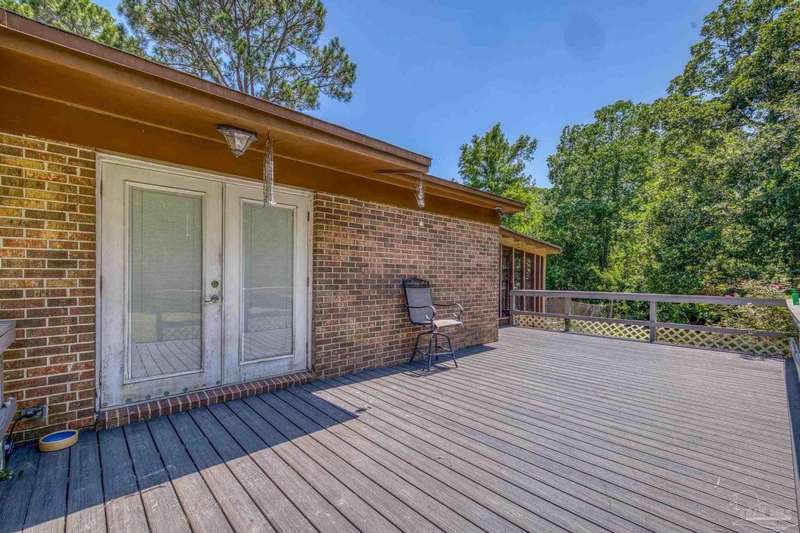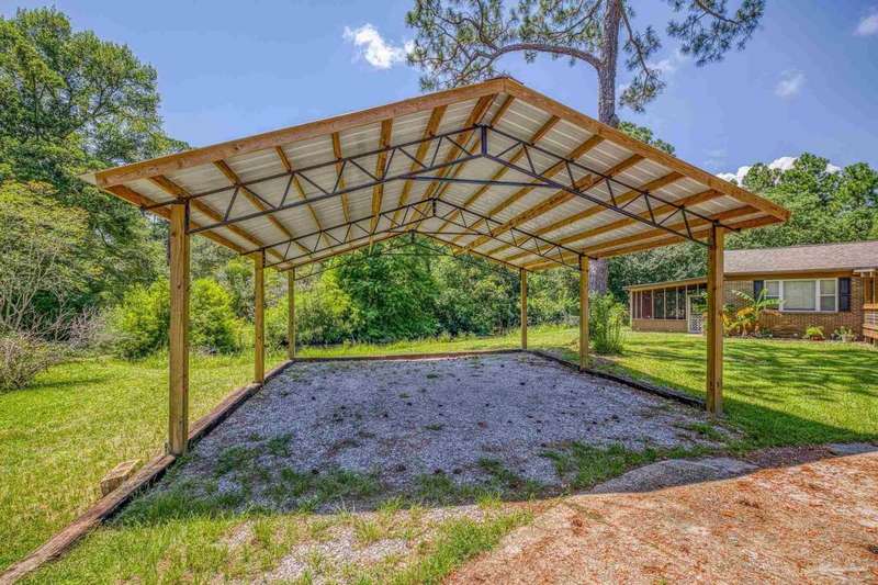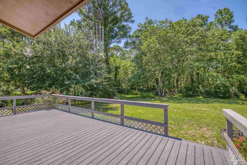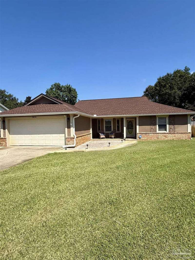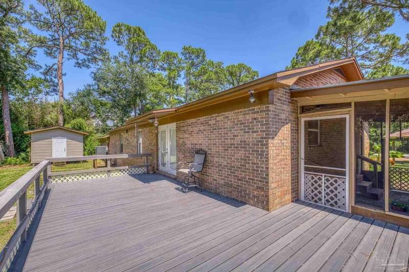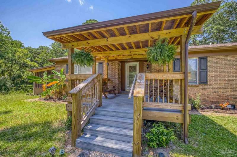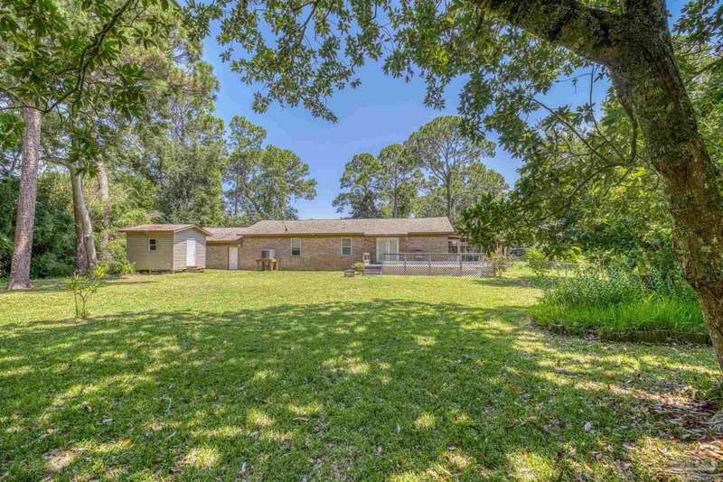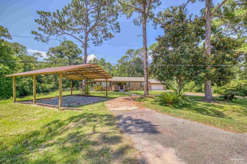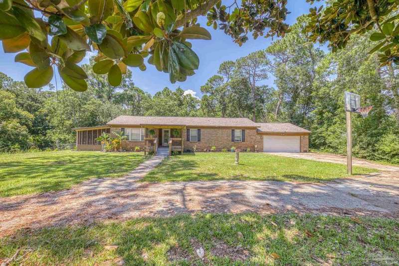 **SELLER CONCESSIONS AVAILABLE AND OPEN TO OWNER FINANCING** Are you searching for the perfect Gulf Breeze home? Search no longer! This 4-sided brick ranch sits on a double lot with woods in the back for a secluded feel while enjoying close proximity to Pensacola Beach and restaurant and shopping venues. A newly built covered front porch was added to allow for a lovely greeting area for your guests. In addition, a screened in covered porch with a ceiling fan is a perfect area to sip your morning coffee and enjoy the serene surroundings and sounds of birds and fish in the pond. The circular driveway is perfect for guest parking as well as the addition of the pole barn in the front. This, plus the attached 2 car garage makes this home an entertainer's dream! In the backyard you will see a ginormous fenced in yard and a newly installed out building. Inside, observe the fresh paint throughout the home and the absolutely massive eat in kitchen! Beautiful French style doors lead from the kitchen to the oversized back porch. High vaulted ceilings featured throughout the home to give an extra luxurious feel. The primary suite features 2 large closets and a beautifully redone full bath with beautiful new tile and stand-up shower. The 2 bedrooms are perfect for guests and include large closets. The spare bath features a shower tub combo and a single vanity. Schedule your showing today!