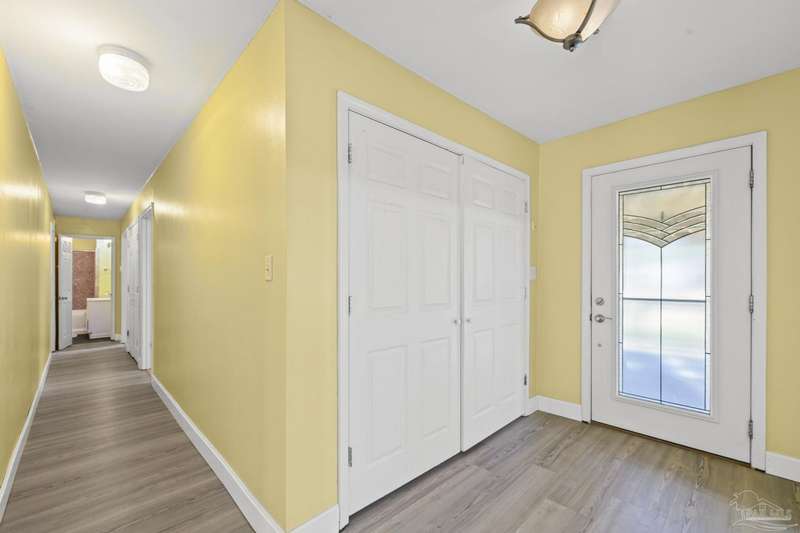 Are you searching for the perfect Gulf Breeze home? Search no longer! This 4-sided brick ranch sits on a double lot with woods in the back for a secluded feel while enjoying close proximity to Pensacola Beach and restaurant and shopping venues. A newly built covered front porch was added to allow for a lovely greeting area for your guests. In addition, a screened in covered porch with a ceiling fan is a perfect area to sip your morning coffee and enjoy the serene surroundings and sounds of birds and fish in the pond. The circular driveway is perfect for guest parking as well as the addition of the pole barn in the front. This, plus the attached 2 car garage makes this home an entertainer's dream! In the backyard you will see a ginormous fenced in yard and a newly installed out building. Inside, observe the fresh paint throughout the home and the absolutely massive eat in kitchen! Beautiful French style doors lead from the kitchen to the oversized back porch. High vaulted ceilings featured throughout the home to give an extra luxurious feel. The primary suite features 2 large closets and a beautifully redone full bath with beautiful new tile and stand-up shower. The 2 bedrooms are perfect for guests and include large closets. The spare bath features a shower tub combo and a single vanity. Schedule your showing today!