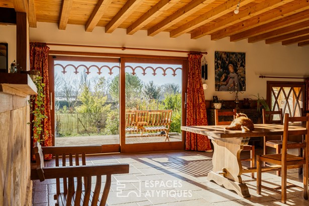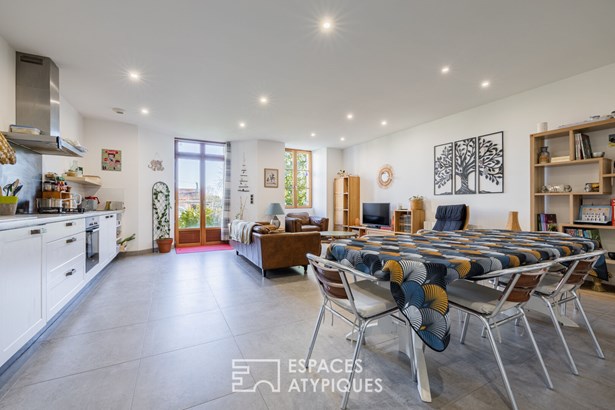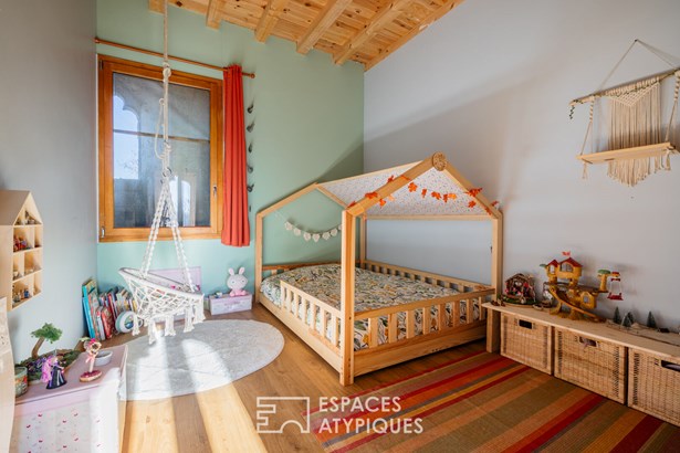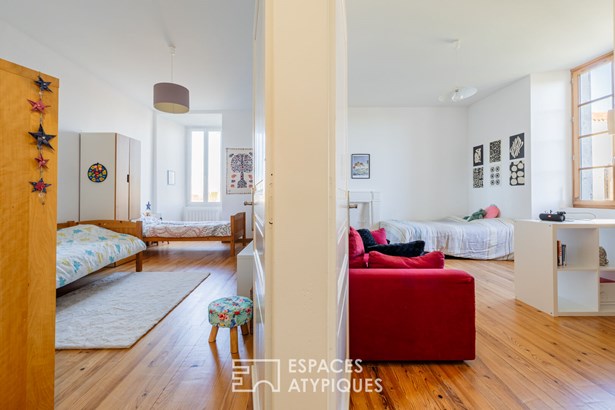 The windows, custom-made by a local craftsman, preserve the spirit of the period while bringing a unique artisanal touch. A friendly kitchen opens onto a warm living room, while the upper floor stands out with two bedrooms, a bathroom, an office and a large room, currently dedicated to video and rest, offering many possibilities to accommodate your projects.