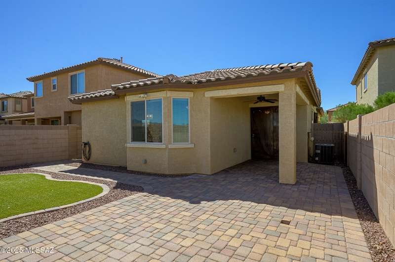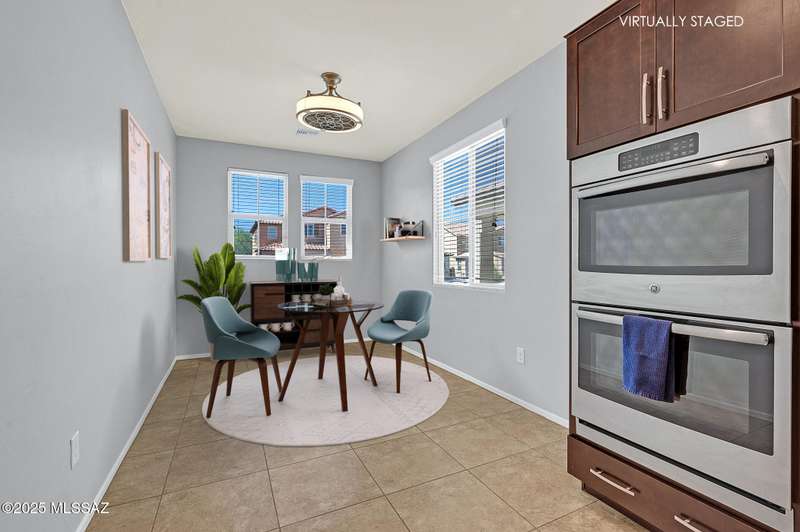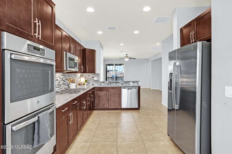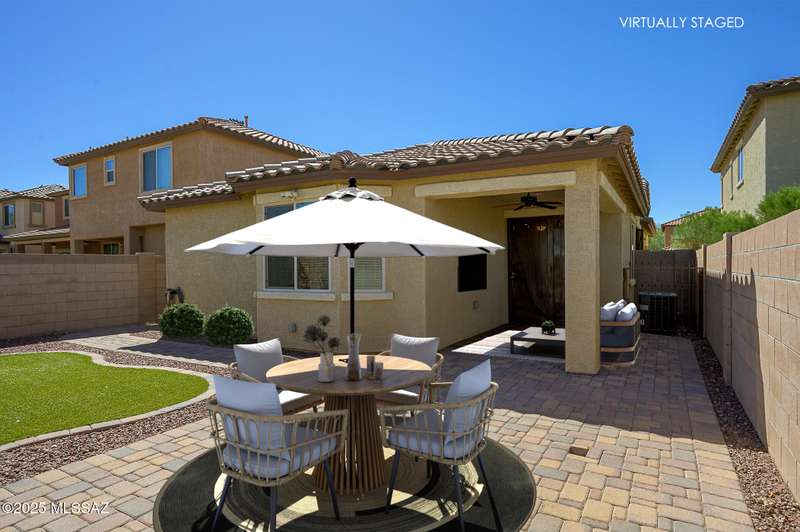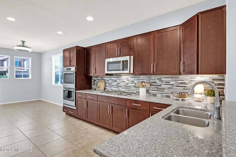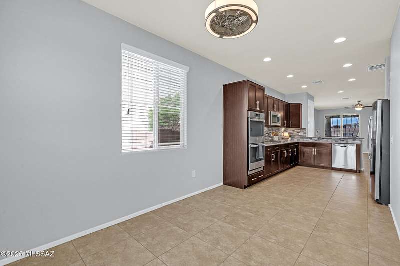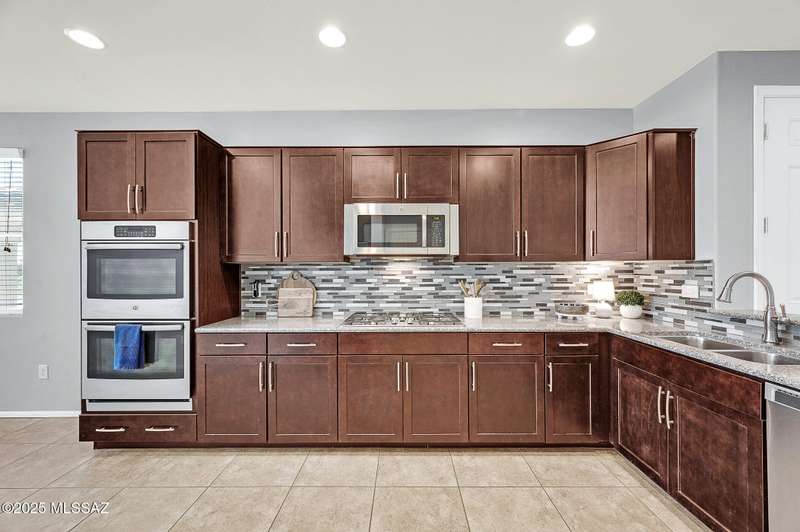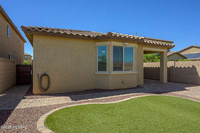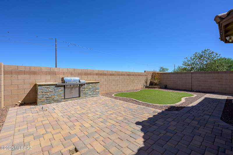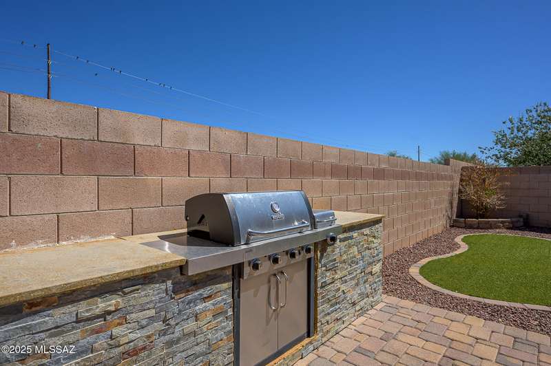 This is the nearly new, well maintained home you've been waiting for! Step inside to vaulted ceilings and a gourmet kitchen featuring a 5-burner gas cooktop, double oven, upgraded cabinetry, and ample counter space. Home features PAID OFF solar panels to keep monthly costs low, and decorative custom steel doors at front and patio. Relax or entertain in the beautifully landscaped backyard, complete with paver patio, low-maintenance turf, and a built-in BBQ/cooktop -- perfect for Arizona evenings. Thoughtful upgrades everywhere and all appliances included: new dishwasher, brand new washing machine, dryer, stainless refrigerator. All this and located within the award-winning Vail School District, close to DMAFB, and home has 2.9% assumable VA loan!