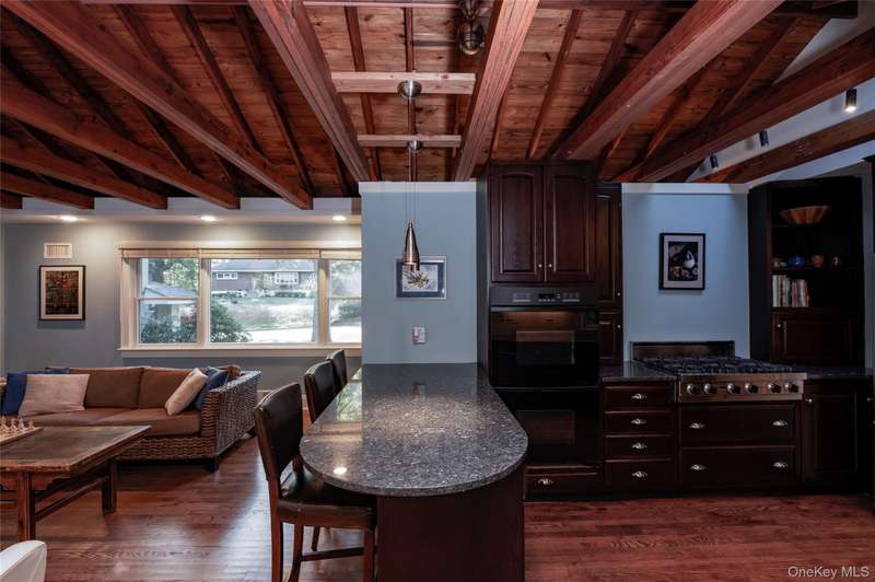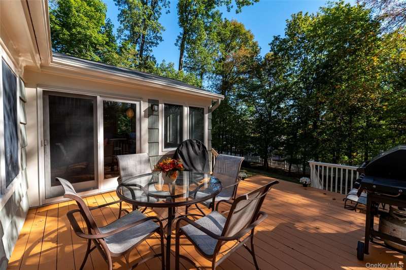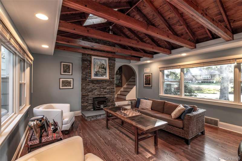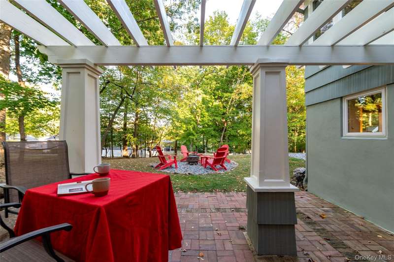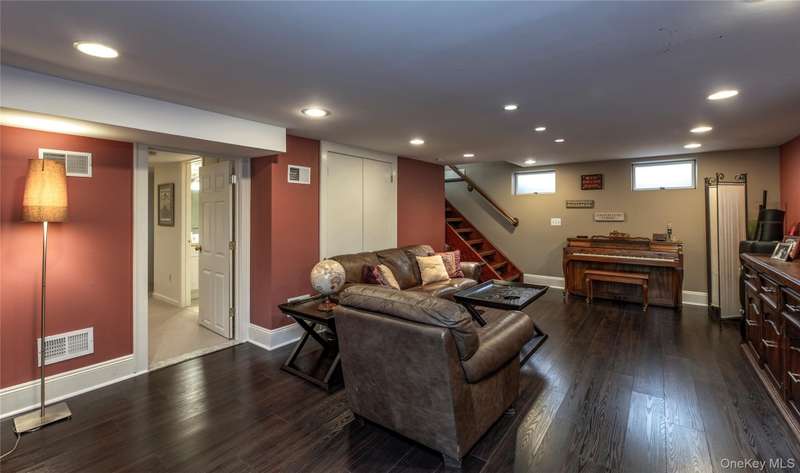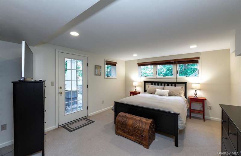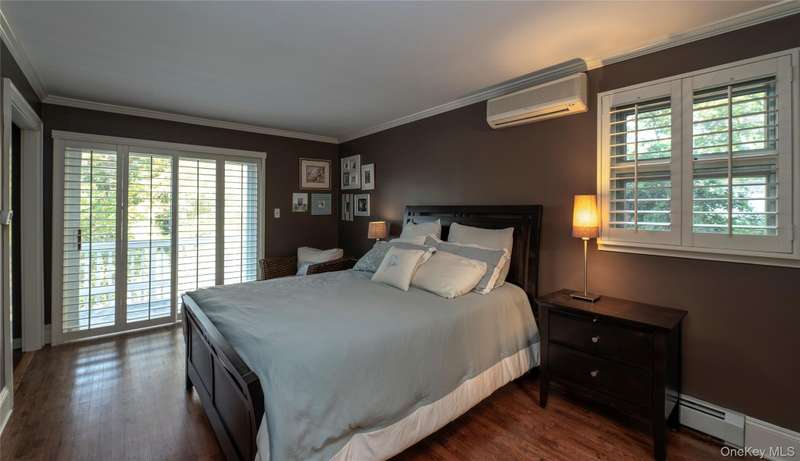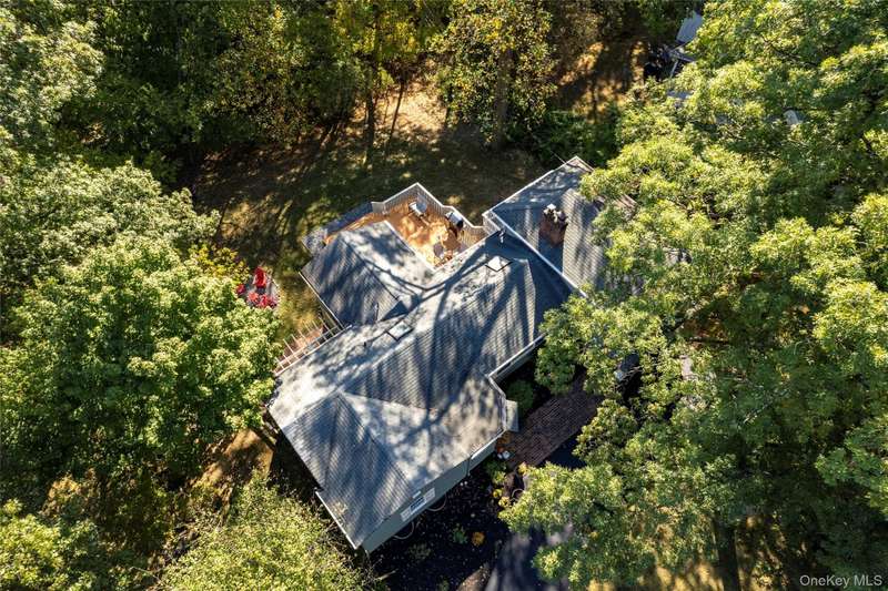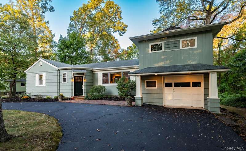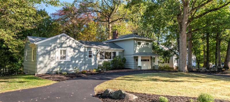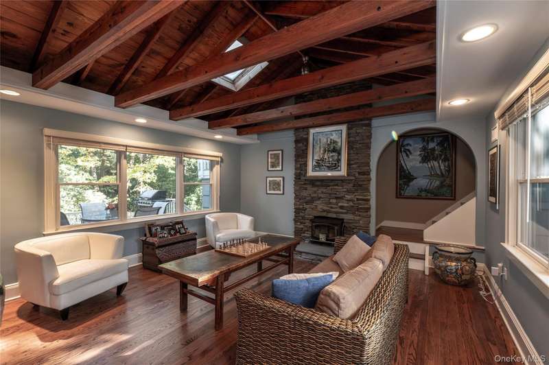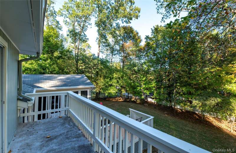 This latest offering in Upper Nyack is just 40 minutes from New York City, in a highly walkable, bike-friendly setting with access to Hook Mountain, town parks and community pools. With 2,600 square feet of living space, it features a distinctive floor plan highlighted by a private primary suite on its own level, complete with full bath, walk-in closet, and secluded deck. The entry foyer leads to a spacious living room with fireplace and beamed ceilings, flowing to an open kitchen with matching beams and a formal dining room with three walls of windows which bring the outside in and open to a double-level deck overlooking the rear yard with firepit beneath a majestic oak. Two additional main-level bedrooms and a full bath provide comfortable accommodations. The lower level continues the open flow with a large family room offering windows and sliders to a brick patio with pergola. A full bedroom with private bath also opens to this patio, creating an ideal guest or in-law suite. Additional features include a circular driveway, one-car garage, freshly painted exterior, and quick closing availability.