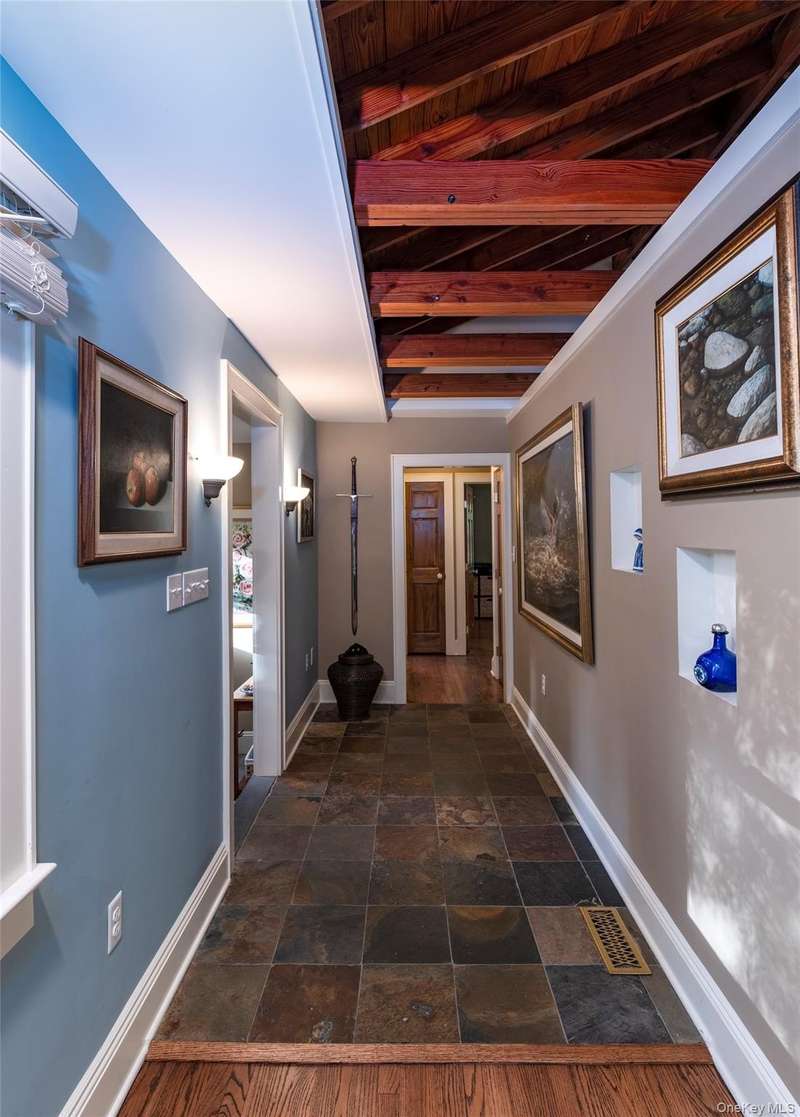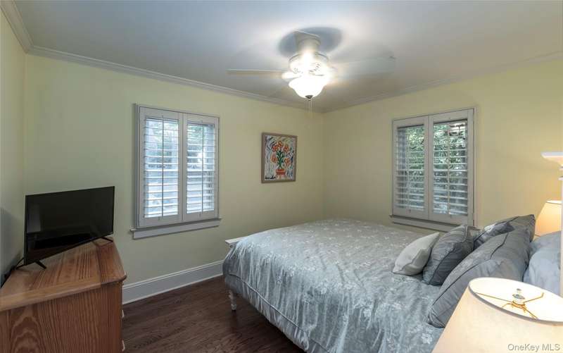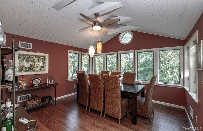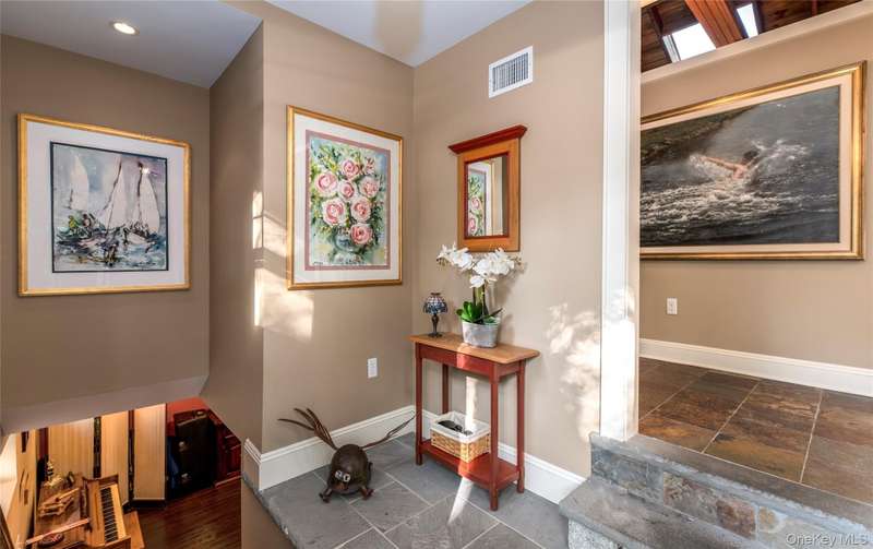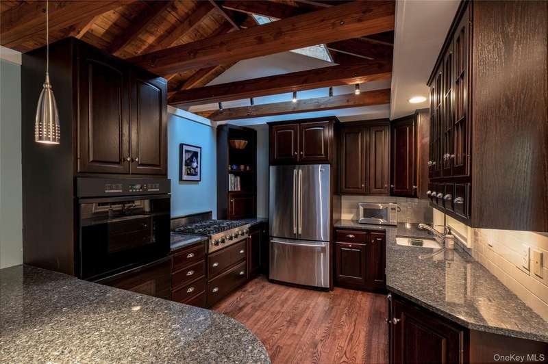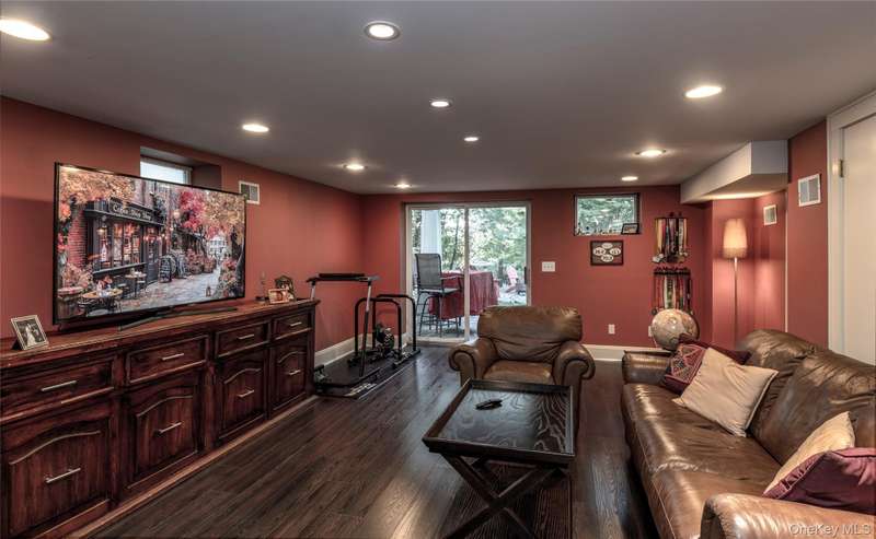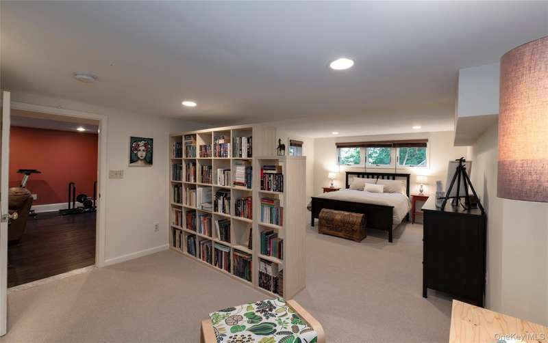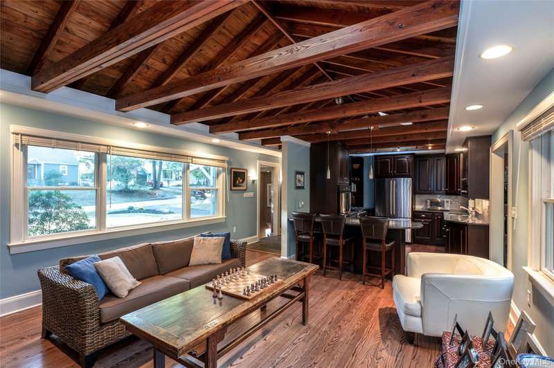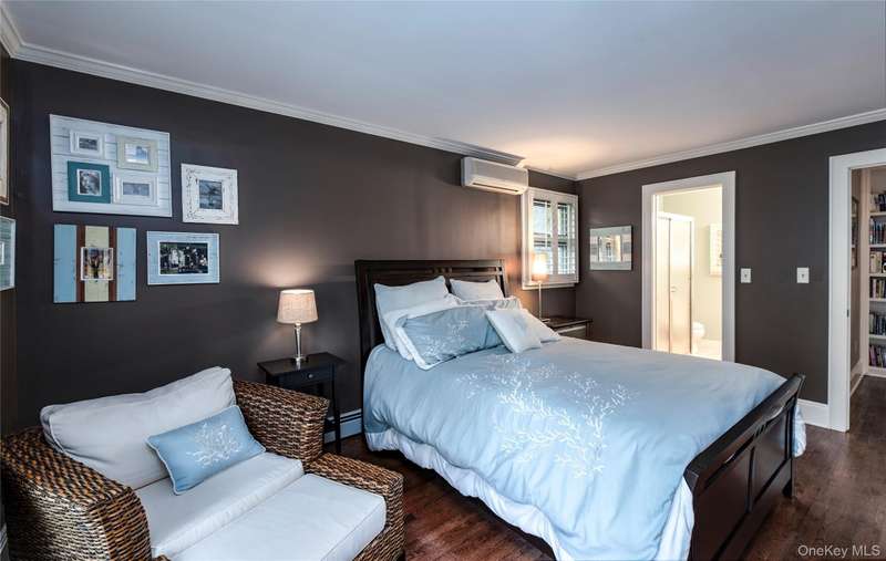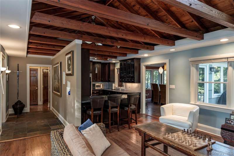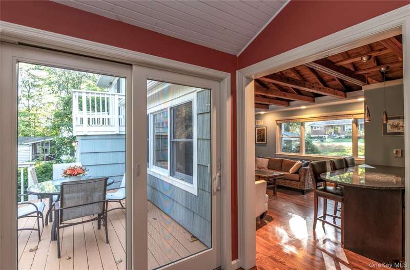 This latest offering in Upper Nyack is just 40 minutes from New York City, in a highly walkable, bike-friendly setting with access to Hook Mountain, town parks and community pools. With 2,600 square feet of living space, it features a distinctive floor plan highlighted by a private primary suite on its own level, complete with full bath, walk-in closet, and secluded deck. The entry foyer leads to a spacious living room with fireplace and beamed ceilings, flowing to an open kitchen with matching beams and a formal dining room with three walls of windows which bring the outside in and open to a double-level deck overlooking the rear yard with firepit beneath a majestic oak. Two additional main-level bedrooms and a full bath provide comfortable accommodations. The lower level continues the open flow with a large family room offering windows and sliders to a brick patio with pergola. A full bedroom with private bath also opens to this patio, creating an ideal guest or in-law suite. Additional features include a circular driveway, one-car garage, freshly painted exterior, and quick closing availability.