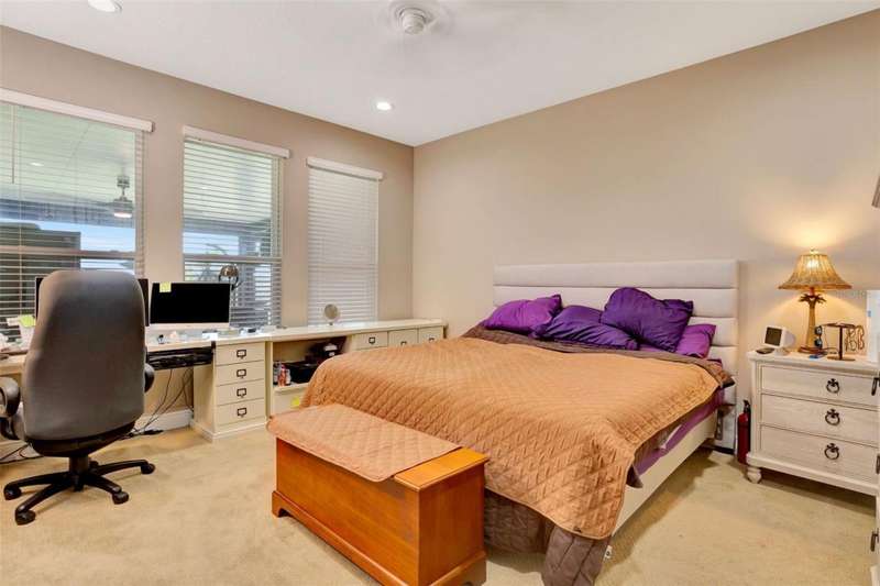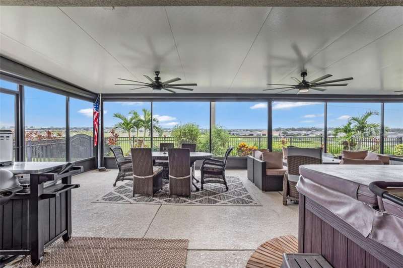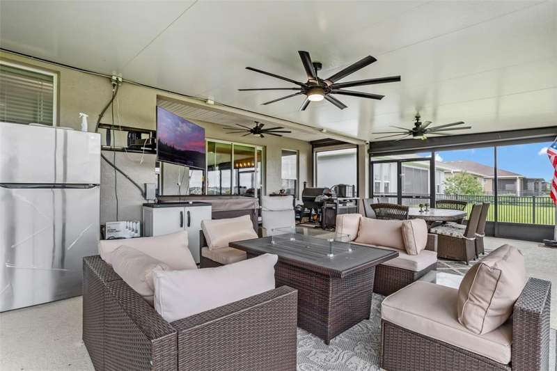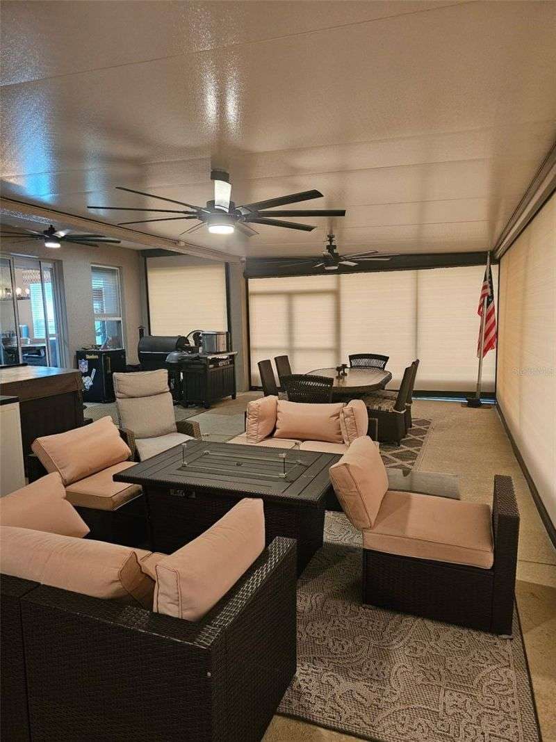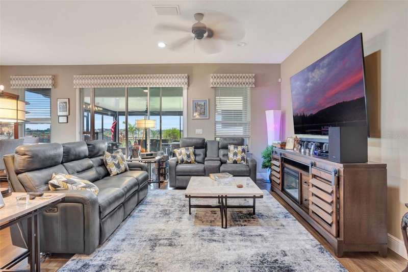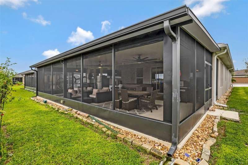 Welcome to your dream home in one of the area's most desirable 55+ guard-gated communities known as Cascades of Groveland or Trilogy! This beautifully maintained 2-bedroom, 2 and a half bathroom plus den residence is loaded with premium features and thoughtful upgrades for effortless, elegant living. Step inside to discover rich hardwood floors throughout the main living areas, an open-concept layout, and a custom-built bar area perfect for entertaining. The stylish kitchen is a chef's delight with a gas range, ample counter space, and high-end finishes. The versatile den offers space for a home office, guest room, or creative studio. Enjoy Florida living year-round on the expansive 40x28 covered and screened lanai, complete with hurricane-grade automatic shades and ceiling fans-ideal for relaxing or entertaining in comfort and style. The home sits adjacent to the community pond which offers beautiful views and the benefit of added privacy. This energy-efficient home also features solar power, helping reduce utility costs while supporting sustainable living. Additional highlights include built-in closets, a laundry room with custom cabinetry, and custom garage storage. Located in a vibrant 55+ active lifestyle community, residents enjoy access to a clubhouse with an on-site restaurant, heated pool, gym, tennis & pickleball courts, walking trails, activity rooms, and a concert/event center that hosts year-round social events. This move-in ready home combines luxury, function, and community in one perfect package. Seller will pay a portion of solar loan at or by closing! Schedule your private showing today!