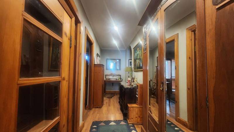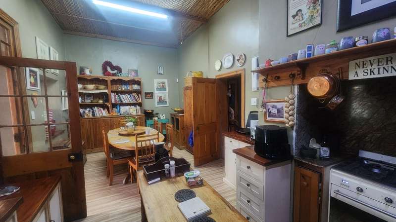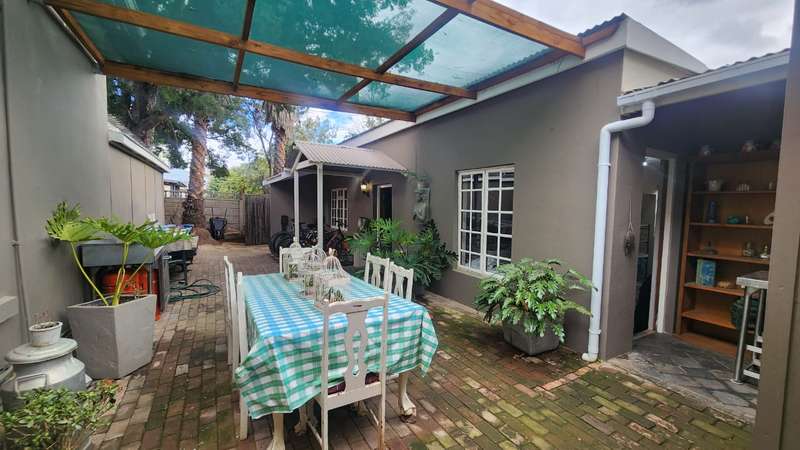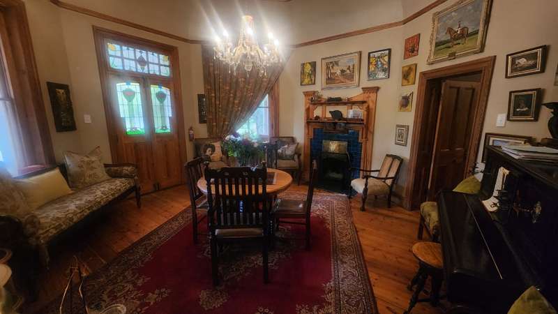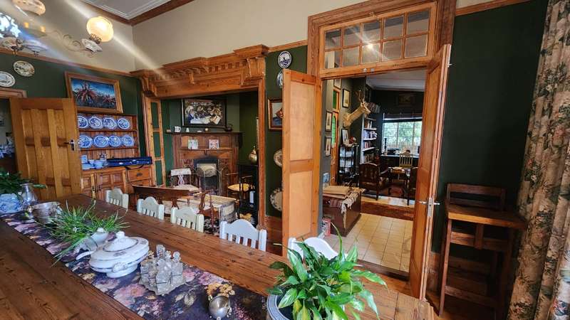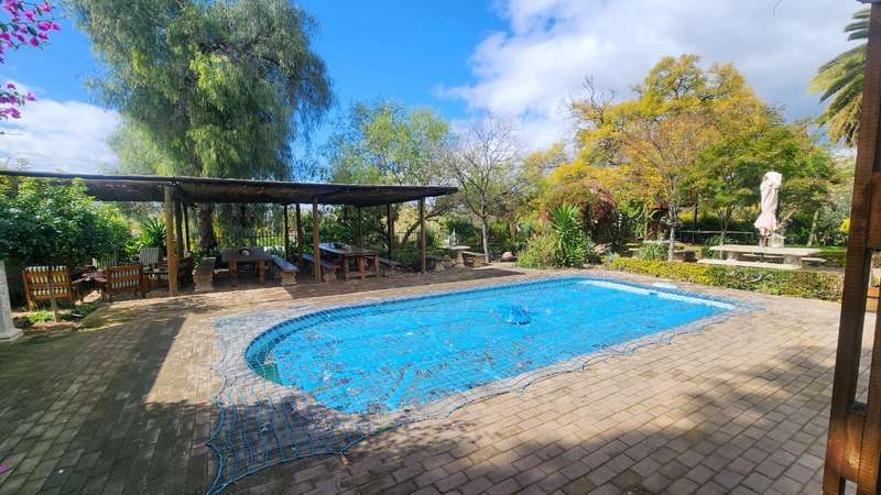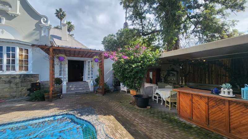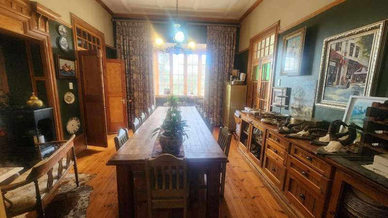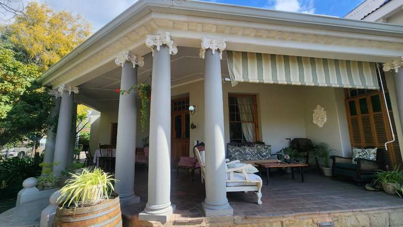 Outeniqua Gables is a charming Cape Dutch home in central Oudtshoorn, blending historic character with modern comforts. Located in a desirable neighborhood, the mansion offers lovely views of the Swartberg Mountains. This beautifully renovated mansion is perfect for those with refined tastes. It features elegant wooden floors, pressed ceilings, chandeliers, and fireplaces, along with a gourmet kitchen and a utility studio for creative projects. Spanning 520 square meters, it features around 11 rooms, including a grand lobby, a one-bedroom flatlet with its own entrance, and spacious living areas. The main house offers three large bedrooms with ensuites and a separate bedroom. The property also includes a larger kitchen suited for catering and hosting small events. Additional highlights include a separate laundry, well-kept garden has ample space for children, including a fun tree house with a swimming pool and covered entertainment area. With air conditioning in all bedrooms, four fireplaces, parking for up to 6 vehicles, and modern amenities like a 5kVA solar system, this gem seamlessly combines elegance and practicality