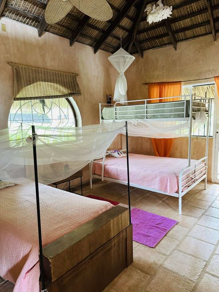 The children's room has twin-size bunk beds, double-height ceilings, a small closet, and room-length open shelves. The cozy guest bedroom on the first floor is facing the tropical garden and the ocean views.
