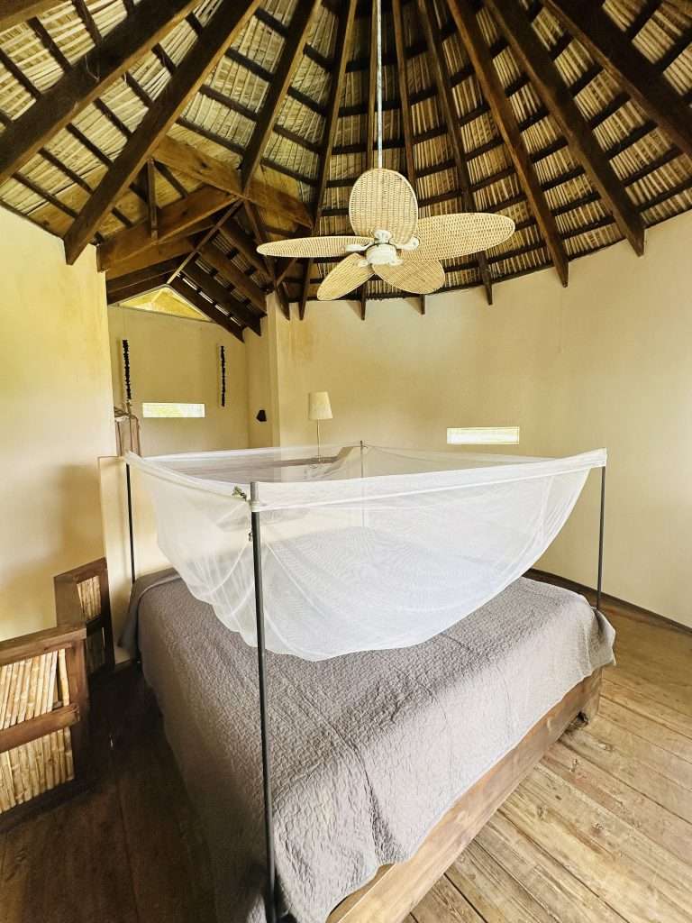 The guest house is a duplex. The first level consists of a living room and a bathroom with a large 'open sky' private shower. The second level has a bedroom with a king-size bed. The large French doors, a balcony, and small openings to all sides guarantee air circulation and cooling.