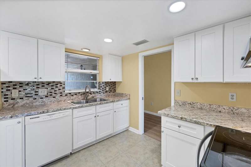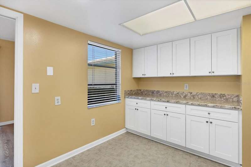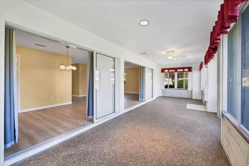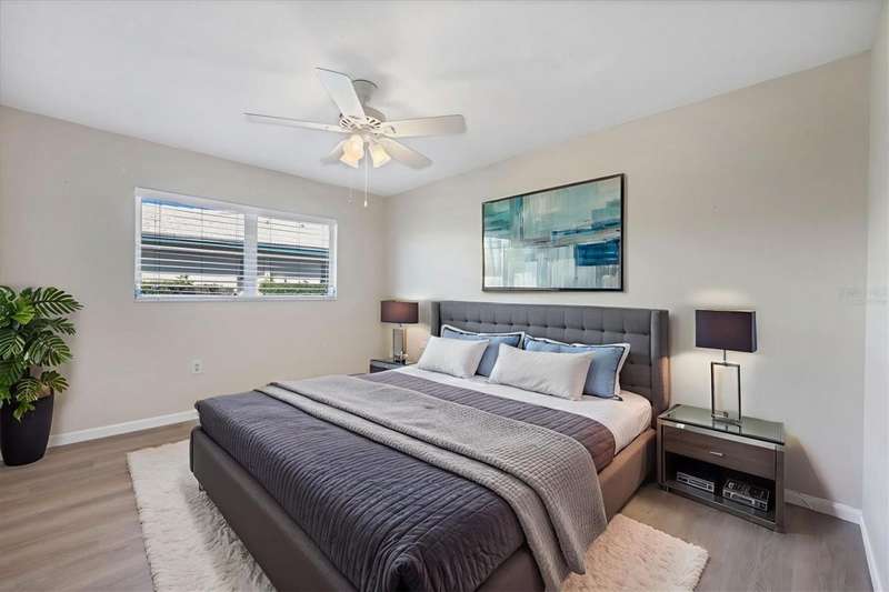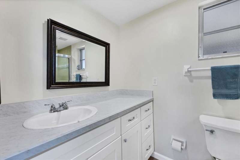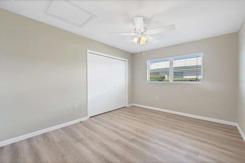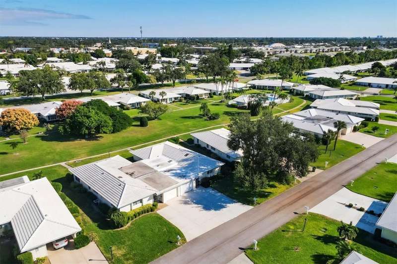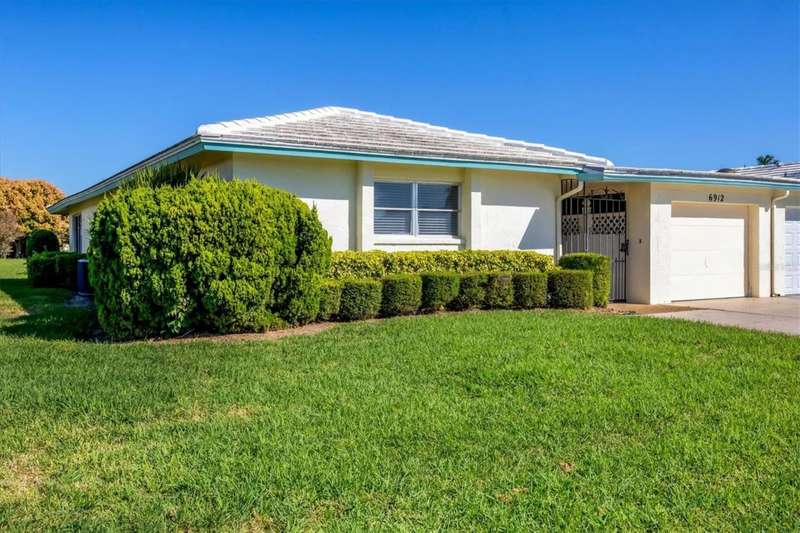 One or more photo(s) has been virtually staged. Located in a prime west Bradenton area, this two-bedroom, two-bath paired villa condominium with a one-car garage is situated within the 55+ Village Green community on a peaceful cul-de-sac, just 5.7 miles from Holmes Beach on Anna Maria Island. This well-priced property offers an excellent opportunity for use as either a permanent residence or a seasonal retreat. The unit is located outside designated high-risk flood zones, thereby minimizing insurance liabilities and improving overall security. The unit has a glassed in Florida room with pleasant greenbelt view. The kitchen now features shaker wood cabinets, dovetail soft-close drawers, a recently purchased refrigerator and garbage disposal. The installation of shaker wood vanities and modern fixtures in both spotless bathrooms has been completed. Other recent updates include laminate flooring, electric garage door opener, hot water heater in 2022, the A/C duct work was replaced in 2014, the air handler and compressor in 2015. Residents may keep one pet weighing up to 15 pounds, pending approval from the board. The condo fee is $433 monthly, but is paid quarterly at a rate of $1,300. This fee covers basic cable, internet, access to the heated community pool, escrow reserves, lawn care, irrigation, pest control, pool maintenance, roof cleaning, and exterior painting. Your insurance policy will be an HO6 policy. Village Green is a wonderful community, offering convenient access to GT Bray Park, Robinson Preserve, Downtown Riverwalk, and SRQ Airport-so don't miss this opportunity. Contact the listing agent to schedule your private showing and enjoy Florida living.