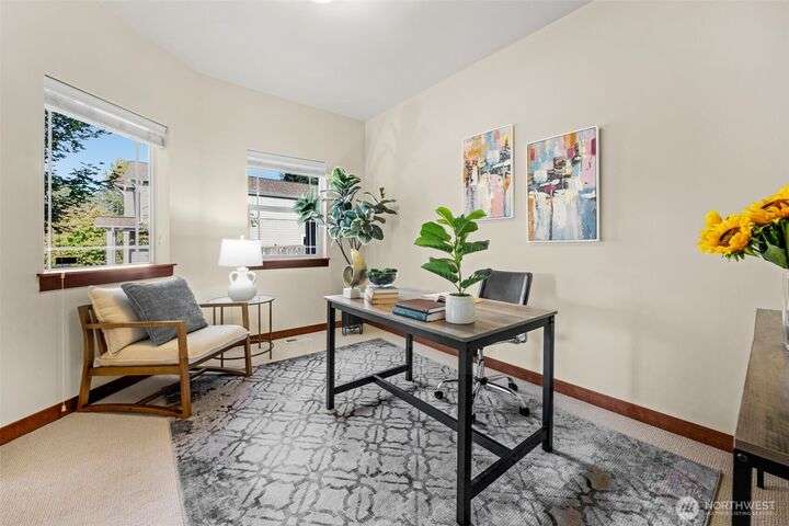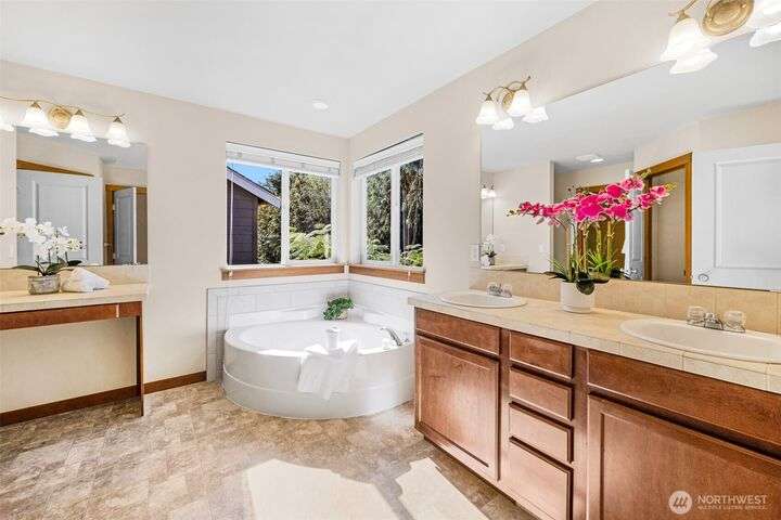 Charming and Spacious 2-Story Craftsman in quiet Mill Creek Terrace. Front arbor and covered porch lead to a welcoming interior. An open concept floor plan with fine features - solid oak flooring, high ceilings, & fine millwork. Gourmet kitchen with tile counters, seating bar, shaker cabinets, opens to a western-facing dining area & cozy living room with a gas fireplace. Den/office space too. Your primary suite with a 5-piece bath and walk-in is set apart from 2 generously sized bedrooms by a versatile open loft space. Fully fenced back yard features a deck & patio for extra entertainment space. Superb location is a mile+ to the popular Mill Creek Town Center. Close to parks, trails, & many amenities. Quick to I-5, 1-405, & transit options