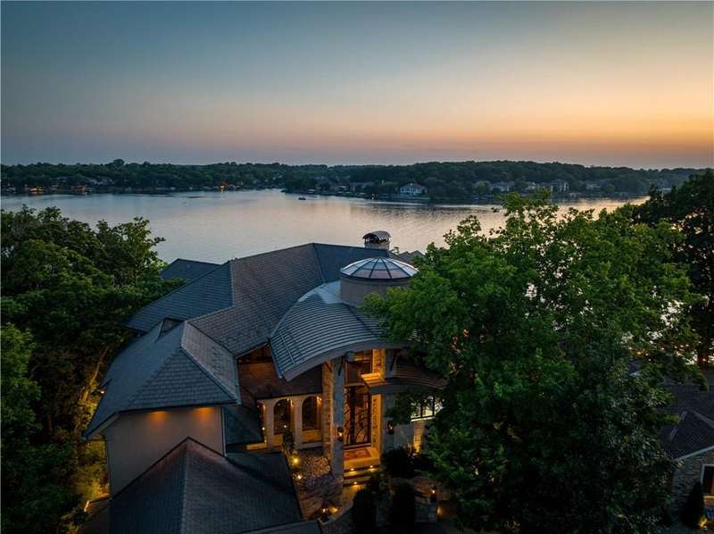 With an expansive lake front view, this home was designed for grand-scale entertaining yet tranquil retreat living. A museum-worthy 1,000 bottle wine room and glass dome-topped, free-floating 3 story spiral staircase greet you upon entering custom front doors. Prepare to be wowed by a 26-foot barrel wood ceiling, extending thru the home, and 900-gallon living reef, saltwater aquarium. High-end finishes/fixtures throughout include natural stones, rare woods, Labradorite main kitchen countertops, and hand-blown glass Chihuly chandelier. Stunning architectural ceilings include one-of-a-kind dining room ceiling - truly a work of art. Private Primary Suite hallway with marble mosaic floor, beverage bar, and stairway to the library & gym/spa. Suite includes fireplace, home theater system, steam shower, and deck access. Telescoping enclosure enables year-round use of infinity-edge pool. Lovely al fresco deck-dining with outdoor kitchen, custom granite 22-person table, fireplace, TV, & lake views. Indoors connects to outside via LL bi-folding doors, spa room and deck staircase. Lush, extensively landscaped grounds include gas torches, fountains, waterfalls, lighting, & integrated, computer-driven bug suppression system. Double boat dock with 4 hydro lifts. Appreciate the convenience & comfort of a 5 stop/2 door elevator, the latest smart home integrated system, 2 laundry rooms, dog shower, greenhouse, back-up generators, and heated driveway, steps, deck, main & lower-level European limestone floors. Midwestern-friendly, the Lake Winnebago community and well-stocked, 400-acre lake include many amenities. Why vacation at the lake when you can live the lifestyle every day? Home located less than 30 min from KC, in Lee's Summit school district.