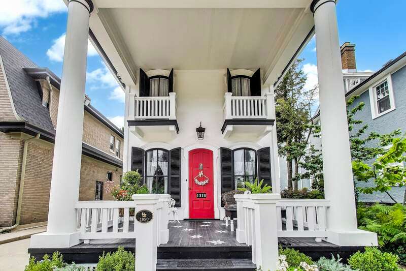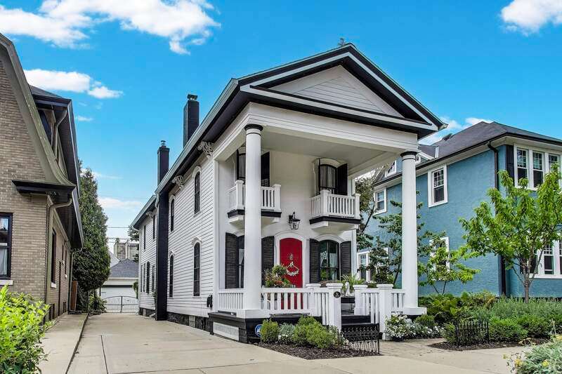 Seller offers $5,000 credit towards Buyer closing costs and rate buy down. Absolutely picturesque downtown historical home in Victorian style with Greek revival elements, built circa 1850, known as The Engle House. Unwind on the prominent front porch featuring grand 2-story columns with classical Doric capitals, crowned by a bold pediment, & enjoy scenic views of Lake Michigan to the SE. Fenced backyard, custom driveway gate, and Trex composite deck (new 2021). Inside, discover a beautifully restored, stately residence showcasing a remodeled kitchen, formal living room with natural fireplace, and an elegant dining room adorned with exquisite wallpaper from House of Hackney. Updates include: New roof (2018), Chimney cleaned/relined (2018), New HVAC (2022), Kitchen remodel (2023), and more!