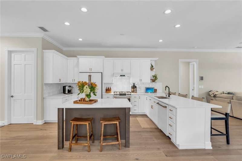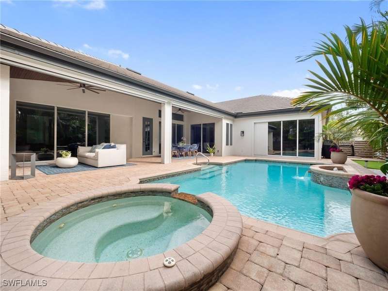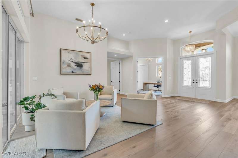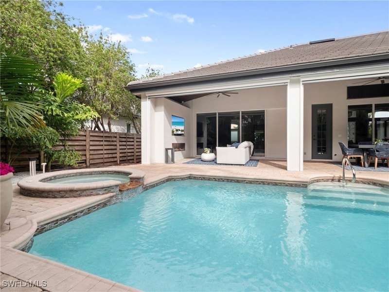 Welcome to 11451 Compass Point Drive in the exclusive Edgewater neighborhood of Gulf Harbour Yacht & Country Club. This gorgeous, serene fully furnished, 4 bedroom 3 bath pool home was recently renovated with new white oak hardwood flooring, new kitchen and bathrooms and new lighting throughout. The beautiful, renovated kitchen boasts a newly re-worked floorpan with an island offering additional counter, cabinet and seating space, new GE appliances and gas cooking (propane added in 2024). The open floor plan connects all of the living areas, making this home a perfect place for entertaining friends and family. Step outside to discover your very own totally private tropical oasis with a spacious lanai and sparkling saltwater pool and spa. Cozy up in front of the new outdoor fireplace or practice your putting skills on your very own putting green. End your day in the gorgeous and serene primary suite where you'll enjoy the new freestanding tub in the newly renovated primary bath with walk in shower, dual sinks and 2 walk in closets. Three additional bedrooms offer plenty of space for family or visitors. (The 4th bedroom is currently being used as an office). The 3 car garage offers plenty of space for cars and golf carts and to top it off, The new roof in (2022) and HVAC systems (2023) offer you peace of mind. This home is located in the prestigious Gulf Harbour Yacht & Country Club, where separate membership offers access to a championship golf course, tennis courts, a fitness center, and a marina. (Membership is an additional fee). Close to restaurants, shopping, beaches and schools, it's the perfect location to make your next permanent or vacation home. Don't wait! Make an appointment for your private tour today.