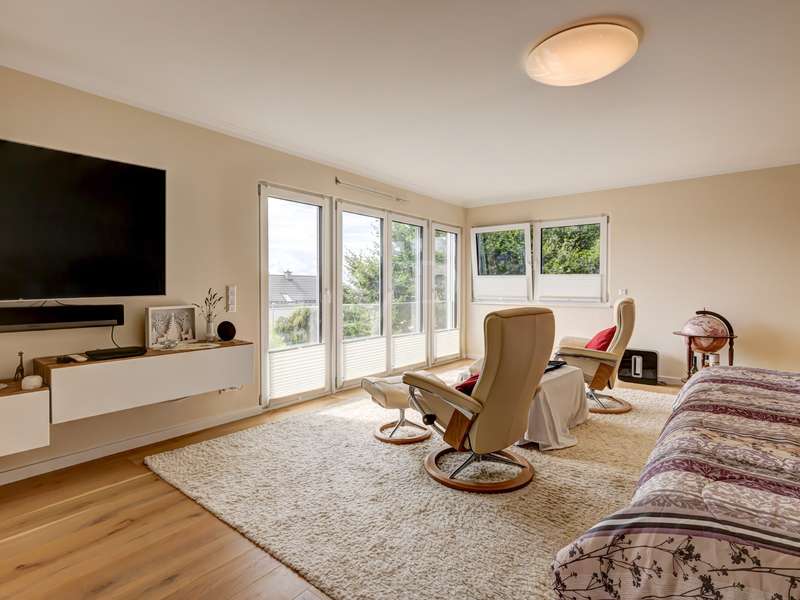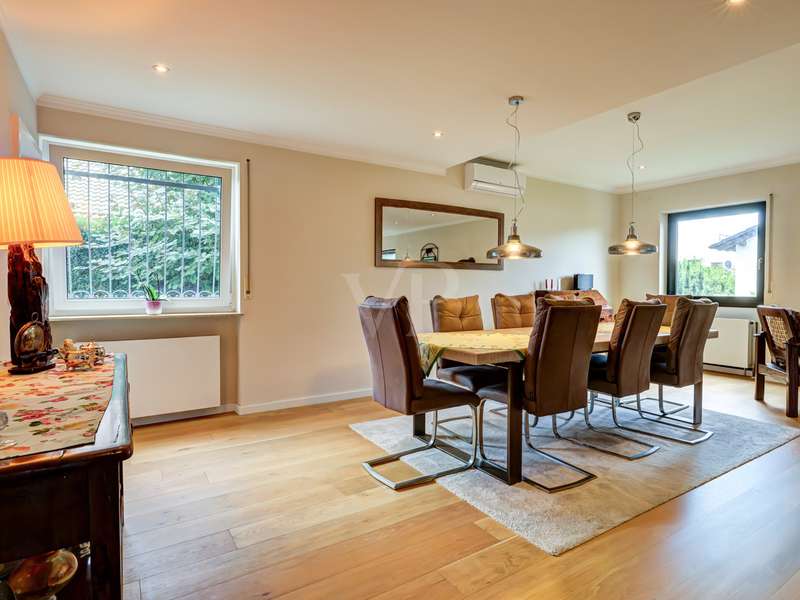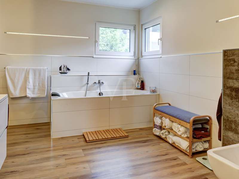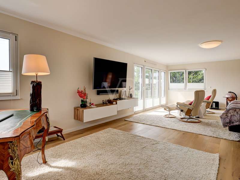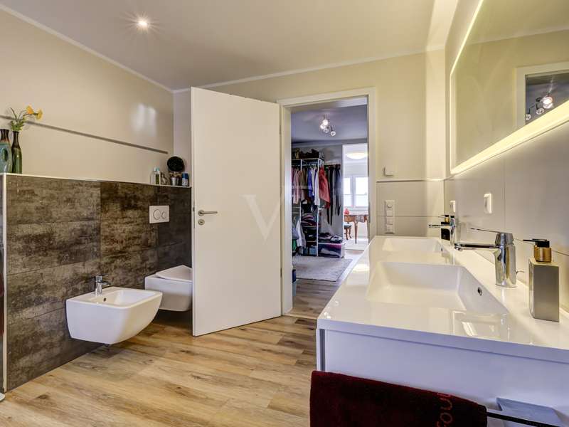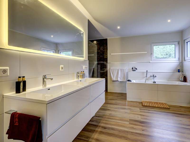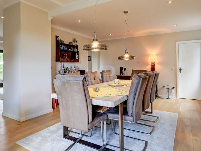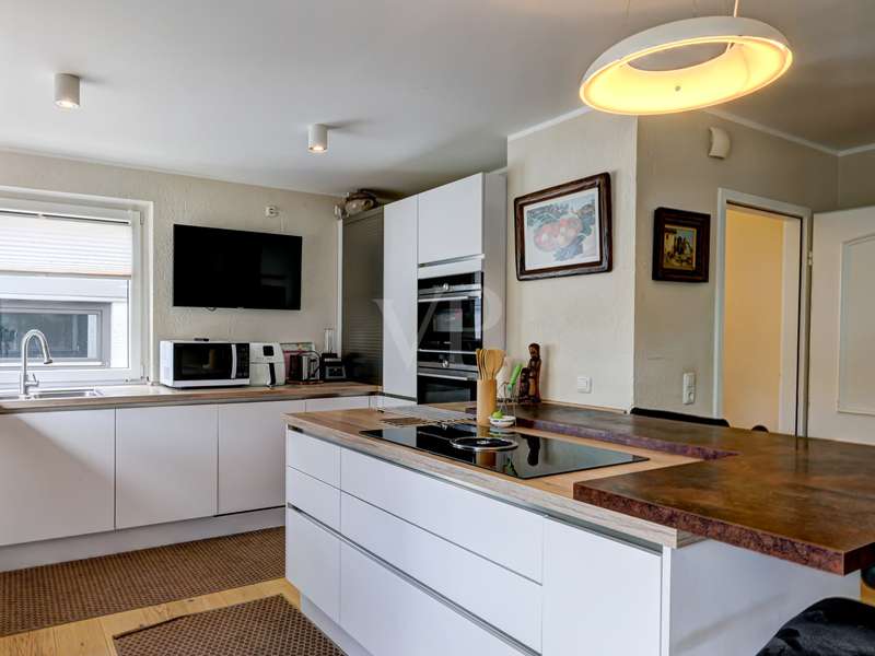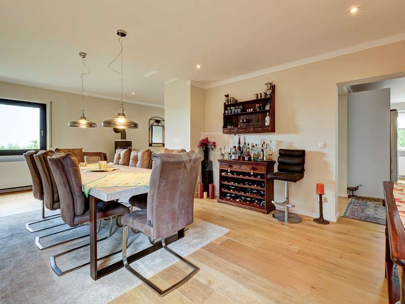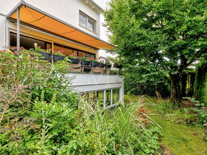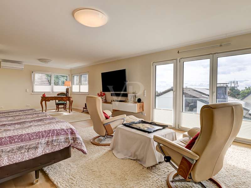 Spacious living - detached house with granny annexe in a preferred location in Königstein-Falkenstein. This detached family home combines a high level of living comfort with well thought-out architecture, modern fittings and the tranquillity of a residential area close to nature. Located in one of the most sought-after districts of Königstein - in idyllic Falkenstein - the property offers almost secluded privacy on a lovingly landscaped plot of approx. 486 m². Space for the whole family - on three floors with many possibilities The house was built in solid construction around 1977 and extended in 2019 with a high-quality upper floor in timber frame construction. With an impressive living space of around 282 m² on three floors, the property offers spacious retreats for all phases of life - from everyday family life to intergenerational living. The air-conditioned first floor impresses with an open-plan living and dining area that is flooded with light thanks to floor-to-ceiling windows. The modern fitted kitchen with central cooking island invites you to enjoy convivial evenings, while the wood-burning stove creates a cozy atmosphere. The adjoining terraces offer sunny outdoor areas with a high recreational value. The private parents' area on the upper floor is clearly separated from the children's wing and boasts a dressing room, bedroom and a stylish master bathroom with double washbasin, shower, bathtub, bidet and atmospheric lighting. The as-new upper floor with underfloor heating and air conditioning in the bedrooms offers absolute living quality. Another plus point: the easily usable attic with spectacular distant views. A house with many facets - also conceivable as a multi-generational solution The garden level not only offers plenty of storage space, but can also be used as a granny apartment thanks to a separate living room with garden access, a bedroom, a bathroom and a room with kitchen connections - ideal for guests, au pairs or for renting out. In 2008, the entire house was excavated and fitted with an impermeable drainage system. A large single garage with wallbox, an additional outdoor parking space and modern building services including a PV system round off the offer. Conclusion: A versatile home in a sought-after location that appeals to both families and discerning couples - with plenty of space, a well thought-out layout, high-quality fittings and the option of flexible use. The forest, nature and leisure facilities are right on your doorstep - and yet you have excellent connections to the Rhine-Main region.