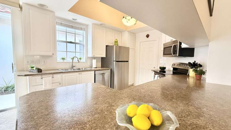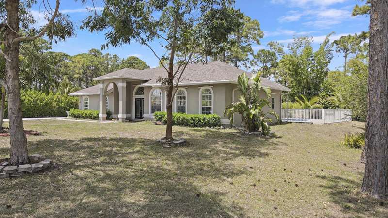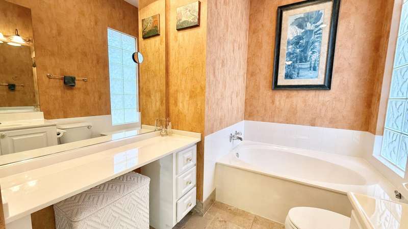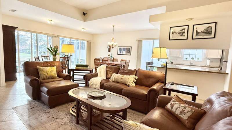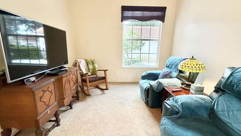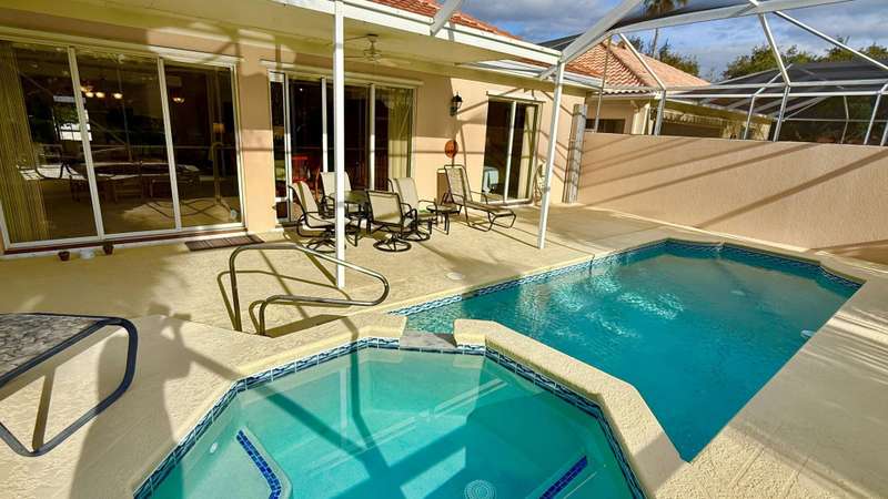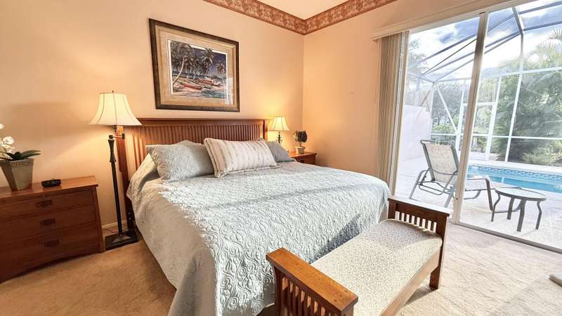 Stunning Oakmont model single-family home ideally situated on a quiet cul-de-sac with stunning lake views! This 3-bedroom plus den, 2-bath residence offers a bright open floor plan with soaring 12-foot ceilings in the great room, arched windows in the den and abundant natural light.The spacious primary suite features a unique his-and-hers bathroom arrangement and generous closet space. Tiled flooring throughout the main living area. Enjoy outdoor living at its best with a custom pool overlooking the lake and plenty of patio space for relaxing or entertaining. Additional highlights include a side-load 2-car garage with extra parking, laundry room with utility sink, and a new roof (2024) for peace of mind. Conveniently located just a short distance from the communitys town center amenities