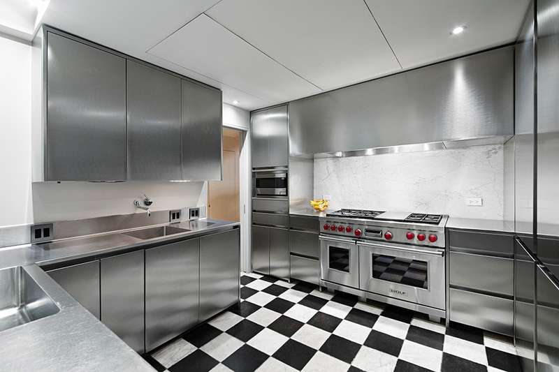 A semi-private elevator landing opens to the gracious Gallery, anchored by an elegantly curving staircase. The impressive corner Living Room, Dining Room, and Library are arranged in a seamless enfilade, all with expansive Park Avenue outlooks. The Living and Dining Rooms both have imported 18th-century parquet floors, and all three feature gas fireplaces. Nearby, a sleek chef's kitchen features custom stainless-steel cabinets and countertops. From the Gallery a coat closet and a Powder Room are conveniently accessible.