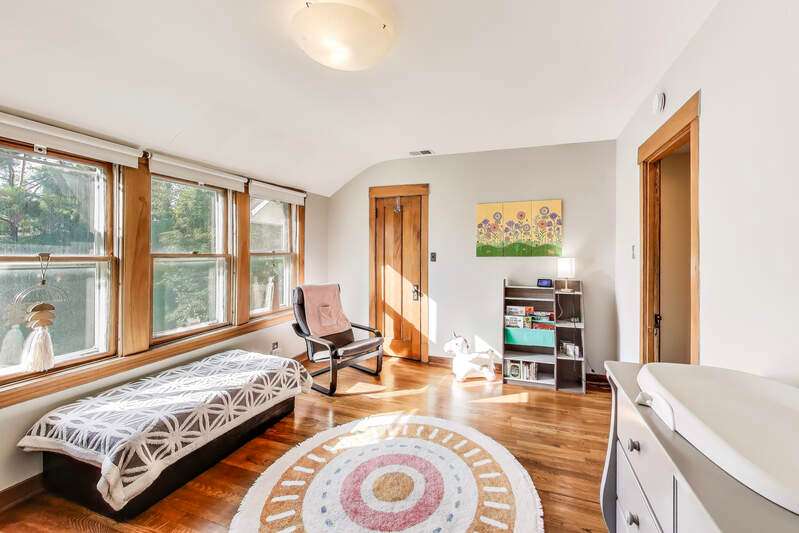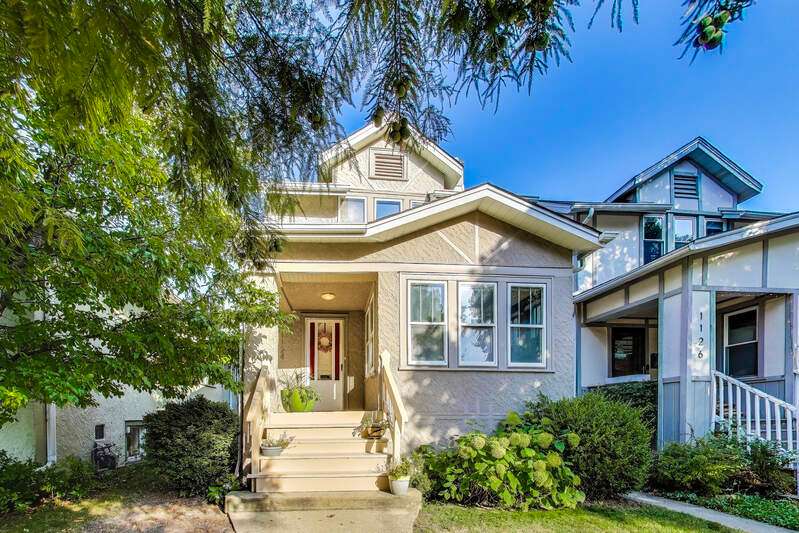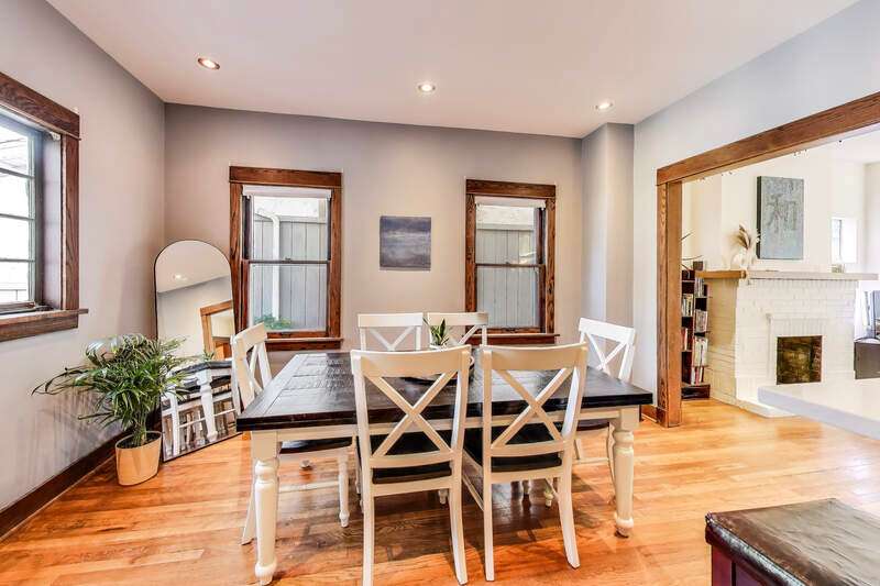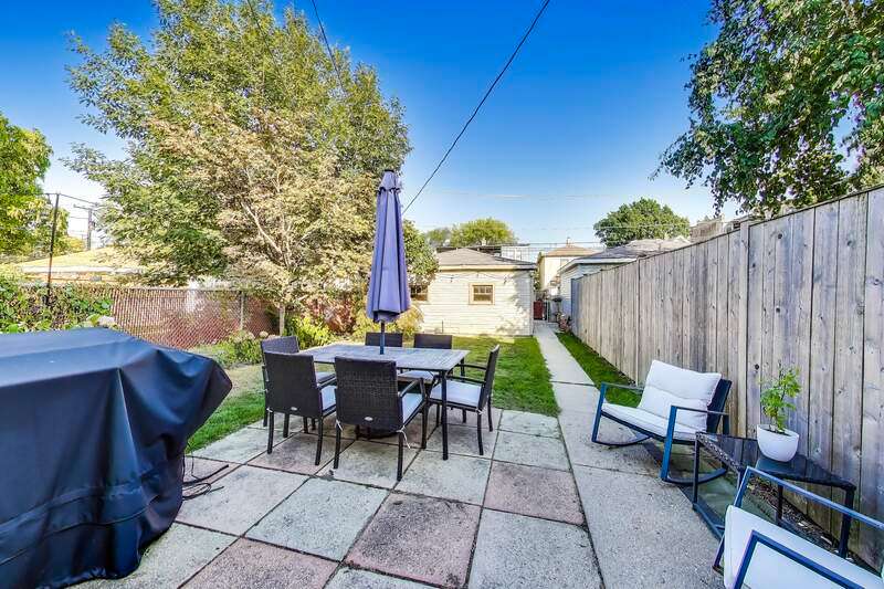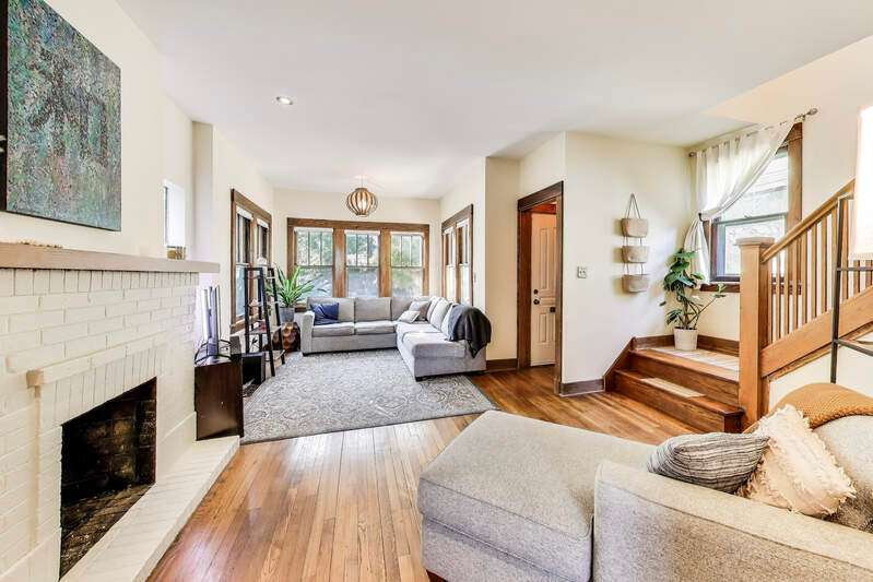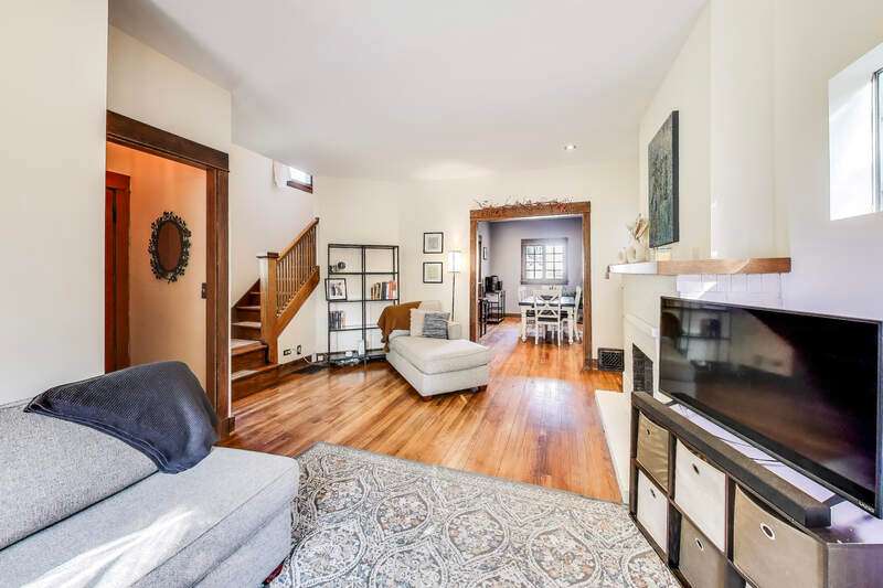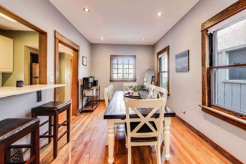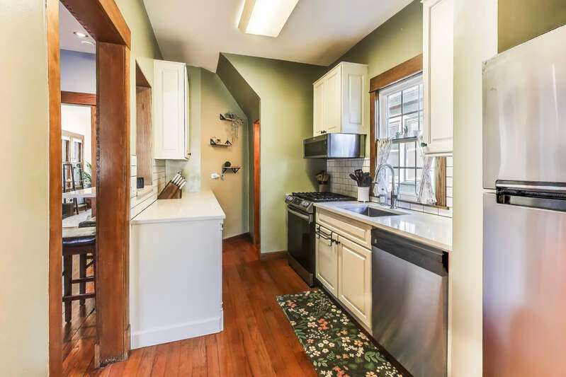 Absolutely adorable two story in the coveted Arts district - updated while still maintaining it's vintage charm! Light filled living room with high ceilings, hardwood floors and trim opens to a dedicated dining room. The kitchen, renovated in 2022, has been opened up with a coffee/breakfast bar for a more open concept while boasting quartz countertops and stainless steel appliances. A cozy back room used as a playroom would also make a great office and has windows looking out to the private, fenced and landscaped yard. Two bedrooms up; both spacious, both with large closets, and filled with character. Second floor bath is also updated! The full basement has lots of space for storage, extra office space, or finish off for family room space. Two car detached garage. Ideal location near CTA Blue line, Arts disctrict shops, park, conservatory, etc!