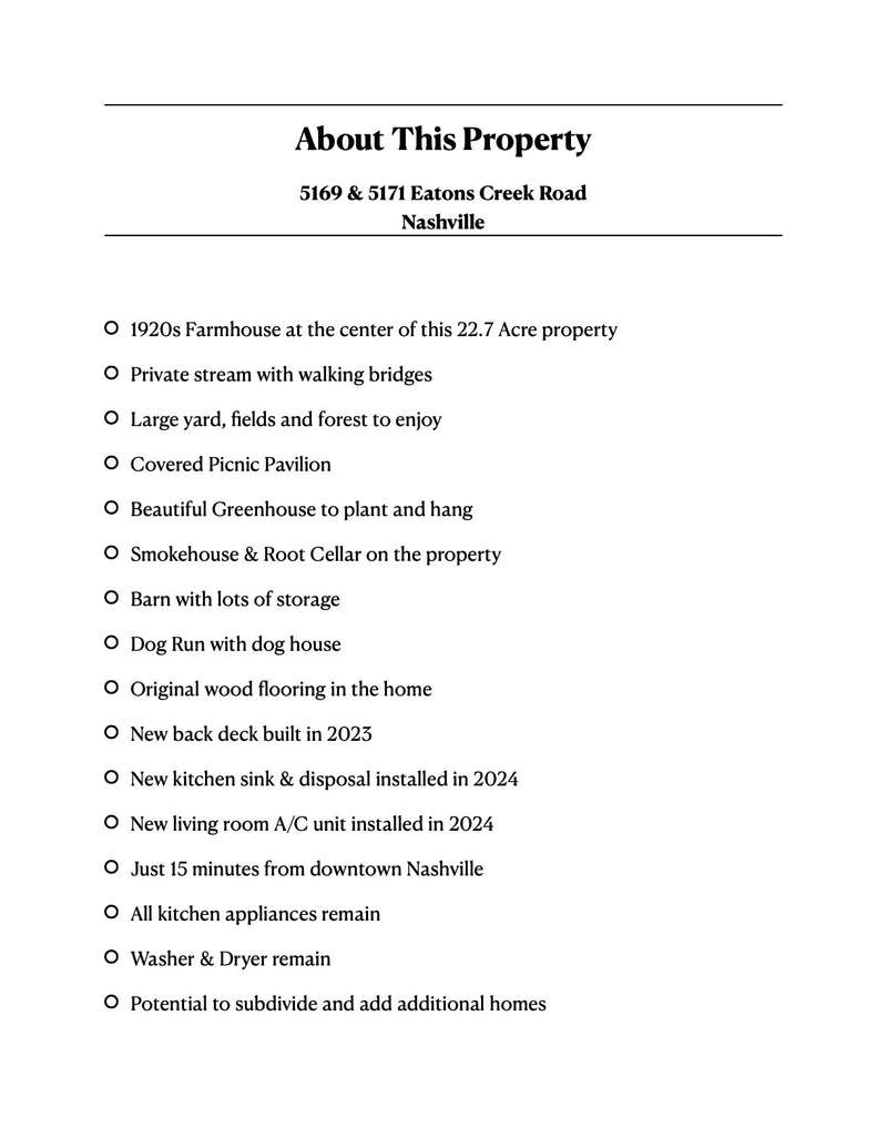BIG price change and lender incentive offered! Make this your dream property or a family compound. A truly unique property - sprawling across nearly 23 lush acres - just around the corner from Beaman Park and 15 minutes from downtown Nashville. At the center of the property stands a 1920s farmhouse ready for someone excited to do the work to make it their own. This home offers a unique opportunity for the right buyer - it provides a solid foundation and plenty of potential to create the space you've always envisioned. The primary bedroom features an ensuite with a separate shower and a clawfoot tub. A second full bathroom and an additional bedroom--currently styled as a dressing room--are also on the main level. Enjoy the cozy den and large windows in the open-concept living area - which flows seamlessly into a thoughtfully designed kitchen. Gorgeous double glass doors open from the kitchen to reveal a stunning backyard oasis. Step outside and discover the magic of this property: complete with charming walking bridges. A stone path leads from the new back porch to a large picnic pavilion with storage--ideal for gatherings or quiet moments in nature. Explore the barn, and open fields that stretch out in every direction, offering endless opportunities for gardening, farming, or just enjoying the wide-open space. A large fenced dog run offers plenty of space for dogs of any kind to run around and enjoy nature. With the ability to subdivide you can build up to four additional homes, this property is not only a private paradise but an incredible opportunity. Its lush scenery and timeless charm have made it the backdrop for multiple music videos--proof of its undeniable appeal and storybook setting. Whether you're seeking a peaceful escape, a creative sanctuary, or a multi-use property with development potential, this rare offering delivers it all. Come experience the magic for yourself! Home will need TLC and is being sold as-is. Sellers to make no repairs.