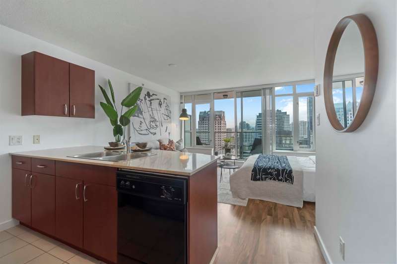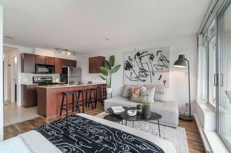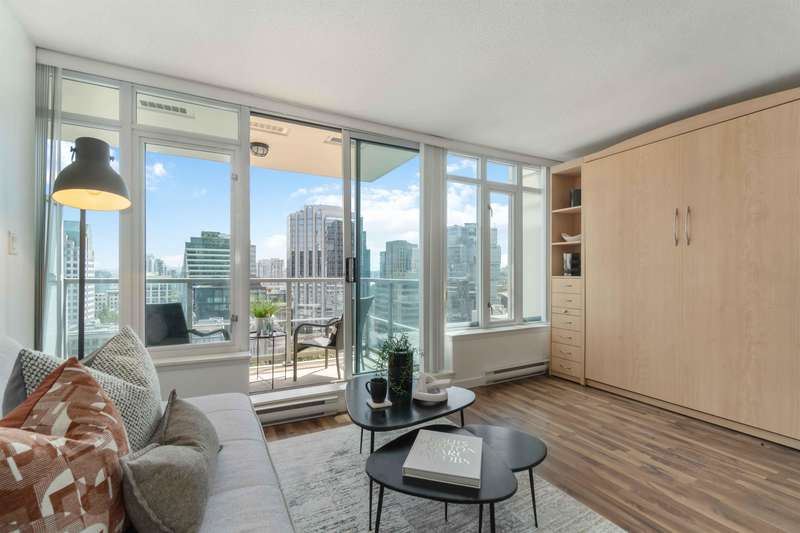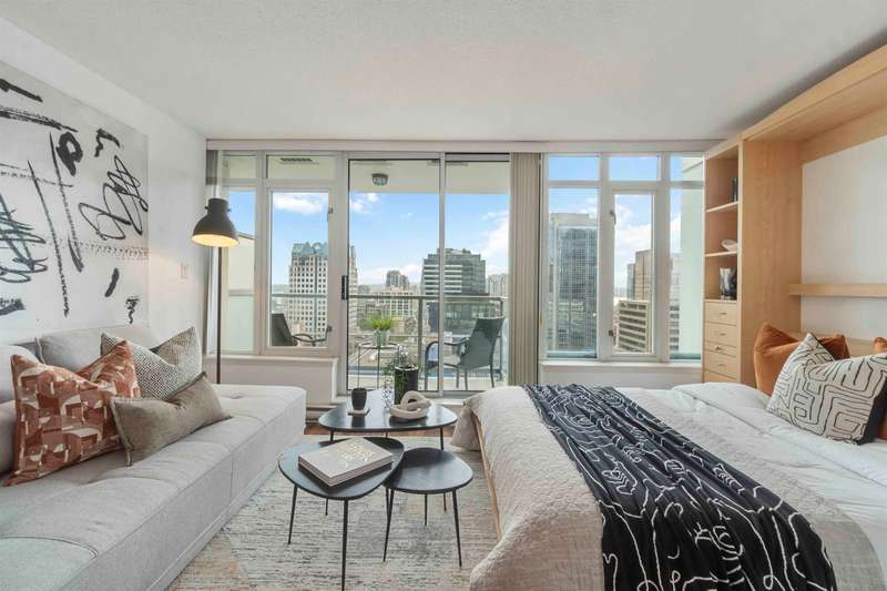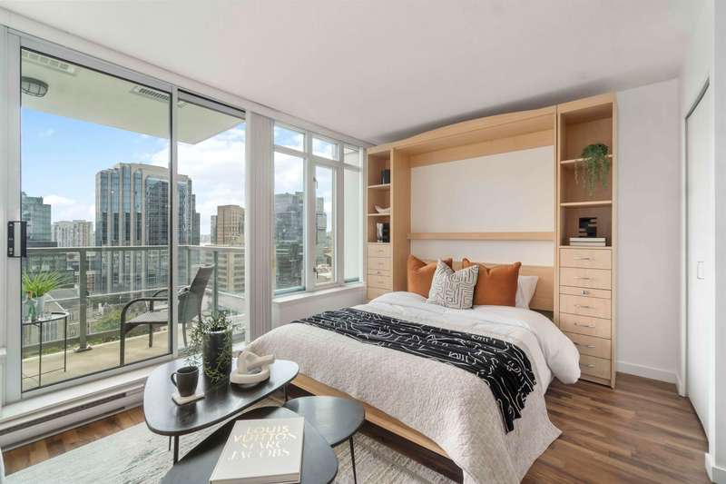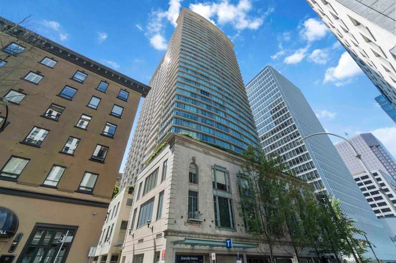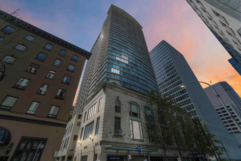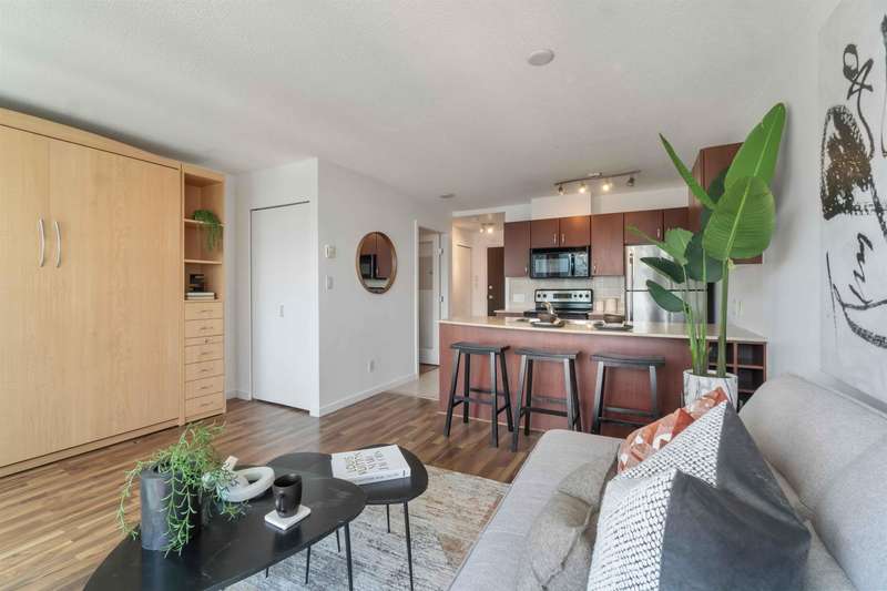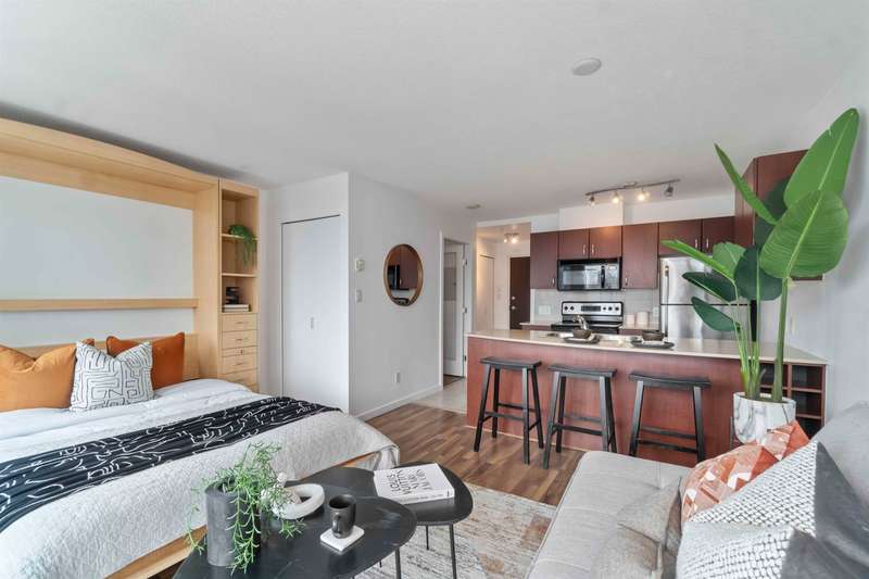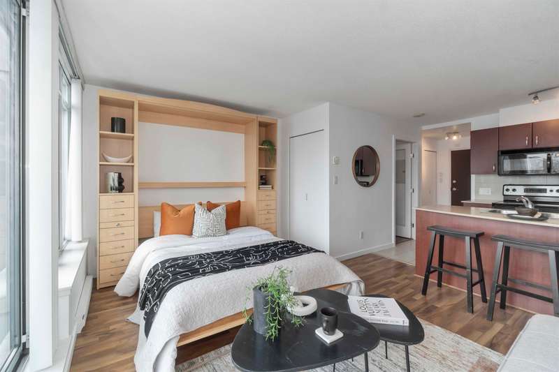 The Hudson – ultra-efficient studio with wall bed and zero wasted space. Large kitchen with full size appliances, double sink and ample cabinet & counter space. This unit has been freshly painted and is ready to move in. Open eastern exposure offers a morning sunrise and sweeping city, mountain, and water views from the covered balcony. DIRECT elevator access to Granville SkyTrain platform. Low strata fees at $240/mth but still offers 24-hour concierge, gym, lounge, visitor parking, ample bike storage, and a unique LIVE/WORK zoning. Exceptionally managed with on-site property management, proactive strata, and a strong $1.4M contingency. Move in today to this ideal downtown starter or investment property.
