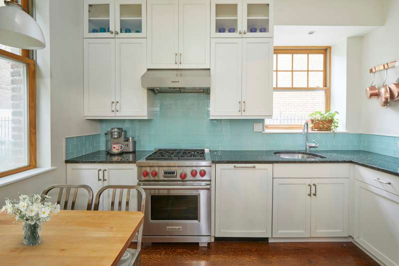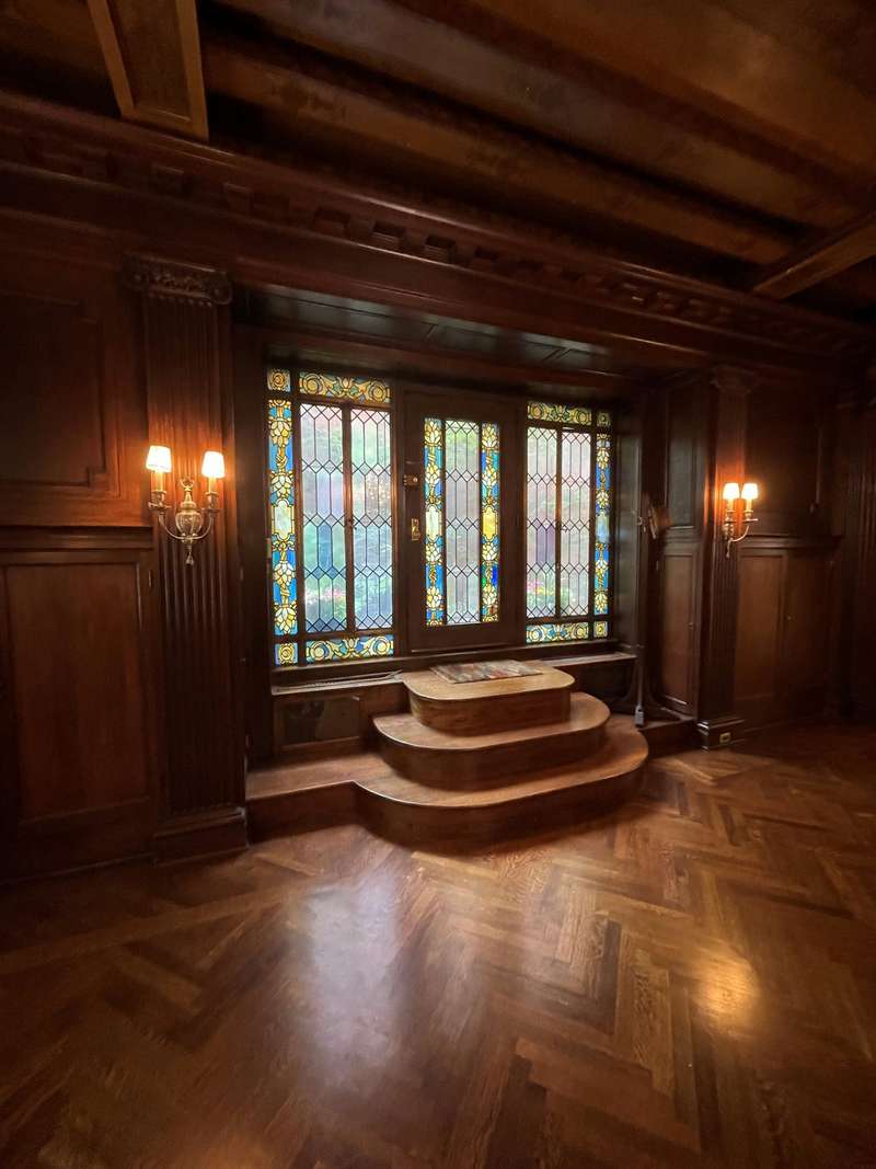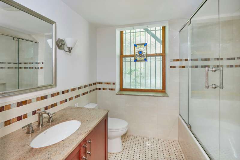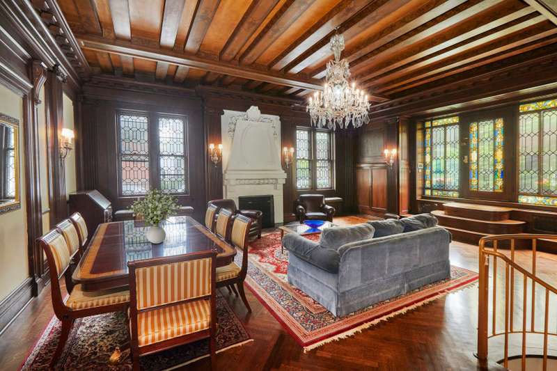 Accessed through a private entrance in the rear of the building that leads to a truly magical space -- what was once the grand dining room of this landmark home. It offers two exposures, with wide spans of leaded and stained-glass windows, a stately decorative fireplace, window seats and built in cabinetry. It is used as an oversized living and dining room. It opens on to a modern, renovated kitchen. Wonderfully designed, with custom cabinetry and top-notch appliances, including a stainless-steel Wolf stove and an integrated Sub-Zero refrigerator and Bosch dishwasher. It also has two windows and built-in seating.