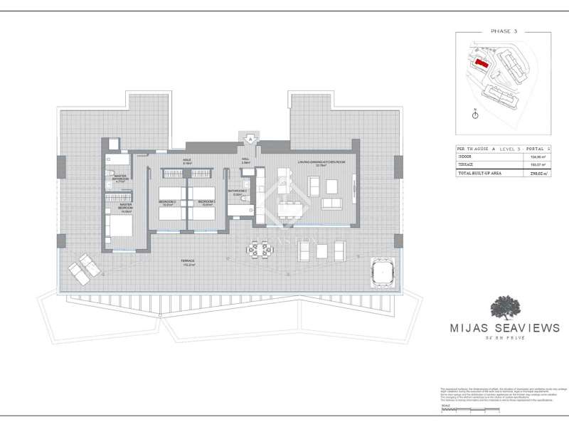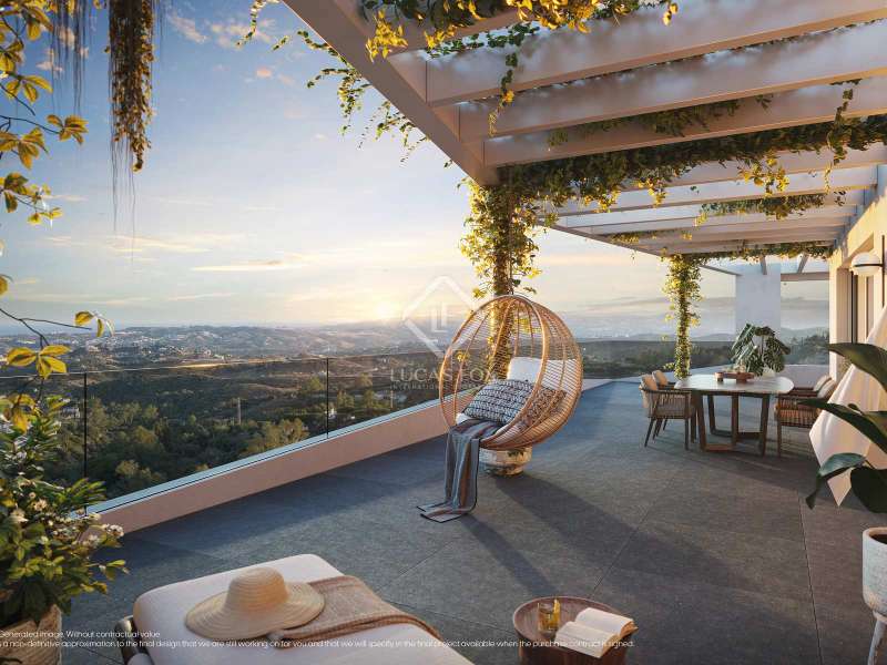 Mijas Sea Views Apartments is a unique residential complex where quality, nature, comfort and innovation come together to provide an enviable lifestyle in a prime location in the mountains of Mijas with the beaches of Fuengirola on the doorstep. The complex consists of 50 south-west facing apartments divided into 3 construction phases. This particular property is an exclusive penthouse apartment with an open-plan living, dining and kitchen area, 3 bedrooms and 2 bathrooms, as well as a spectacular wrap-around terrace. The buildings have been designed with a focus on privacy, incorporating hanging gardens that fall down the facade, also blending the development into its natural surroundings. The landscaped areas with walkways and hanging gardens envelop the private amenities of Mijas Sea Views, offering an outdoor infinity pool, a separate children's pool, a wellness area with a sauna, Turkish bath, a grill area and fully equipped functional training space. The apartments are flooded with natural light, creating a warm and welcoming atmosphere, with a spacious open-plan living and dining area, bedrooms with en-suite bathrooms, walk-in wardrobes and a private jacuzzi in the case of the penthouse properties. The buyer may choose from an extensive range of finishes for flooring and tiling, fittings and toilets, as well as different finishes for kitchen furniture and extras to give the apartment a touch of distinction. The standard finishes and features include porcelain stoneware flooring throughout the home, bathrooms with Solid Surface showers, Laufen sanitaryware and fittings from Hansgrohe or similar brands. Italian-designed kitchens from the renowned Italian brand Arredo3 or similar brands come fully equipped and furnished, with high and low cabinets, Silestone countertops and appliances from Siemens or similar brands, the majority of which have an "A" energy rating. Climate control, home automation and video entry systems are just a few more of the contemporary luxuries found in these brand-new homes. One parking space and storage unit is provided per unit, with pre-installation for a recharge station for electric vehicles in the garage. Please contact our team for more information regarding this excellent new penthouse on the Costa del Sol.