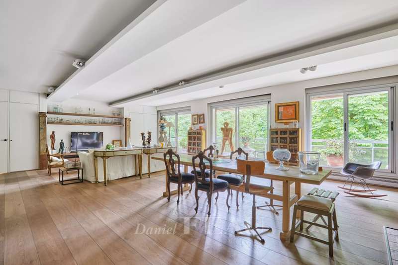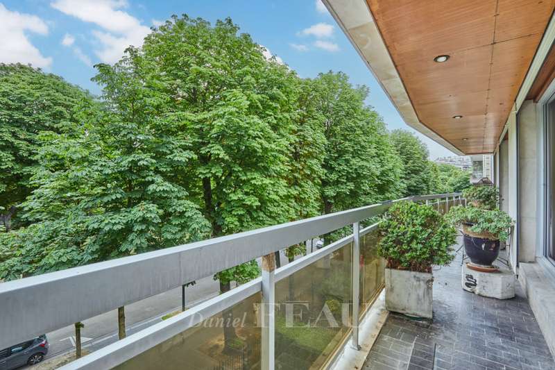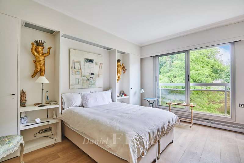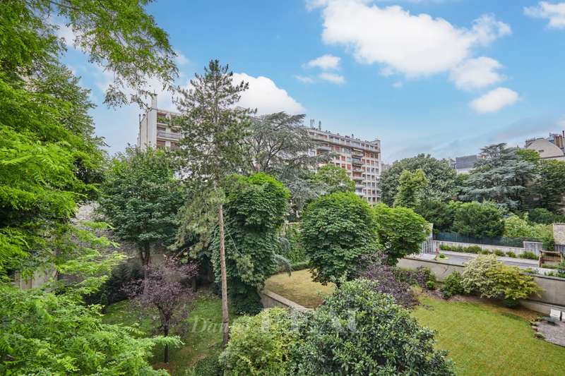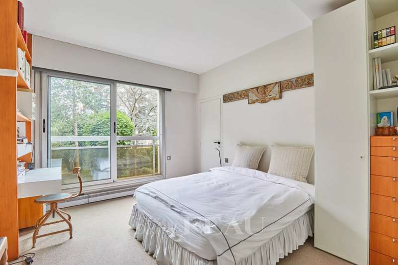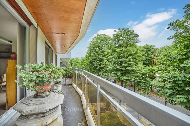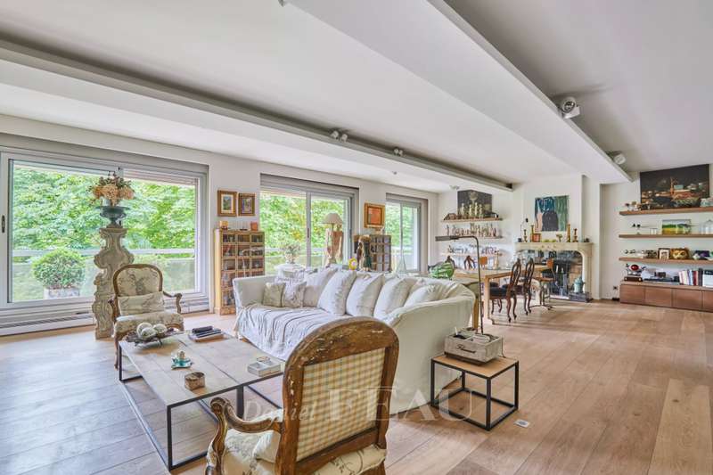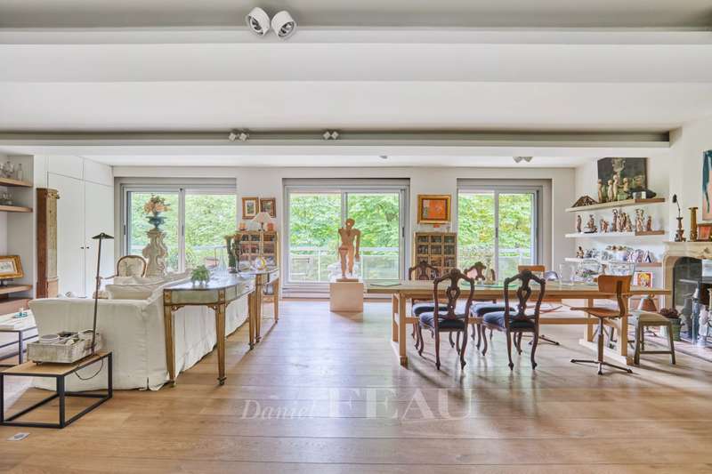 Avenue Raphael/Ranelagh Gardens. This bright and peaceful 215 sqm apartment on the 3rd floor of a luxurious relatively recent building is in very good condition. It includes an entrance hall, a spacious living/reception room opening onto a 14 sqm balcony, a dining room and kitchen overlooking Ranelagh Gardens and enjoying a view of the Eiffel Tower, three bedrooms overlooking a peaceful garden, two bathrooms with a wc, a dressing room, a utility room and a separate wc. With a 14 sqm staff bedroom in the apartment and a cellar. Two lock-up garages (one single, one double) may be acquired at extra cost.