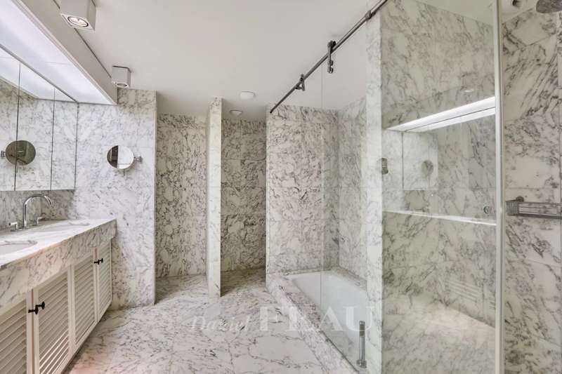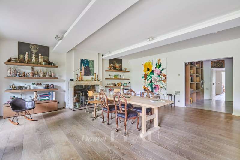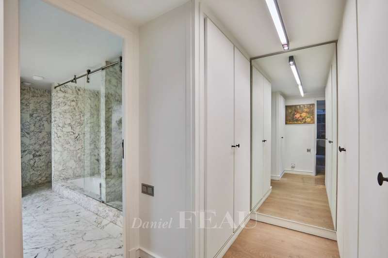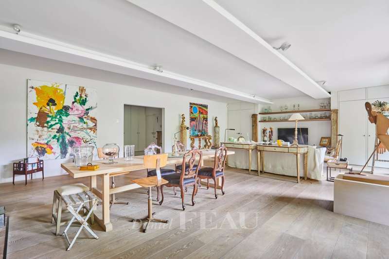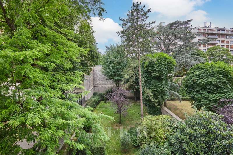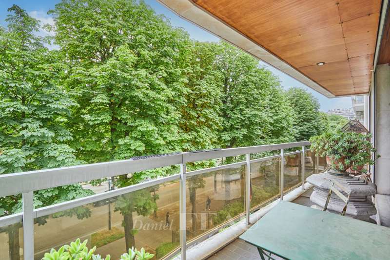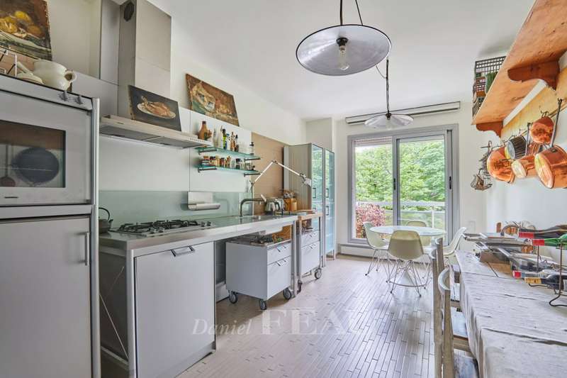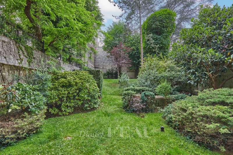 Avenue Raphael/Ranelagh Gardens. This bright and peaceful 215 sqm apartment on the 3rd floor of a luxurious relatively recent building is in very good condition. It includes an entrance hall, a spacious living/reception room opening onto a 14 sqm balcony, a dining room and kitchen overlooking Ranelagh Gardens and enjoying a view of the Eiffel Tower, three bedrooms overlooking a peaceful garden, two bathrooms with a wc, a dressing room, a utility room and a separate wc. With a 14 sqm staff bedroom in the apartment and a cellar. Two lock-up garages (one single, one double) may be acquired at extra cost.