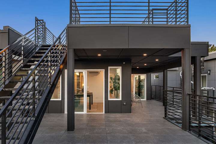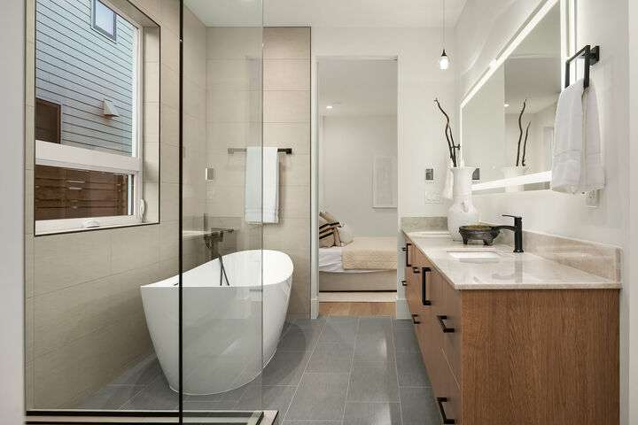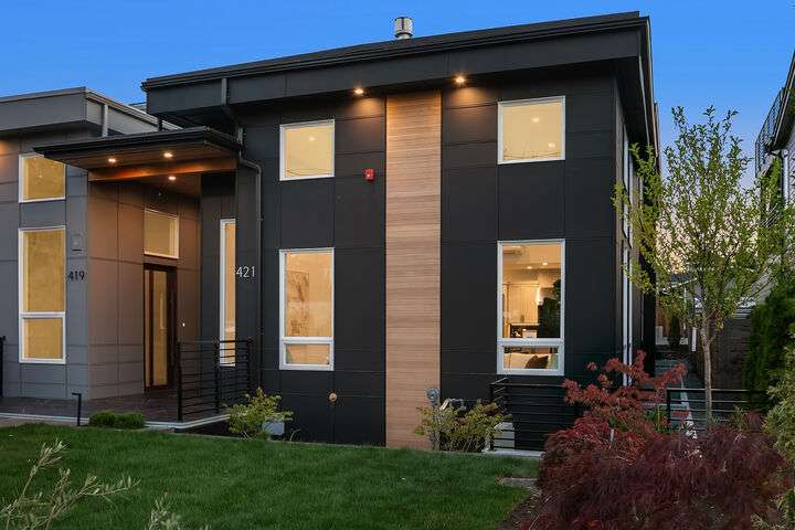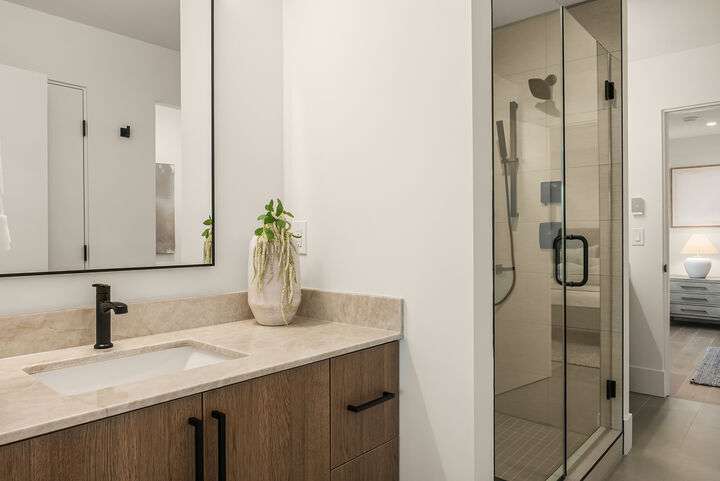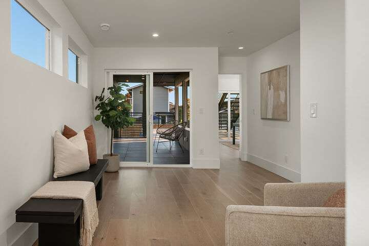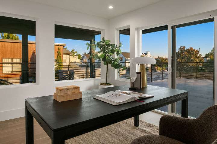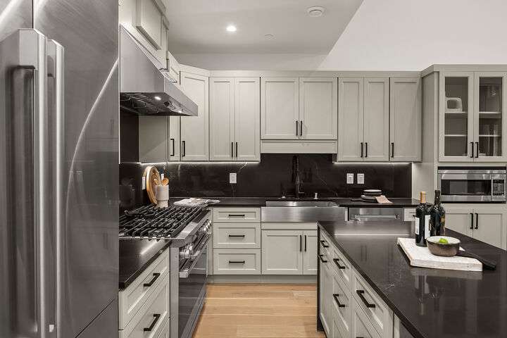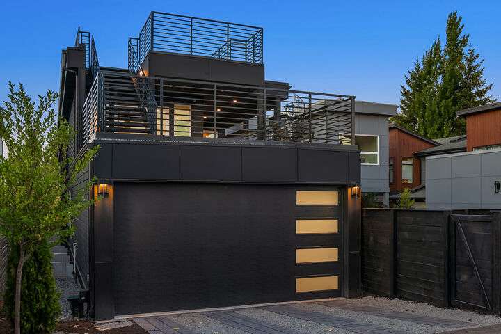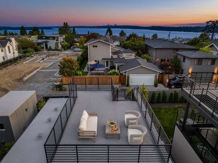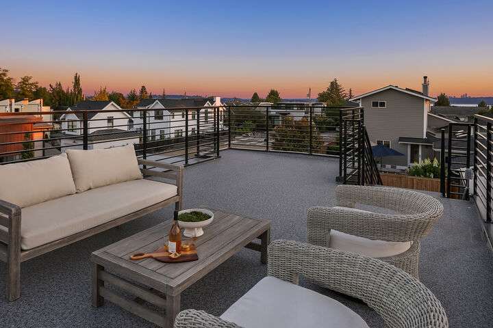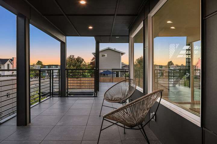 Located in coveted West of Market, this newly completed home blends luxury and comfort just steps to downtown, parks, and the waterfront. Upon entering, you are greeted by a stunning great room with 16-ft vaulted ceilings and a floor-to-ceiling fireplace. The spacious kitchen features a double waterfall quartz island, full slab backsplash, Dacor professional-grade appliances, and walk-in pantry. Main floor primary suite with lavish 5-piece spa bath featuring quartzite countertops, heated floors, and large soaking tub. Upper level features 2 additional bedrooms, and access to 600sf of entertainment deck including a 400sf rooftop with panoramic views of lake and mountains. No shared walls, fully fenced yard, A/C, 2-car garage w EV charger.