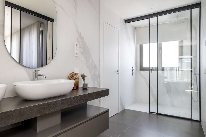 Inside the apartment, spacious open-plan layouts are complemented by floor-to-ceiling windows, allowing natural light to flood the interior. Kitchens are delivered with sleek, built-in cabinetry and high-end appliances. Climate control is managed through an energy-efficient aerothermal system with underfloor heating and ducted air-conditioning, ensuring comfort year-round.