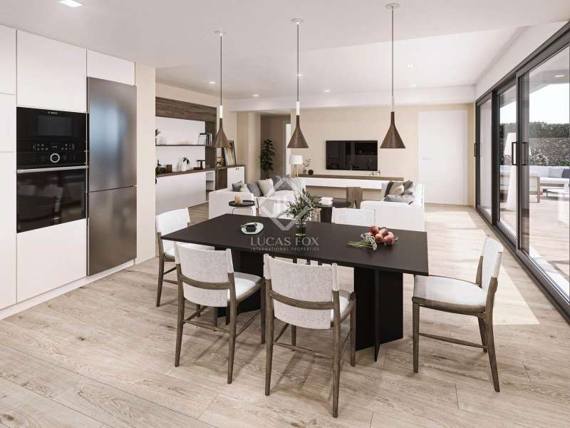 Lucas Fox presents this new build development that is offered in a private and exclusive residential area surrounded by pine forests with views of the Mediterranean Sea. The complex offers a large communal area with a swimming pool, a gourmet room, an outdoor gym, a solarium and green areas. This newly built villa has a surface area of 194 m² on a 372 m² plot , close to the only golf course on the island in Son Parc, Es Mercadal. The property has a beautiful garden area with a swimming pool and a private garage with a bathroom. It is distributed on two floors. The ground floor has a double bedroom with a built-in wardrobe , a bathroom and a spacious living-dining room with an open integrated kitchen, all with large windows, allowing plenty of natural light to enter. From this space, you can also go out to a beautiful porch, as well as the garden, the pool and the garage. The first floor has three double bedrooms with built-in wardrobes and a private bathroom with access to a large terrace. The property has high quality finishes. The kitchen is furnished with contemporary furniture from the Porcelanosa brand, a compact countertop and equipped with Bosch appliances : induction hob, hood, oven and microwave. The houses will have a hot-cold air conditioning system and a home automation system. An ideal property for families, either as a first or second residence in a privileged development . The development has a building license and will begin in January 2023. Its completion is expected in September 2024. Contact us for more information or to arrange a visit.