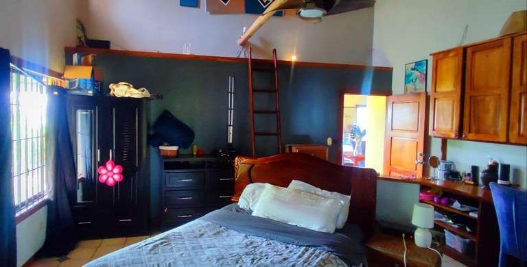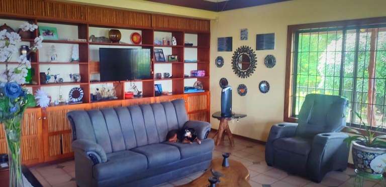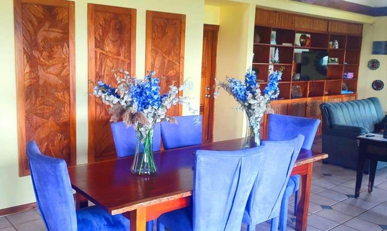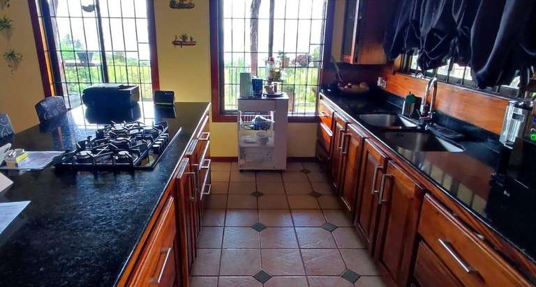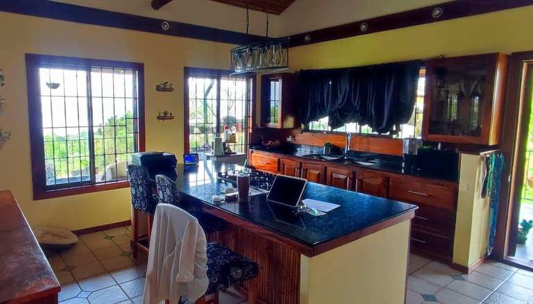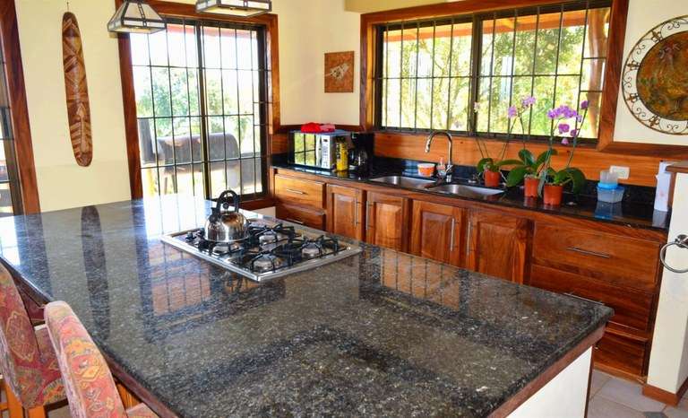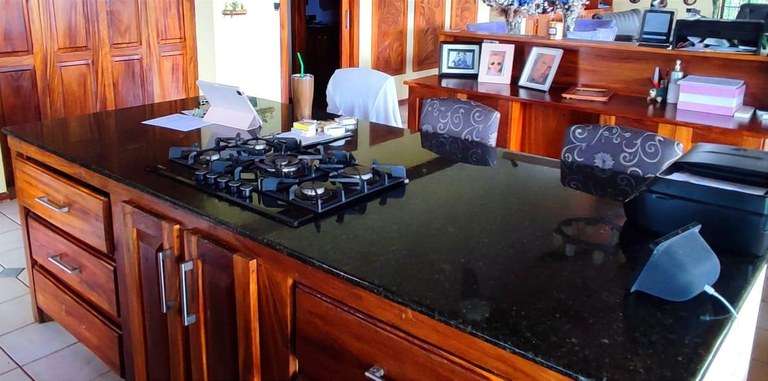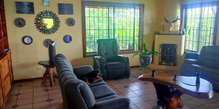 The home spans approximately 380 m2 (4,000 sq. ft.) of total construction and is offered fully furnished and move-in ready. Inside, a spacious open-plan living and dining area welcomes you with soaring ceilings crafted from cana brava and exposed hardwood beams. The interiors are enriched with hand-carved native wood finishes that bring warmth, character, and a distinctly Costa Rican charm to every space. The well-appointed kitchen features granite countertops, modern appliances, and ample cabinetry, making it both functional and inviting for cooking and entertaining.