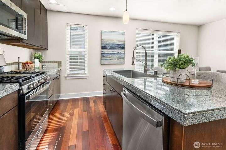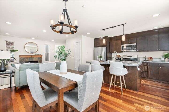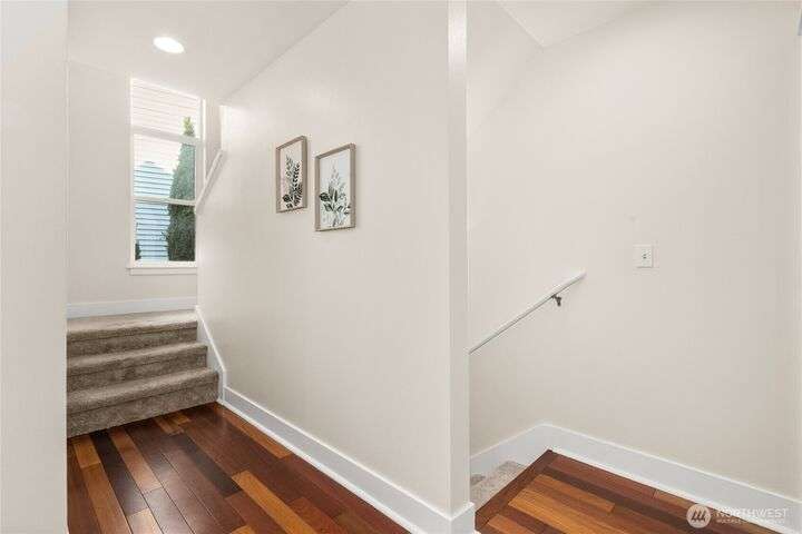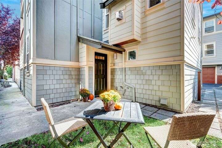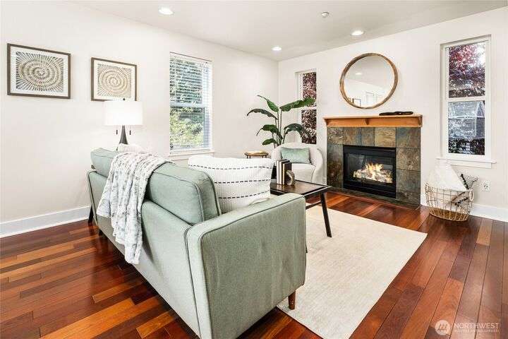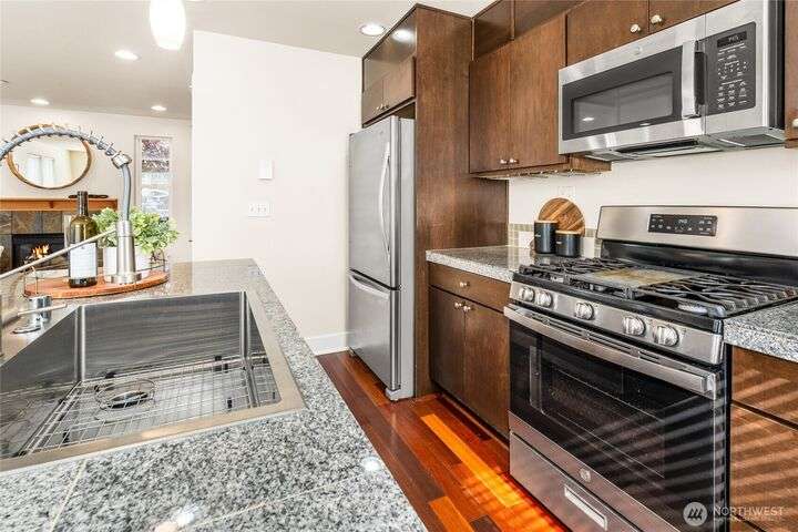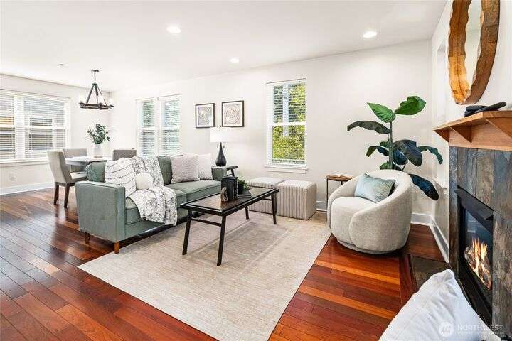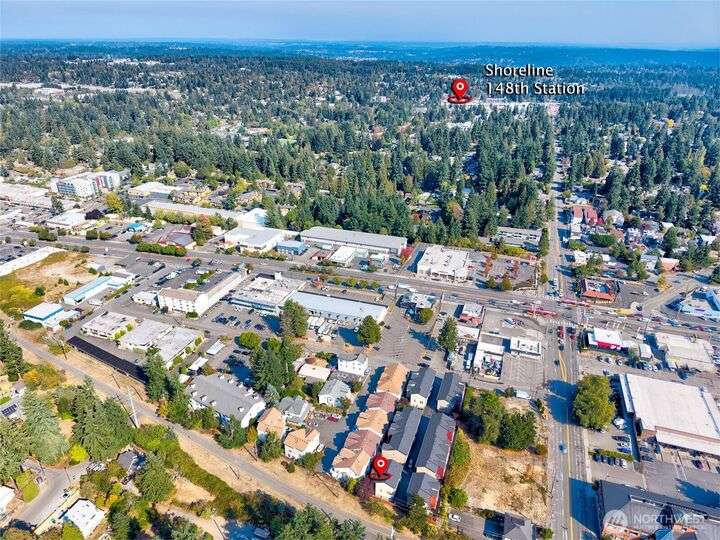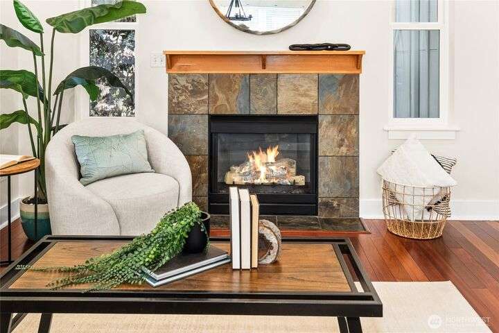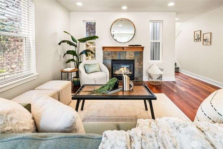 This bright and welcoming townhome feels like a sanctuary amidst an urban hub. Inside, relax in an open concept living area, staying cozy by the fire while a pot of soup simmers in the oversized kitchen. Stunning hardwoods give timeless style to the space. Head upstairs to the bedrooms – both quiet and with peek-a-boos of the Shoreline treetops. Closets galore on this level! This end-unit also has an ultra-spacious 2-car garage-storage needs are covered. A serene private yard offers easy access to the Interurban Trail which leads to bus routes, grocery stores, parks, cafes, Pagliacci Pizza and more! 148th St light rail provides even more transport options. New roof in 2021. Located in a coveted school district, too. This may be the one!