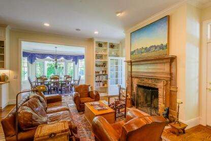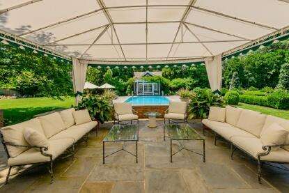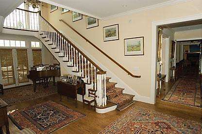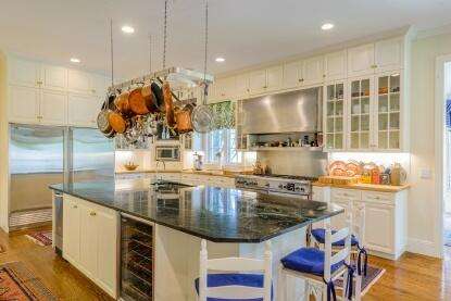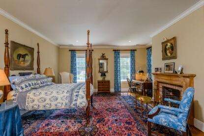 This elegant 3.3+-acre Bridgehampton-south estate with gracious Pospisil-designed residence, Hollander-designed landscape with apple tree grove, set behind a private gate and high-hedges is all but invisible from the Village road. The winding gravel drive leads to a parking court in front of the stately 9000 sq.ft. traditional six-bedroom, 6.5-bathroom home with center hall flanked by two large wings. The entry hall with main staircase presents views through full-length windows to one of several outdoor patios, and the 50'x20' heated Gunite pool and pool house. The residence gallery leads on one side past the formal dining room with fireplace and outdoor patio, butler's pantry with access to outdoor dining, to the oversized chef's kitchen with Subzero, Garland, and Bosch appliances, sitting area with fireplace that opens to a screened-in covered porch, and breakfast room with outdoor patio. The adjoining service wing includes two bedrooms, a bathroom, laundry room, service entry, and access to the attached three-car garage. The opposite end of the gallery leads to library with fireplace and full-height bay window doors onto a patio, a full bar with powder room, the formal full-width living room with fireplace and bay window doors onto a patio, and an adjoining office with fireplace. Upstairs, the master suite with double baths and walk-in-closets occupies one wing, and is accompanied by three more guest suites and a bonus room. A back staircase descends to the kitchen. The enormous basement houses the residence mechanicals, large wine cellar, and finished media/theater room. The outdoor spaces complement the main house with poolside sound system, all weather tennis court, trellised dining pavilion, boxwood and rose gardens, and landscapers' shed.