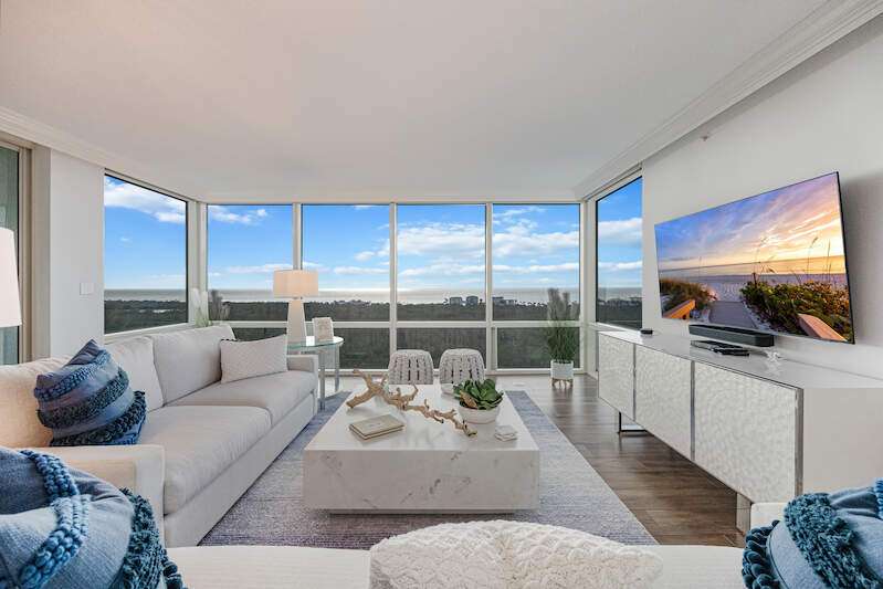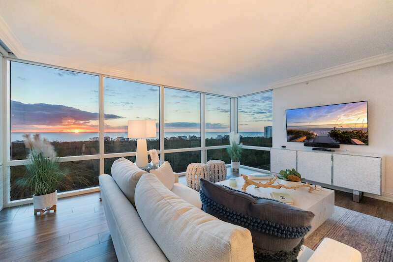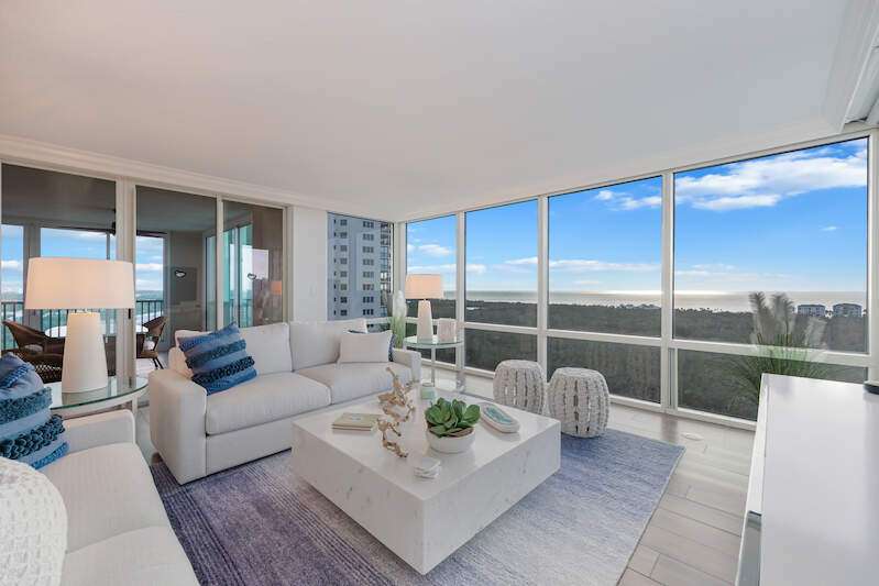 Absolutely mesmerizing are the expansive views of the gulf and nature areas, The Claridge is a spectacular building that honors the art deco era. The unit is move in ready with a custom decor and beautiful detailing. An open floor plan makes for relaxing living and entertaining. The spacious primary suite enjoys separation from the 2nd bedroom and den, which is currently used as an additional bedroom. This unit has many additional benefits including custom built-ins, air-conditioned storage unit that is on the same floor, and 2 garage parking spaces. Plus, the purchaser of this unit will have the first right to purchase cabana #10, which has been fabulously remodeled for an additional $500,000. The Claridge building has diligently followed all the new high-rise requirements and is extremely well managed by the board and staff. You'll love the wonderful environment within the building and the unparalleled amenities of Pelican Bay!